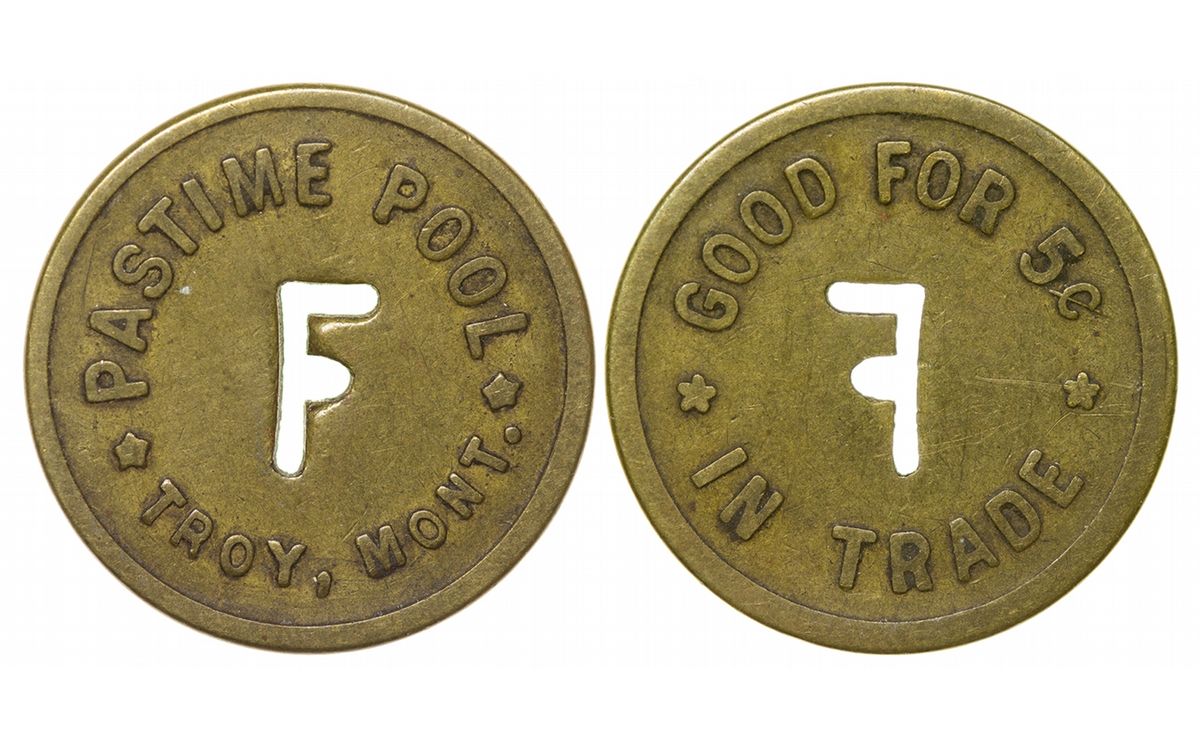 c1900 Pastime Pool / Troy, Mont. // GF 5c / IT. Cut-out "F" at center. Round, brass, 21mm. VF. - HKA#65605