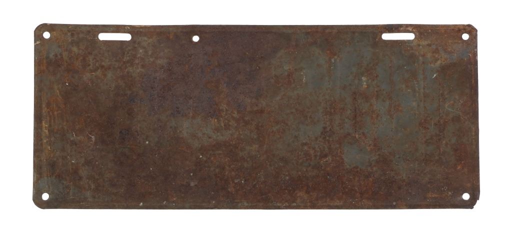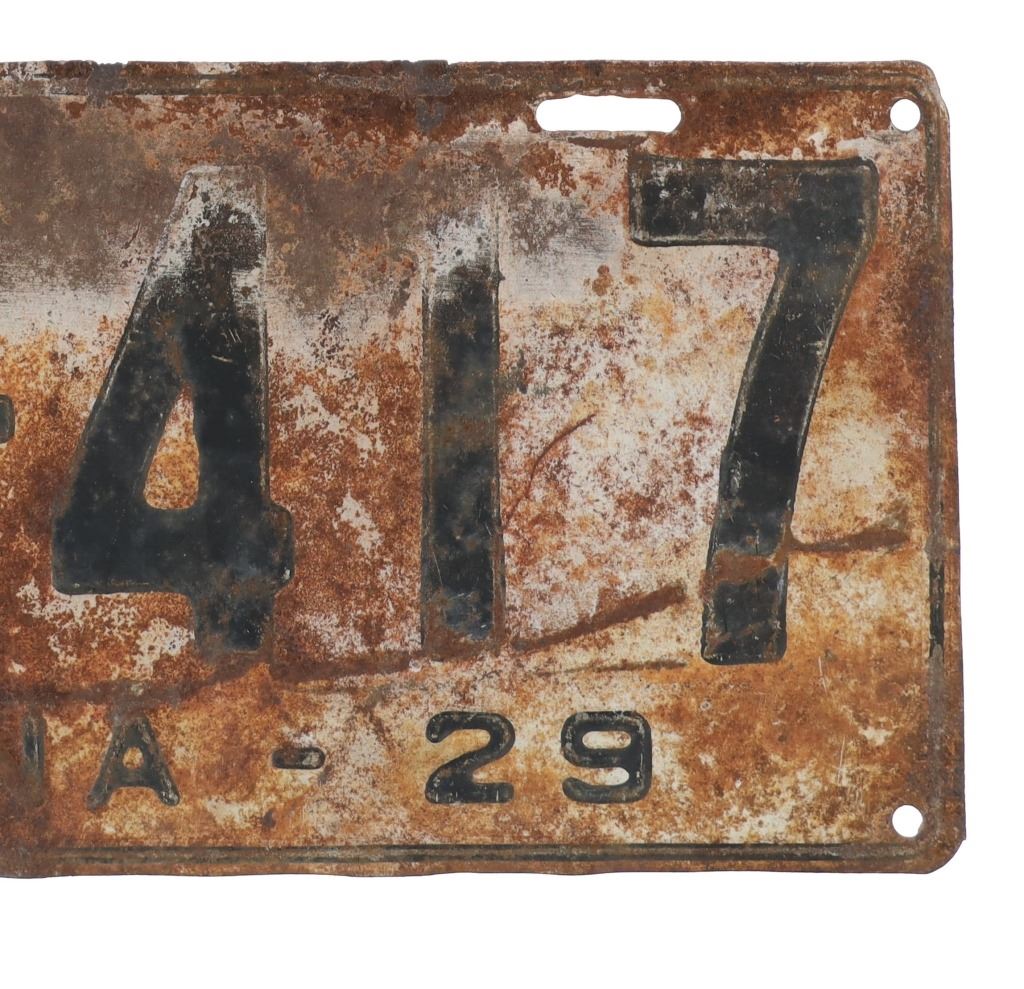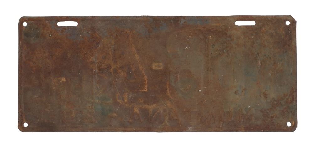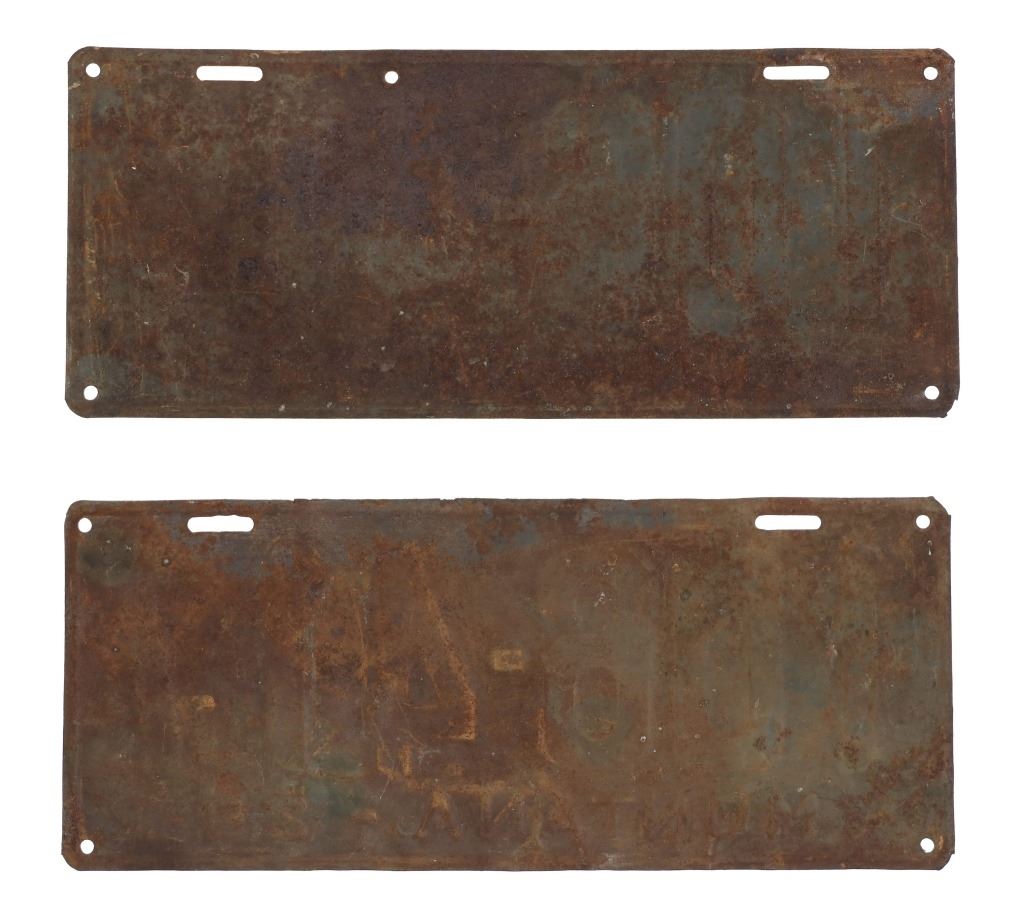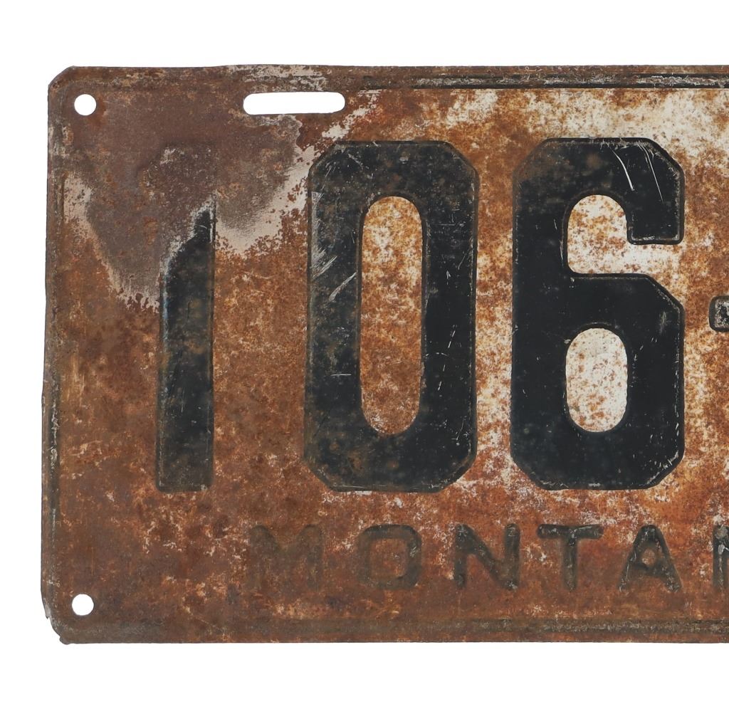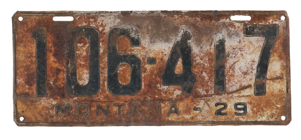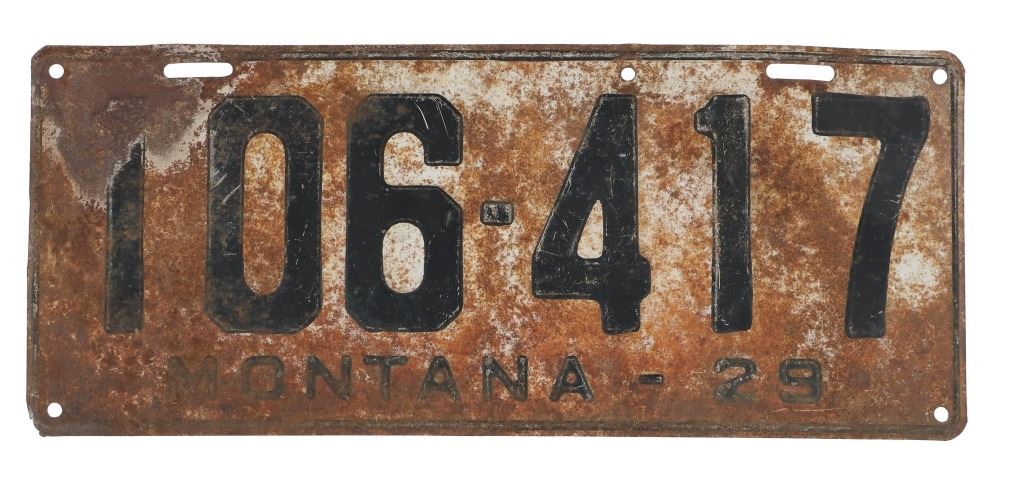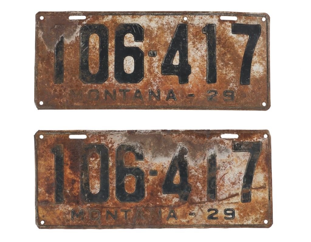 Featured in this lot is this Montana prison-made license plate, circa 1929. This pair of license plates features a off white coloration with heavy oxidation and black lettering that reads as follows: 106-417 - Montana - 29. The first prison-made plates were issued in 1928, and “MONTANA” was spelled out; plates prior to 1928 were manufactured out of state. The condition of this this pair of Montana license plates shows some oxidation to the license plates and some wear tot he plate with bending due to age but otherwise shows no obvious signs of damage. The measurements of these pair of license plates is 5 5/8" x 13 1/2". The collective weight of these plates is U6oz.