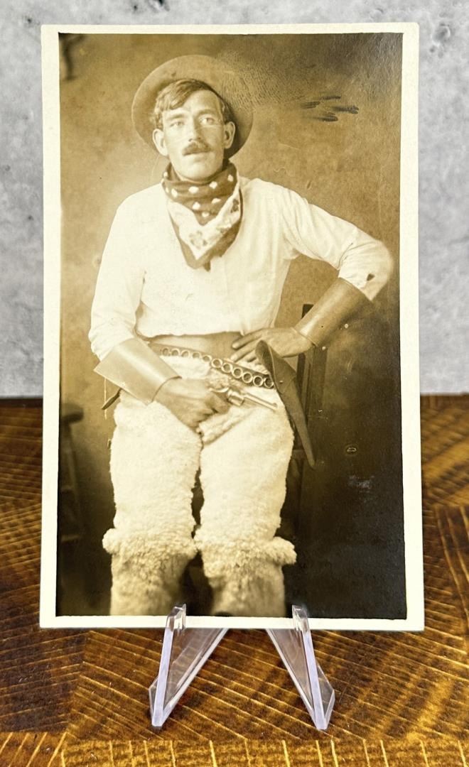 Wearing cuffs, wooly chaps, and a pistol belt. 5 1/2" by 3 1/4".