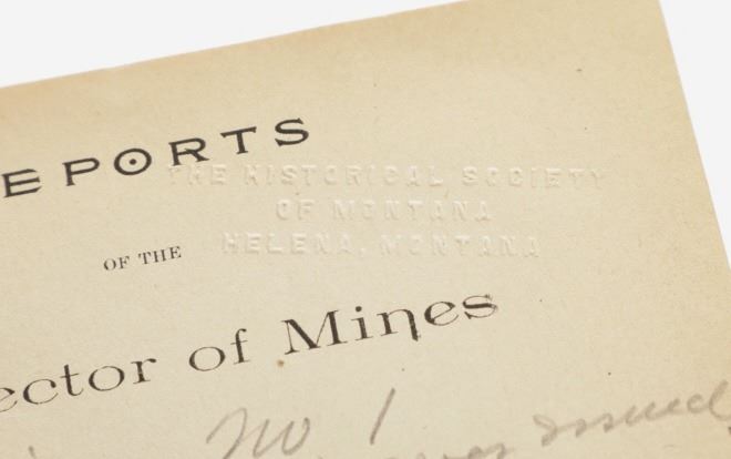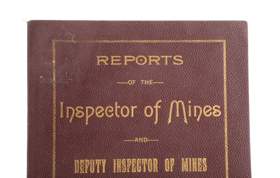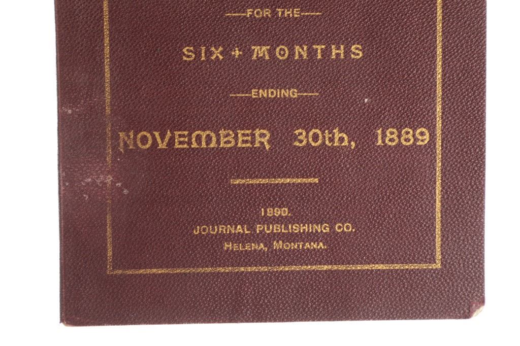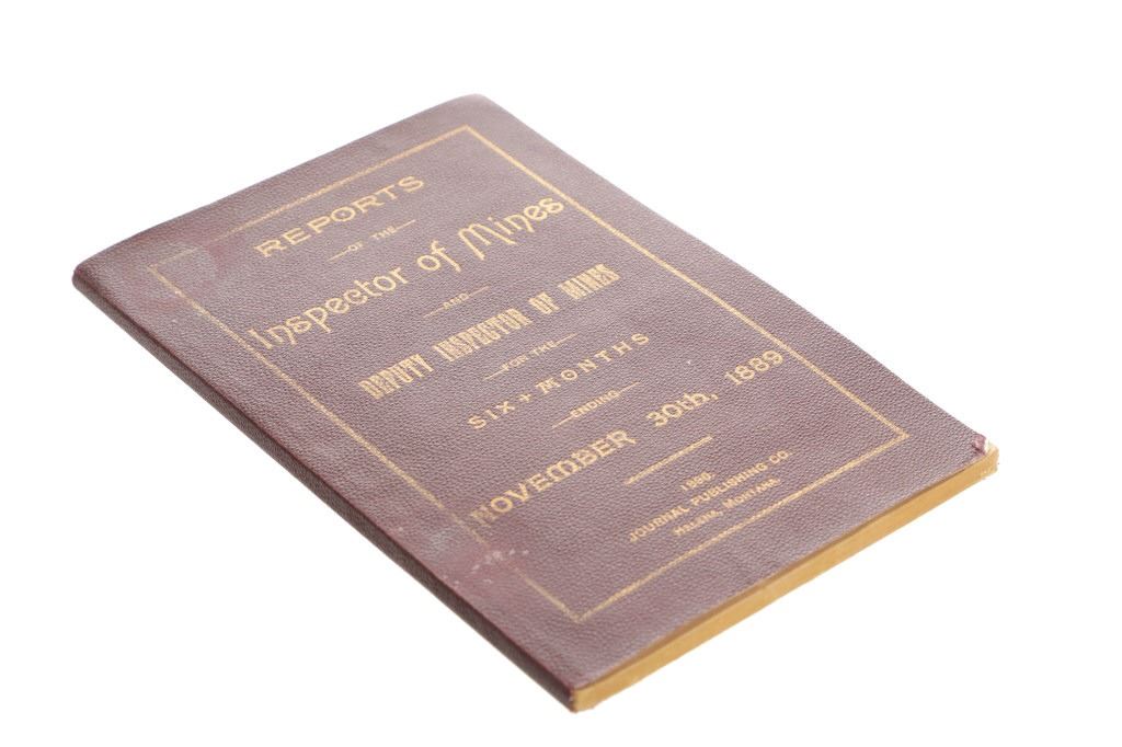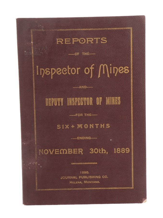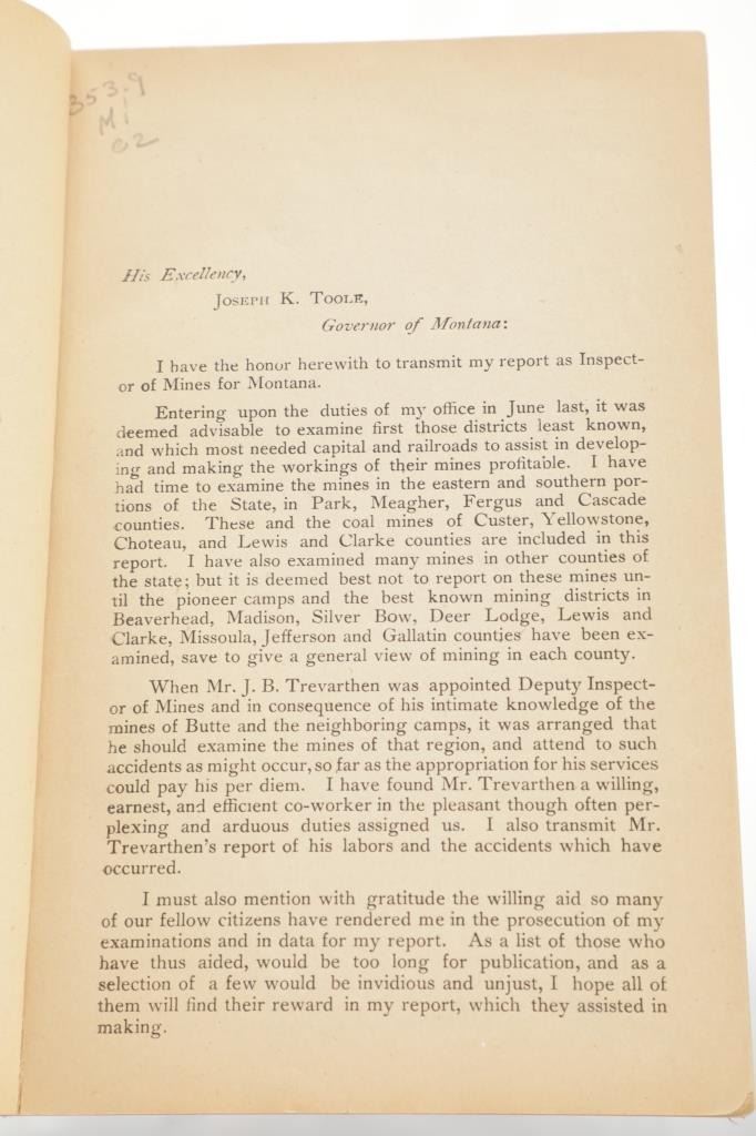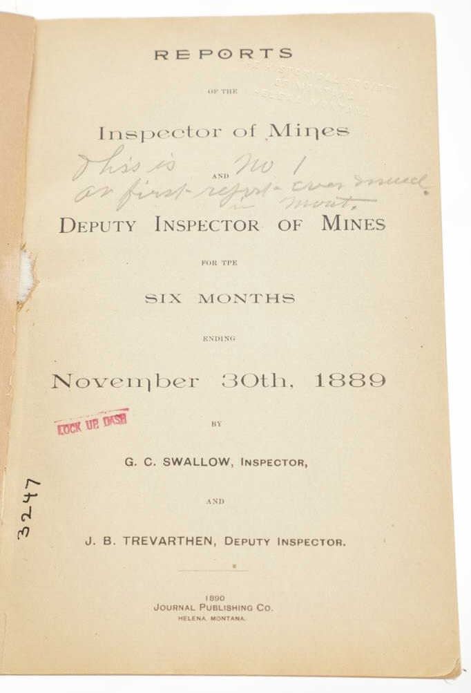 Featured in this lot is this Reports of the Inspector of Mines and Deputy Inspector of the Mines for the Six Months Ending November 30th, 1889 by G.C. Swallow, Inspector and J.B. Trevarthen, Deputy Inspector. The condition of this inspector report is good with a slight repair to the inside spine of the book but otherwise in good overall condition. The measurements of this book are 8 1/2" x 5 3/4".