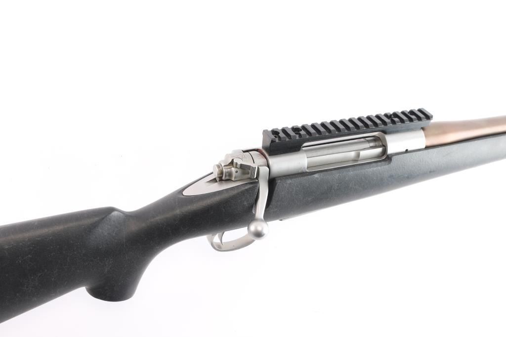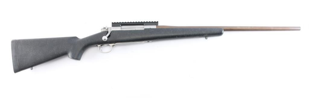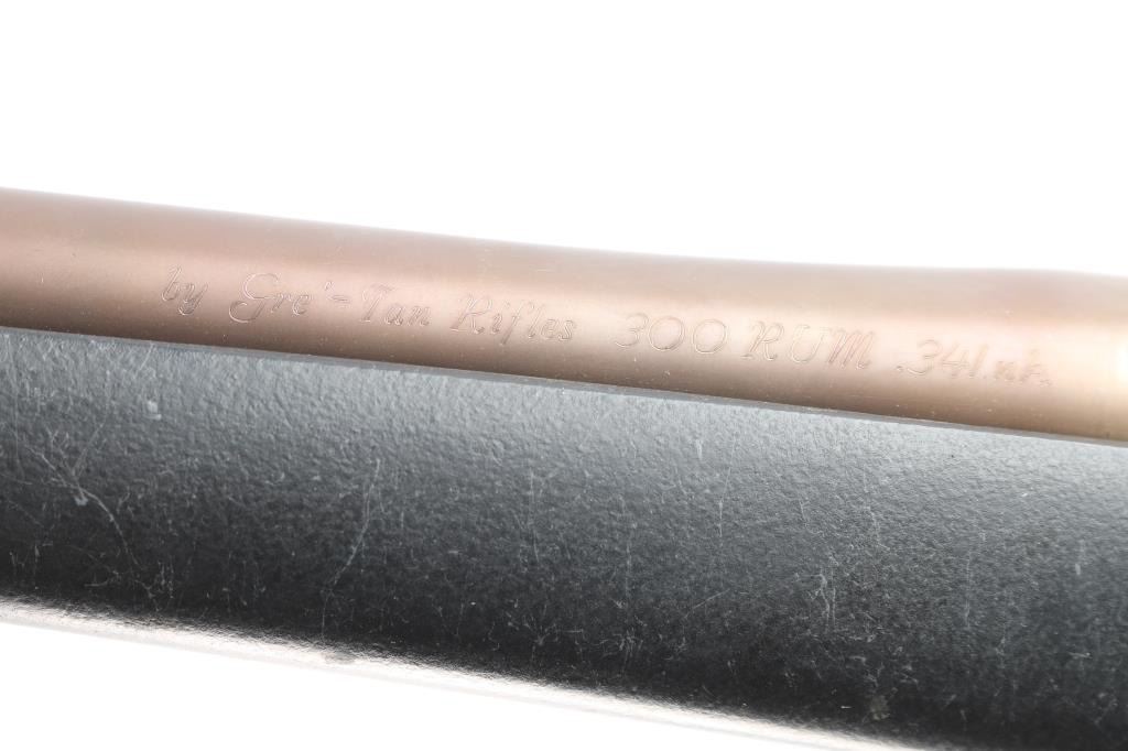American made bolt action center fire rifle chambered for .300 Remington Ultra Magnum. Based on a pre-64 Model 70 action, this is an innovative controlled feed design that allows the shooter to push-feed, or single-load a round if desired. Rifle features a 23" bronze tapered barrel with a recessed crown, no provisions for iron sights, receiver mounted picatinney rail, smooth curved trigger, left receiver mounted serrated bolt release, turned down bolt handle, serrated swing type bolt mounted three position manual safety, and fixed magazine with a hinged floorplate. The black composite furniture consists of a smooth semi-pistol gripped shoulder stock, smooth forend, sling studs in the shoulder stock and forend, and a H-S Precision black solid rubber recoil pad with a black spacer. The receiver is a billet satin finished 416 stainless steel unit, and the rifle may have been built by Gre'-Tan. The original bronze metal finish retained is approximately 98% with light blemishes and scratches. The stainless receiver finish is also excellent with 98% of the finish remaining and only light scratches. The metal displays no rust, or metal deformation. Bore is bright with strong rifling, and the composite furniture is in excellent condition with minimal edge wear on the grip, residue on the forend, and a couple small scratches. The action is smooth and crisp.