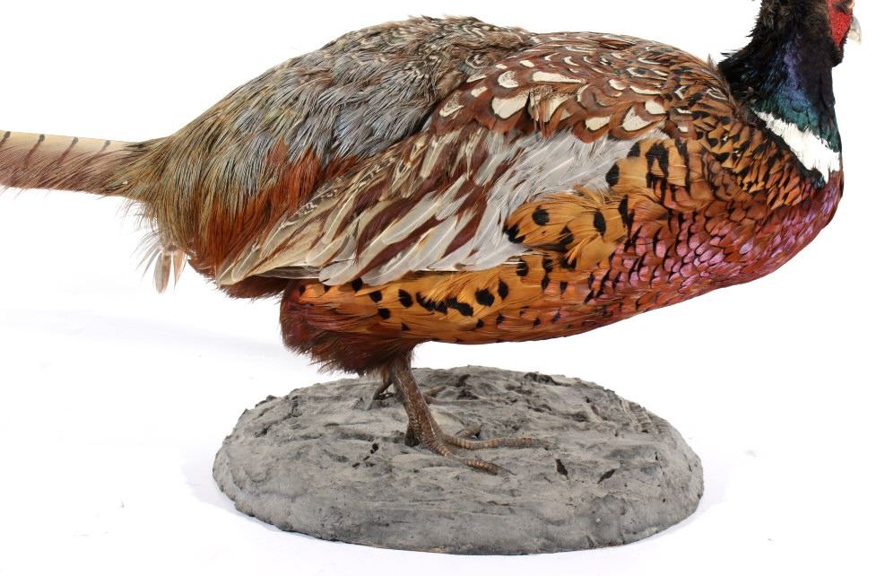 Offered in this lot we have a Montana ring neck pheasant taxidermy standing mount. The mount shows a male ring neck pheasant crafted by a professional taxidermist as its shown standing on the ground. The pheasant shows its natural plumage with long tail feathers. The pheasant is in good condition overall. The piece measures 31" long by 9 1/2" tall and 8 1/2" wide at the base.