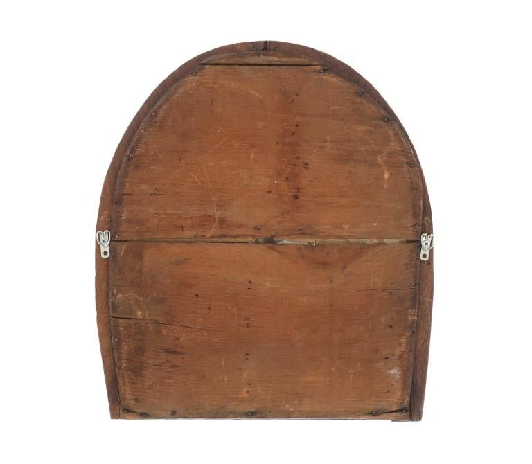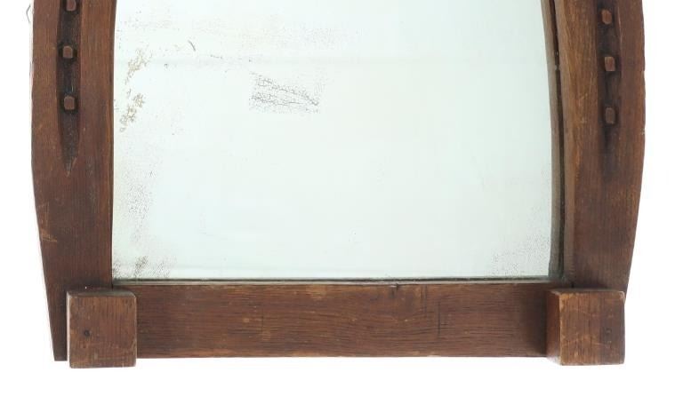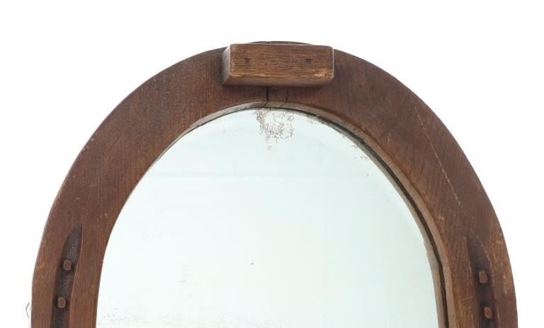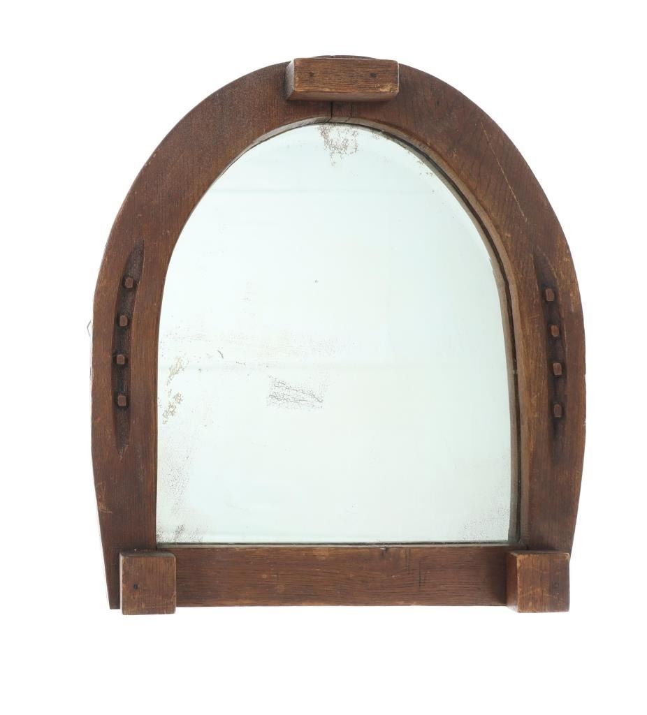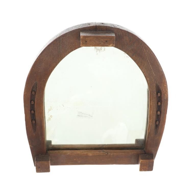 Featured in this lot is this Montana rustic farmhouse horseshoe mirror circa 1950's. The mirror features a wonderfully and professionally crafted wooden and mirror construction. The mirror shows shows an upside down horseshoe frame with realistic carvings for the shoe nails and toe tabs with heel locks shown on the top and the bottom of the horseshoes. The condition of this horse shoe mirror is well preserved with some fading to the mirror in areas from age but otherwise shows well preserved condition. The measurements of this mirror 16 1/2" x 15" x 2 1/2". The collective weight of this mirror is 6lb 12oz.