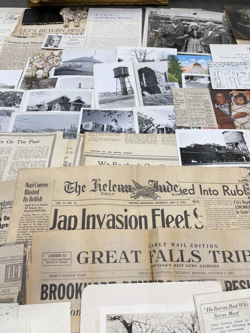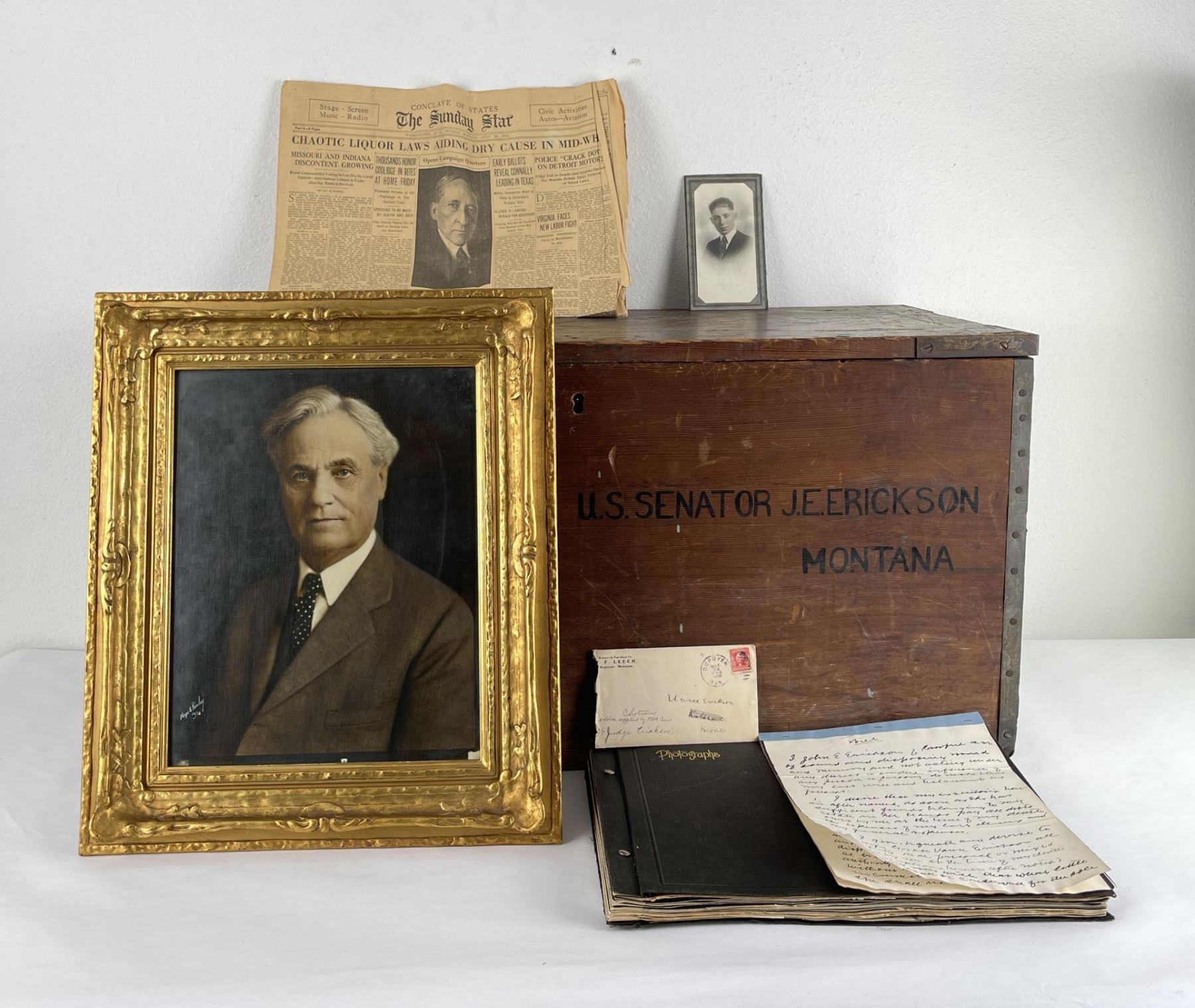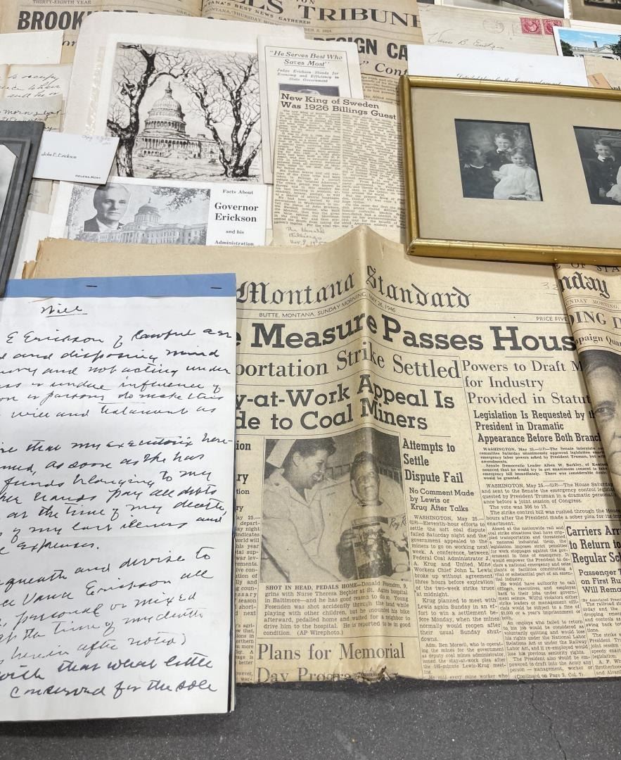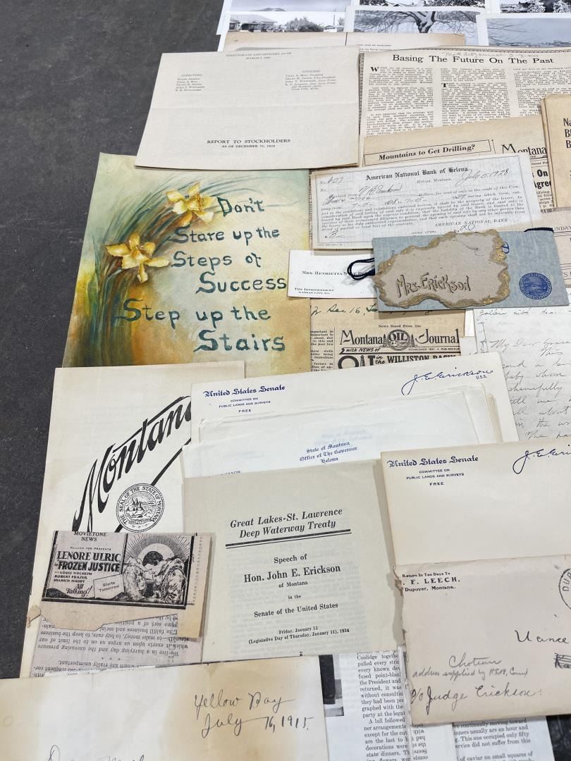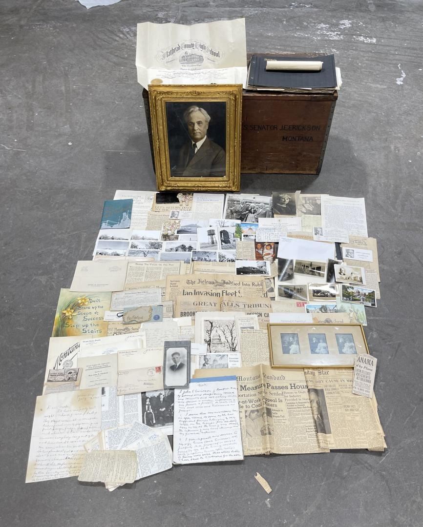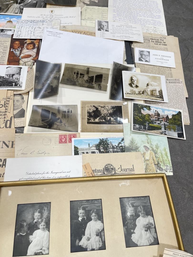 Phenomenal grouping of personal effects. All belonged to John E. Erickson. Includes Newspapers, Letters, Documents, Certificates, Photo Album, Last Will, and his original stagecoach trunk. John Edward Erickson (March 14, 1863 – May 25, 1946) was an American politician of the Democratic Party from Montana. He served as the eighth Governor of Montana and as a United States Senator. Erickson was admitted to the Kansas state bar in 1891. He moved to Great Falls, Montana in 1892 and later to Choteau, Montana, where he continued practicing law. He served as county attorney of Teton County from 1897 to 1905, then judge of the eleventh judicial district of Montana from 1905 to 1915. He resumed the practice of law at Kalispell, Montana in 1916.[7] A Democrat, Erickson was elected in 1924 as the eighth Governor of Montana. He won reelection in 1928, and again in 1932, making him the only governor elected to three terms. He served from January 4, 1925 to March 13, 1933. During his tenure, a new state income tax was sanctioned, a fund to financially equalize impoverished rural schools was established, a gasoline tax was implemented, a new banking law was authorized, and a tax on mining profits was initiated. On March 13, 1933, Erickson resigned as governor whereupon Frank Cooney, formerly Erickson's lieutenant governor and now the acting governor, appointed Erickson to the United States Senate to fill the vacancy caused by the death of Thomas J. Walsh. Although on the face of it, this appears to have been a rather brazen attempt on Erickson's part to establish himself in the Senate, Montana Senator Burton K. Wheeler tells a different story in his autobiography. Apparently Montana's Democratic National Committeeman, J. Bruce Kremer, was certain to be appointed to Walsh's seat. Walsh had very much disliked Kremer and worried that Kremer would succeed him if he (Walsh) accepted Franklin D. Roosevelt's appointment to his cabinet, as Attorney General (which Walsh had, at the time of his death). After Walsh's untimely demise, his daughter Genevieve Gudger asked Senator Wheeler if he would intercede with Governor Erickson to stop Kremer's appointment. As Wheeler also disliked Kremer, he agreed to do so. In Wheeler's telling, it was he who talked a reluctant Erickson into getting himself appointed. Erickson ran in 1934 to fill the remainder of Walsh's Senate term, but finished third in the primary, behind James E. Murray, who went on to win the special general election, and James F. O'Connor. He continued to serve in the Senate through November 6, 1934, the day that Murray was elected, at which point he resigned in favor of Murray, in order to give Murray seniority rights over other freshman senators, who didn't start their terms until 1935. Following his return from the Senate, Erickson practiced law in Helena, Montana, until his death.