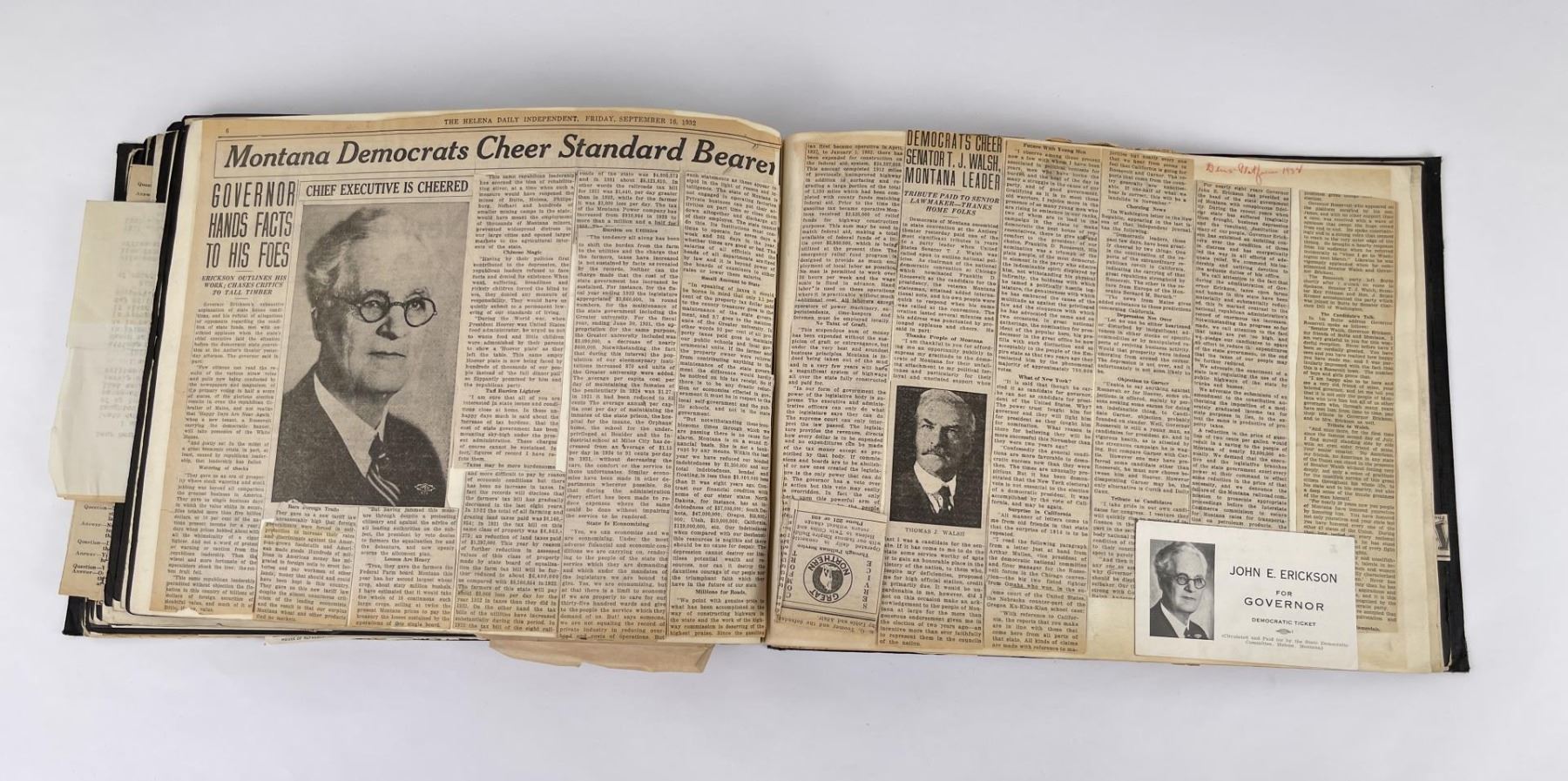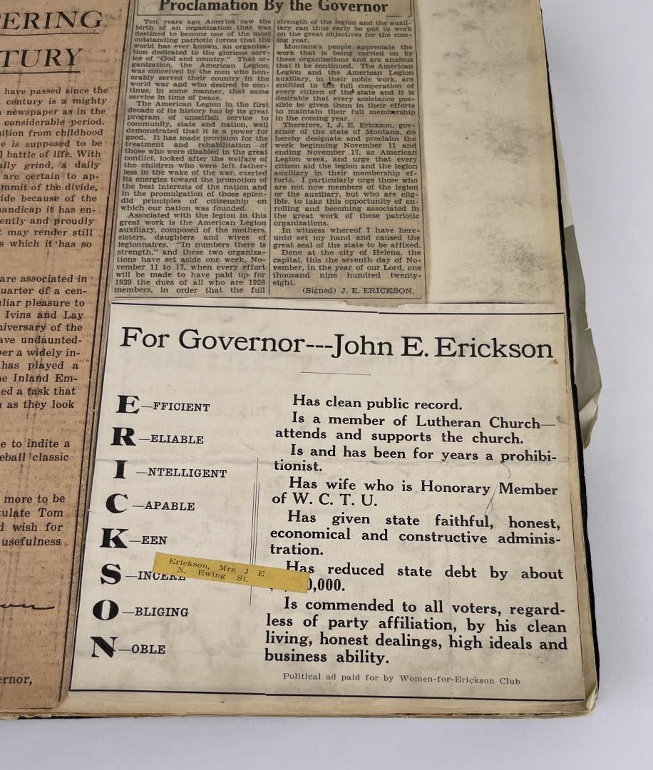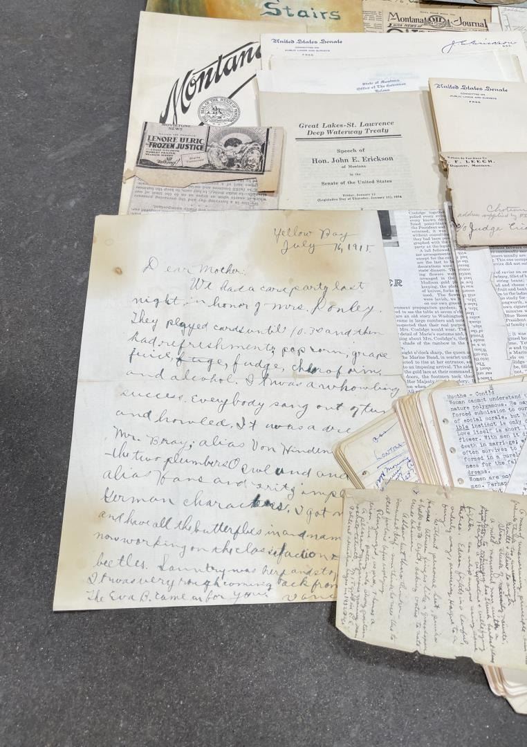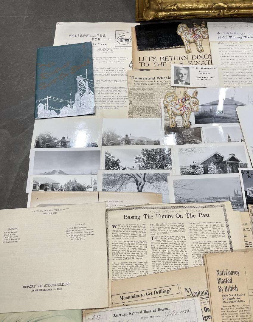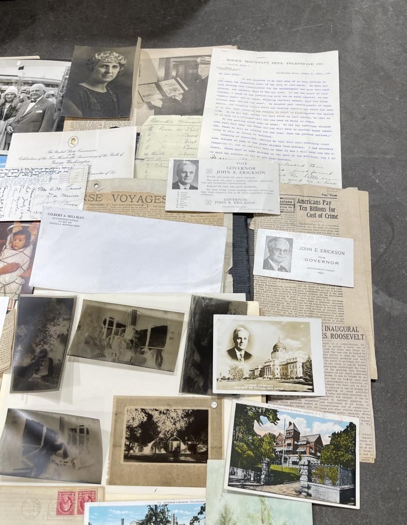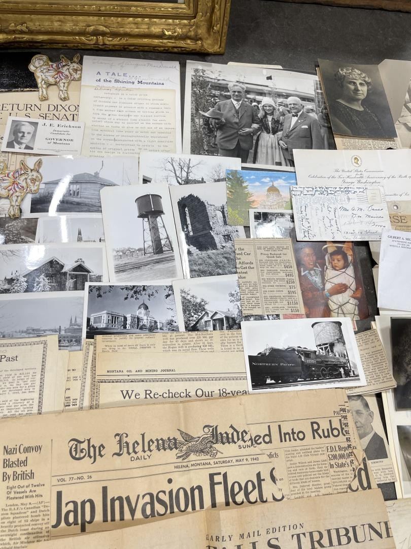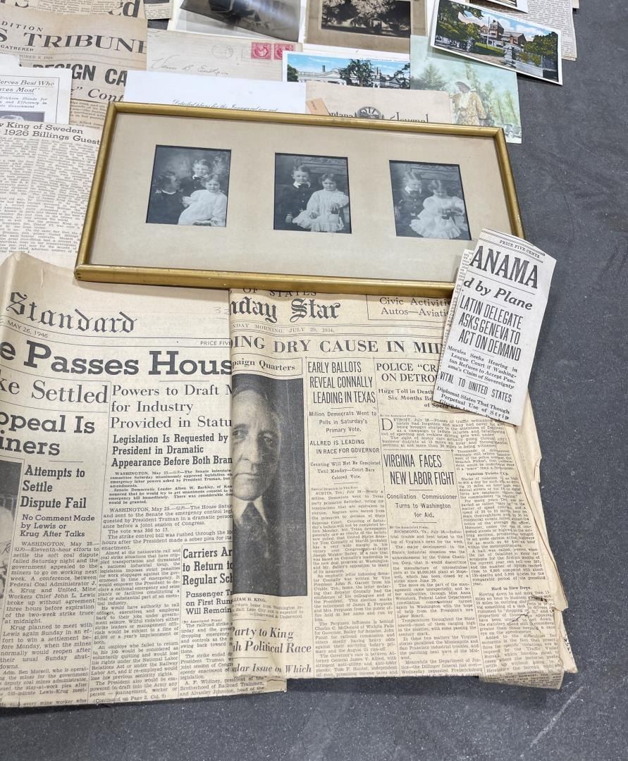 Phenomenal grouping of personal effects. All belonged to John E. Erickson. Includes Newspapers, Letters, Documents, Certificates, Photo Album, Last Will, and his original stagecoach trunk. John Edward Erickson (March 14, 1863 – May 25, 1946) was an American politician of the Democratic Party from Montana. He served as the eighth Governor of Montana and as a United States Senator. Erickson was admitted to the Kansas state bar in 1891. He moved to Great Falls, Montana in 1892 and later to Choteau, Montana, where he continued practicing law. He served as county attorney of Teton County from 1897 to 1905, then judge of the eleventh judicial district of Montana from 1905 to 1915. He resumed the practice of law at Kalispell, Montana in 1916.[7] A Democrat, Erickson was elected in 1924 as the eighth Governor of Montana. He won reelection in 1928, and again in 1932, making him the only governor elected to three terms. He served from January 4, 1925 to March 13, 1933. During his tenure, a new state income tax was sanctioned, a fund to financially equalize impoverished rural schools was established, a gasoline tax was implemented, a new banking law was authorized, and a tax on mining profits was initiated. On March 13, 1933, Erickson resigned as governor whereupon Frank Cooney, formerly Erickson's lieutenant governor and now the acting governor, appointed Erickson to the United States Senate to fill the vacancy caused by the death of Thomas J. Walsh. Although on the face of it, this appears to have been a rather brazen attempt on Erickson's part to establish himself in the Senate, Montana Senator Burton K. Wheeler tells a different story in his autobiography. Apparently Montana's Democratic National Committeeman, J. Bruce Kremer, was certain to be appointed to Walsh's seat. Walsh had very much disliked Kremer and worried that Kremer would succeed him if he (Walsh) accepted Franklin D. Roosevelt's appointment to his cabinet, as Attorney General (which Walsh had, at the time of his death). After Walsh's untimely demise, his daughter Genevieve Gudger asked Senator Wheeler if he would intercede with Governor Erickson to stop Kremer's appointment. As Wheeler also disliked Kremer, he agreed to do so. In Wheeler's telling, it was he who talked a reluctant Erickson into getting himself appointed. Erickson ran in 1934 to fill the remainder of Walsh's Senate term, but finished third in the primary, behind James E. Murray, who went on to win the special general election, and James F. O'Connor. He continued to serve in the Senate through November 6, 1934, the day that Murray was elected, at which point he resigned in favor of Murray, in order to give Murray seniority rights over other freshman senators, who didn't start their terms until 1935. Following his return from the Senate, Erickson practiced law in Helena, Montana, until his death.
