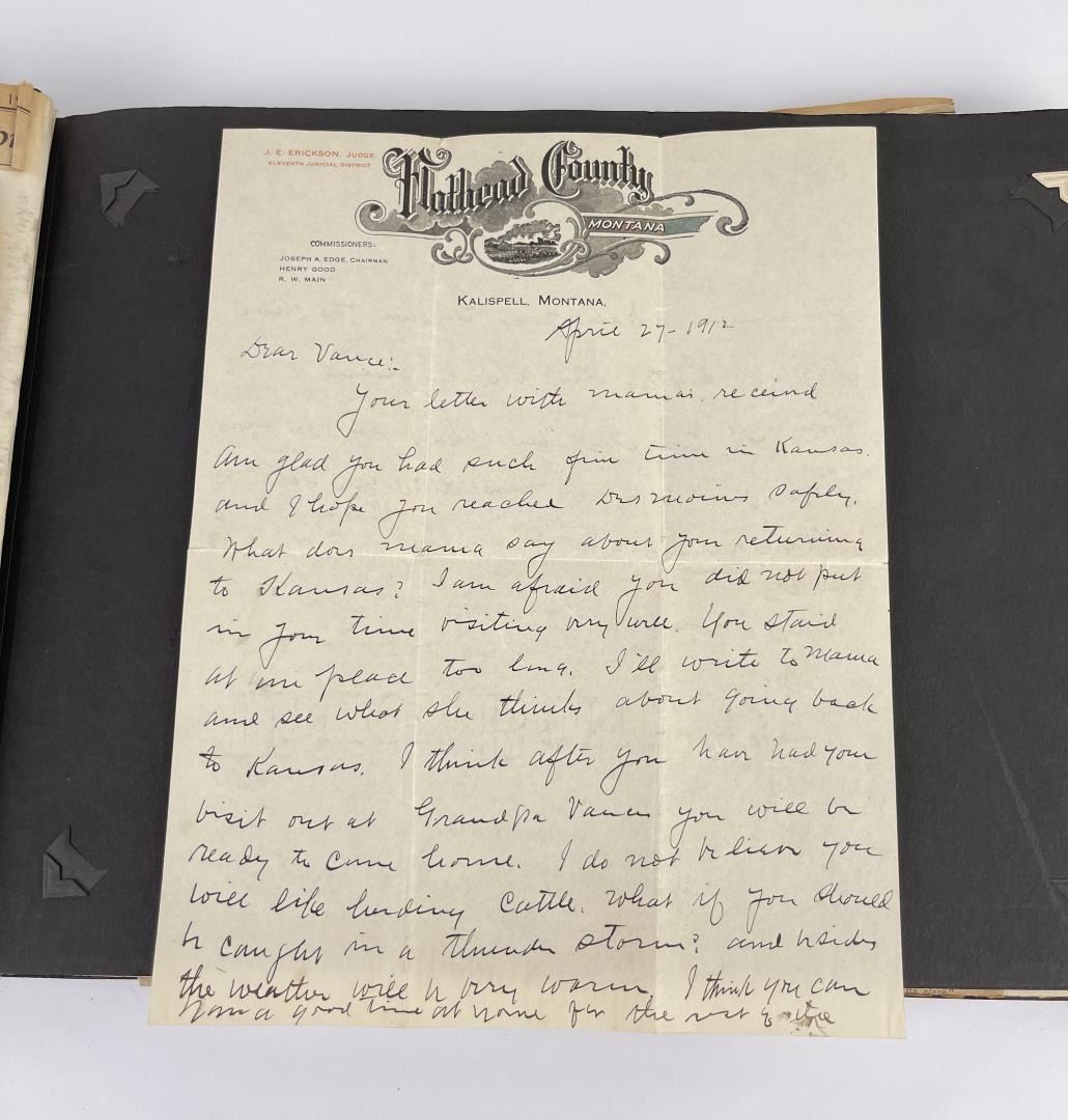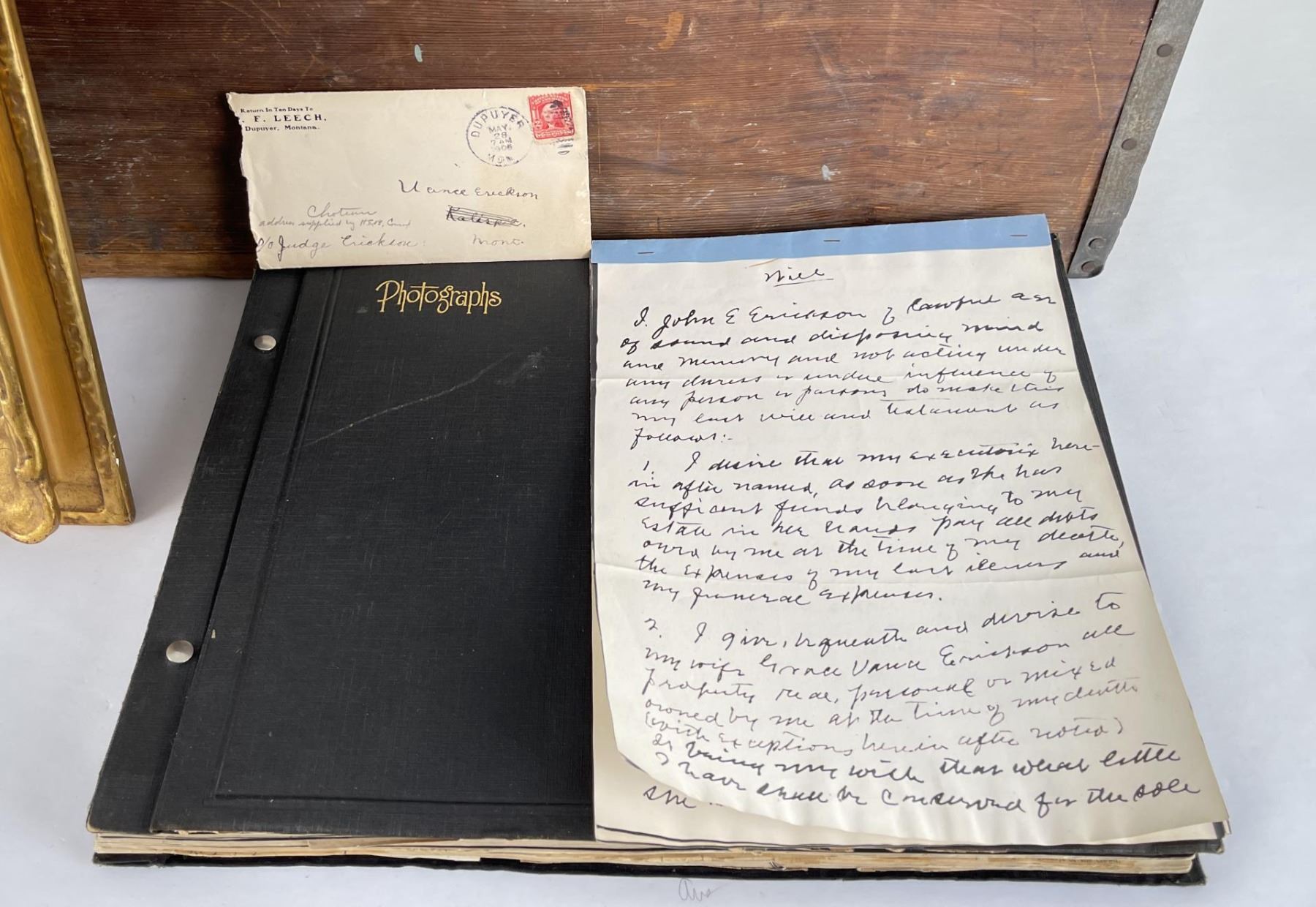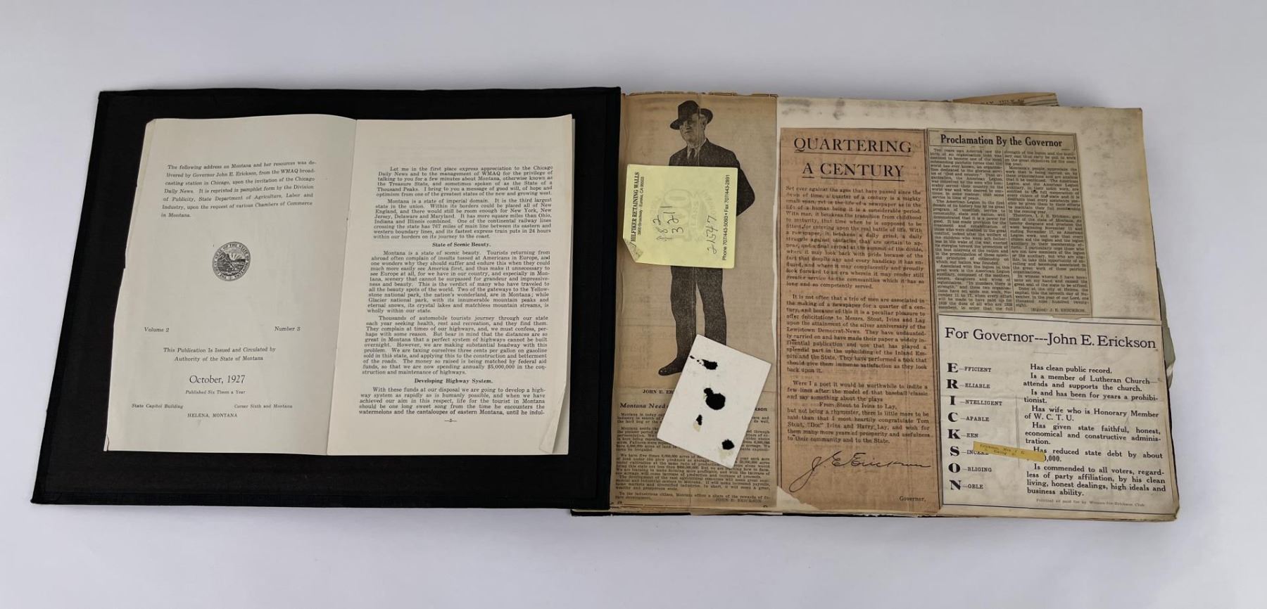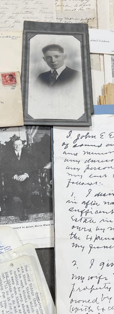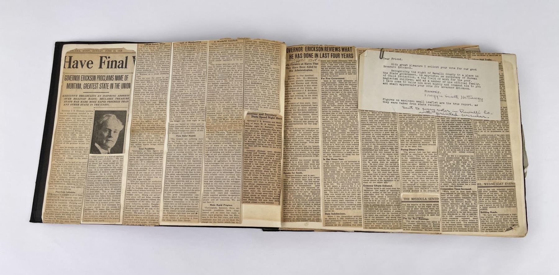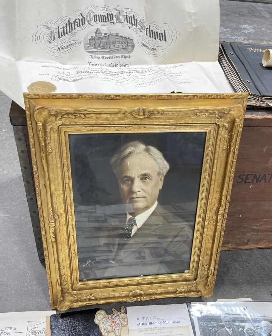Phenomenal grouping of personal effects. All belonged to John E. Erickson. Includes Newspapers, Letters, Documents, Certificates, Photo Album, Last Will, and his original stagecoach trunk. John Edward Erickson (March 14, 1863 – May 25, 1946) was an American politician of the Democratic Party from Montana. He served as the eighth Governor of Montana and as a United States Senator. Erickson was admitted to the Kansas state bar in 1891. He moved to Great Falls, Montana in 1892 and later to Choteau, Montana, where he continued practicing law. He served as county attorney of Teton County from 1897 to 1905, then judge of the eleventh judicial district of Montana from 1905 to 1915. He resumed the practice of law at Kalispell, Montana in 1916.[7] A Democrat, Erickson was elected in 1924 as the eighth Governor of Montana. He won reelection in 1928, and again in 1932, making him the only governor elected to three terms. He served from January 4, 1925 to March 13, 1933. During his tenure, a new state income tax was sanctioned, a fund to financially equalize impoverished rural schools was established, a gasoline tax was implemented, a new banking law was authorized, and a tax on mining profits was initiated. On March 13, 1933, Erickson resigned as governor whereupon Frank Cooney, formerly Erickson's lieutenant governor and now the acting governor, appointed Erickson to the United States Senate to fill the vacancy caused by the death of Thomas J. Walsh. Although on the face of it, this appears to have been a rather brazen attempt on Erickson's part to establish himself in the Senate, Montana Senator Burton K. Wheeler tells a different story in his autobiography. Apparently Montana's Democratic National Committeeman, J. Bruce Kremer, was certain to be appointed to Walsh's seat. Walsh had very much disliked Kremer and worried that Kremer would succeed him if he (Walsh) accepted Franklin D. Roosevelt's appointment to his cabinet, as Attorney General (which Walsh had, at the time of his death). After Walsh's untimely demise, his daughter Genevieve Gudger asked Senator Wheeler if he would intercede with Governor Erickson to stop Kremer's appointment. As Wheeler also disliked Kremer, he agreed to do so. In Wheeler's telling, it was he who talked a reluctant Erickson into getting himself appointed. Erickson ran in 1934 to fill the remainder of Walsh's Senate term, but finished third in the primary, behind James E. Murray, who went on to win the special general election, and James F. O'Connor. He continued to serve in the Senate through November 6, 1934, the day that Murray was elected, at which point he resigned in favor of Murray, in order to give Murray seniority rights over other freshman senators, who didn't start their terms until 1935. Following his return from the Senate, Erickson practiced law in Helena, Montana, until his death.