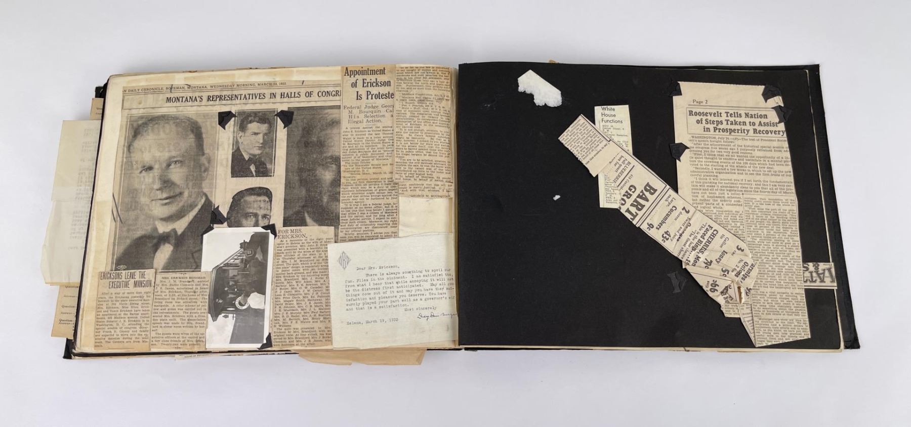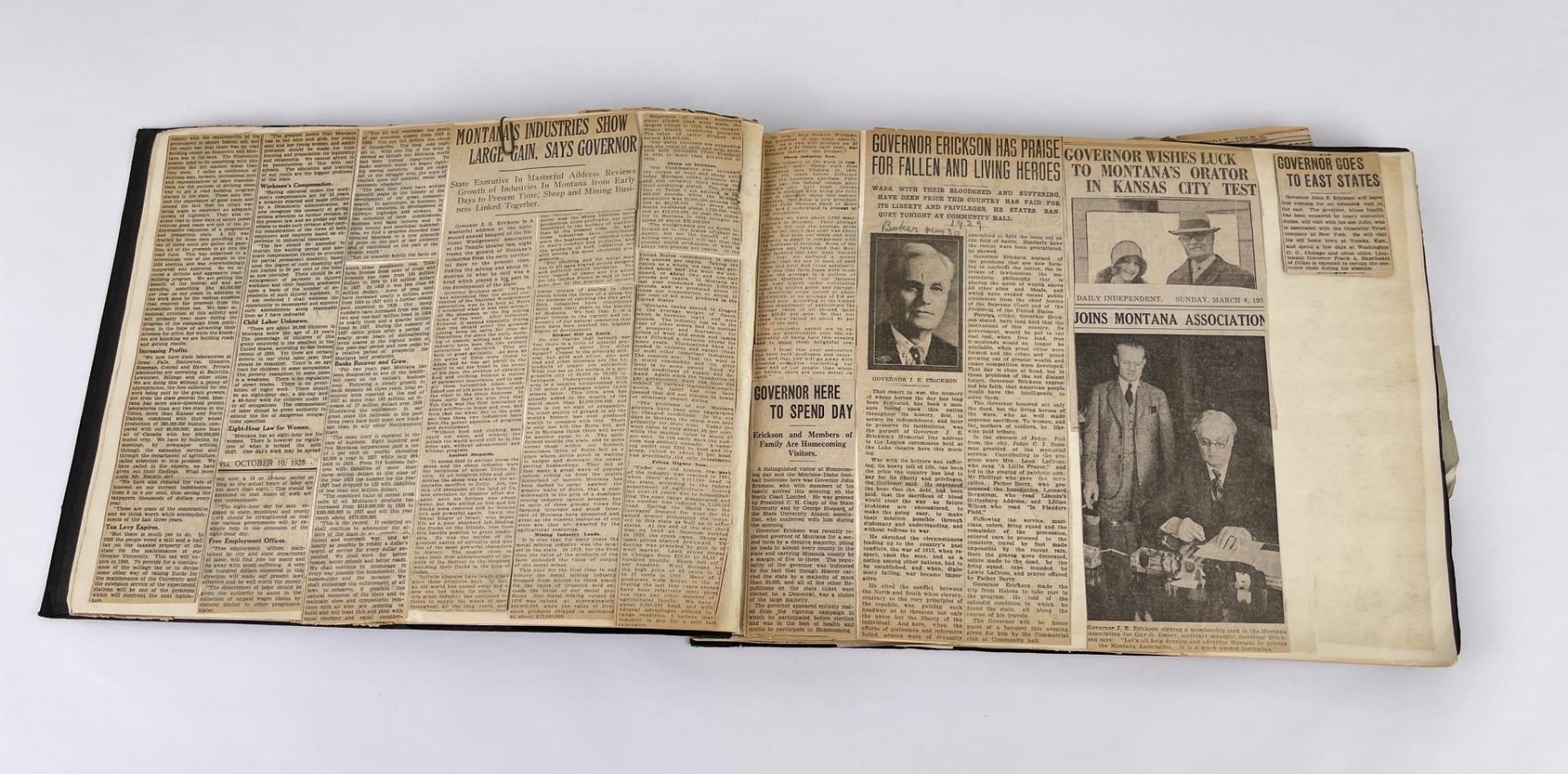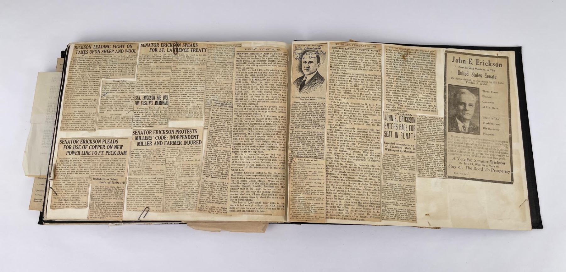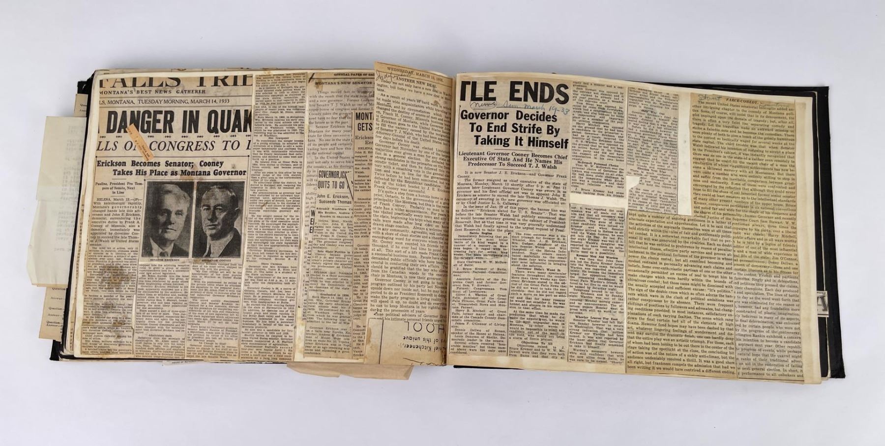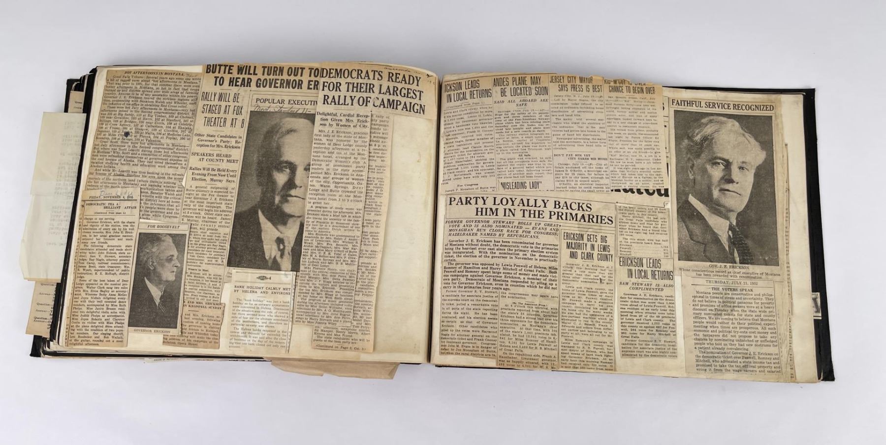 Phenomenal grouping of personal effects. All belonged to John E. Erickson. Includes Newspapers, Letters, Documents, Certificates, Photo Album, Last Will, and his original stagecoach trunk. John Edward Erickson (March 14, 1863 – May 25, 1946) was an American politician of the Democratic Party from Montana. He served as the eighth Governor of Montana and as a United States Senator. Erickson was admitted to the Kansas state bar in 1891. He moved to Great Falls, Montana in 1892 and later to Choteau, Montana, where he continued practicing law. He served as county attorney of Teton County from 1897 to 1905, then judge of the eleventh judicial district of Montana from 1905 to 1915. He resumed the practice of law at Kalispell, Montana in 1916.[7] A Democrat, Erickson was elected in 1924 as the eighth Governor of Montana. He won reelection in 1928, and again in 1932, making him the only governor elected to three terms. He served from January 4, 1925 to March 13, 1933. During his tenure, a new state income tax was sanctioned, a fund to financially equalize impoverished rural schools was established, a gasoline tax was implemented, a new banking law was authorized, and a tax on mining profits was initiated. On March 13, 1933, Erickson resigned as governor whereupon Frank Cooney, formerly Erickson's lieutenant governor and now the acting governor, appointed Erickson to the United States Senate to fill the vacancy caused by the death of Thomas J. Walsh. Although on the face of it, this appears to have been a rather brazen attempt on Erickson's part to establish himself in the Senate, Montana Senator Burton K. Wheeler tells a different story in his autobiography. Apparently Montana's Democratic National Committeeman, J. Bruce Kremer, was certain to be appointed to Walsh's seat. Walsh had very much disliked Kremer and worried that Kremer would succeed him if he (Walsh) accepted Franklin D. Roosevelt's appointment to his cabinet, as Attorney General (which Walsh had, at the time of his death). After Walsh's untimely demise, his daughter Genevieve Gudger asked Senator Wheeler if he would intercede with Governor Erickson to stop Kremer's appointment. As Wheeler also disliked Kremer, he agreed to do so. In Wheeler's telling, it was he who talked a reluctant Erickson into getting himself appointed. Erickson ran in 1934 to fill the remainder of Walsh's Senate term, but finished third in the primary, behind James E. Murray, who went on to win the special general election, and James F. O'Connor. He continued to serve in the Senate through November 6, 1934, the day that Murray was elected, at which point he resigned in favor of Murray, in order to give Murray seniority rights over other freshman senators, who didn't start their terms until 1935. Following his return from the Senate, Erickson practiced law in Helena, Montana, until his death.