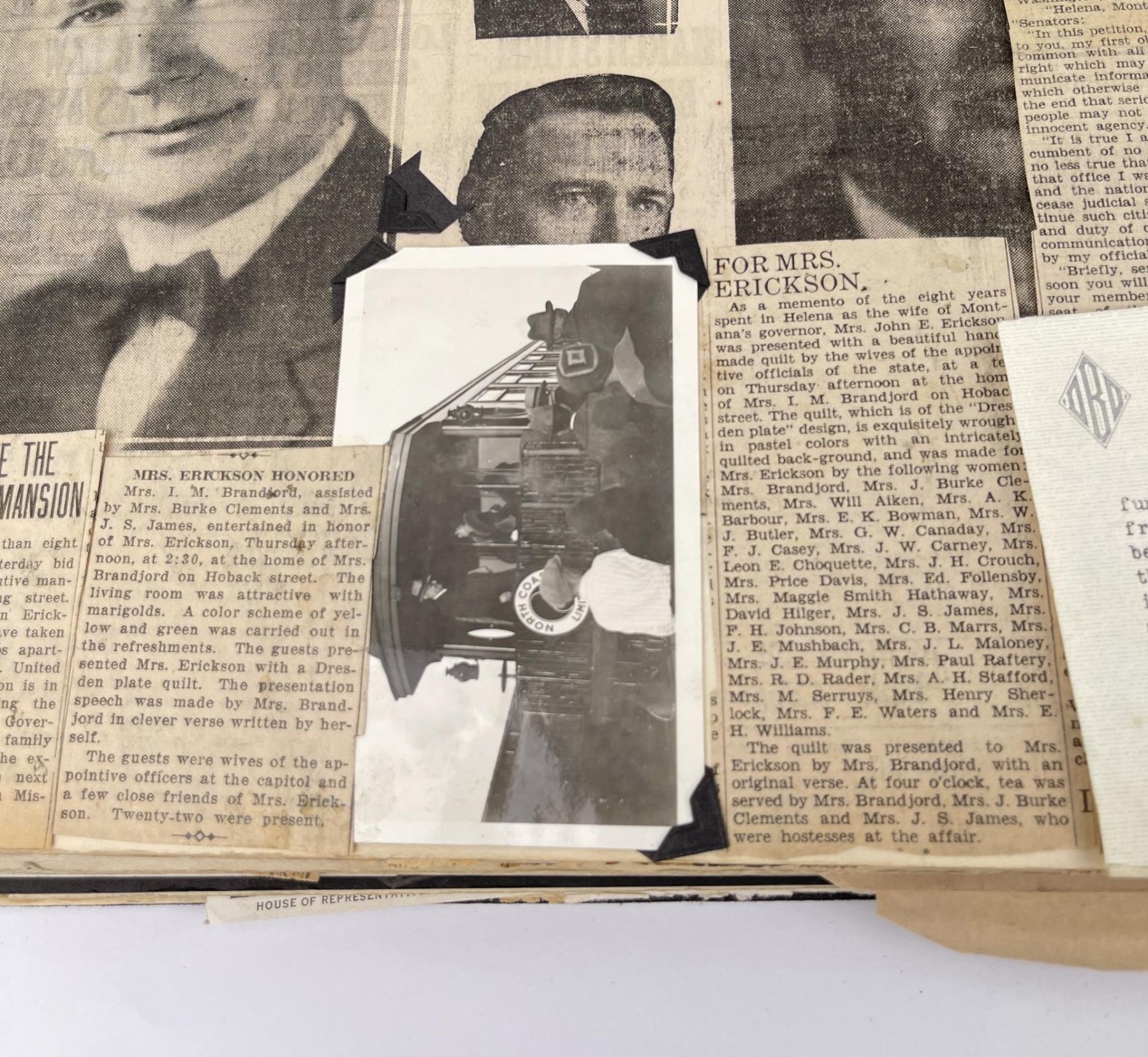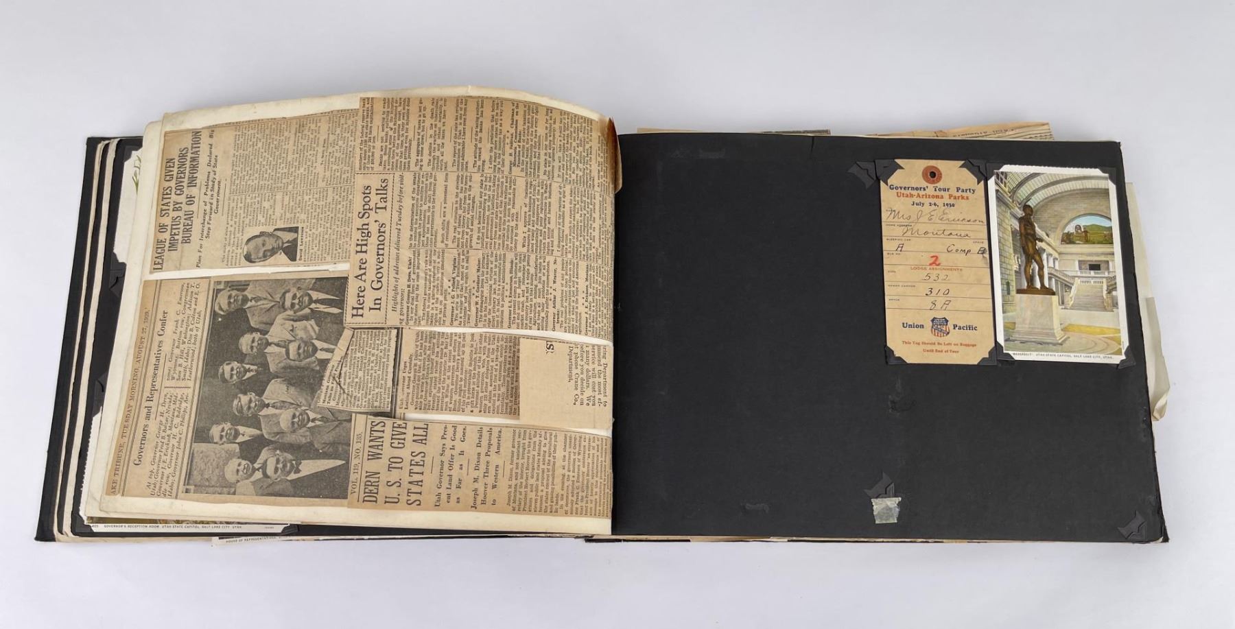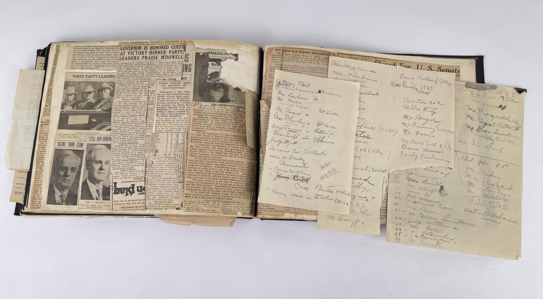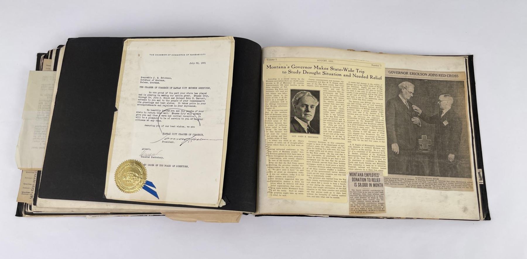 Phenomenal grouping of personal effects. All belonged to John E. Erickson. Includes Newspapers, Letters, Documents, Certificates, Photo Album, Last Will, and his original stagecoach trunk. John Edward Erickson (March 14, 1863 – May 25, 1946) was an American politician of the Democratic Party from Montana. He served as the eighth Governor of Montana and as a United States Senator. Erickson was admitted to the Kansas state bar in 1891. He moved to Great Falls, Montana in 1892 and later to Choteau, Montana, where he continued practicing law. He served as county attorney of Teton County from 1897 to 1905, then judge of the eleventh judicial district of Montana from 1905 to 1915. He resumed the practice of law at Kalispell, Montana in 1916.[7] A Democrat, Erickson was elected in 1924 as the eighth Governor of Montana. He won reelection in 1928, and again in 1932, making him the only governor elected to three terms. He served from January 4, 1925 to March 13, 1933. During his tenure, a new state income tax was sanctioned, a fund to financially equalize impoverished rural schools was established, a gasoline tax was implemented, a new banking law was authorized, and a tax on mining profits was initiated. On March 13, 1933, Erickson resigned as governor whereupon Frank Cooney, formerly Erickson's lieutenant governor and now the acting governor, appointed Erickson to the United States Senate to fill the vacancy caused by the death of Thomas J. Walsh. Although on the face of it, this appears to have been a rather brazen attempt on Erickson's part to establish himself in the Senate, Montana Senator Burton K. Wheeler tells a different story in his autobiography. Apparently Montana's Democratic National Committeeman, J. Bruce Kremer, was certain to be appointed to Walsh's seat. Walsh had very much disliked Kremer and worried that Kremer would succeed him if he (Walsh) accepted Franklin D. Roosevelt's appointment to his cabinet, as Attorney General (which Walsh had, at the time of his death). After Walsh's untimely demise, his daughter Genevieve Gudger asked Senator Wheeler if he would intercede with Governor Erickson to stop Kremer's appointment. As Wheeler also disliked Kremer, he agreed to do so. In Wheeler's telling, it was he who talked a reluctant Erickson into getting himself appointed. Erickson ran in 1934 to fill the remainder of Walsh's Senate term, but finished third in the primary, behind James E. Murray, who went on to win the special general election, and James F. O'Connor. He continued to serve in the Senate through November 6, 1934, the day that Murray was elected, at which point he resigned in favor of Murray, in order to give Murray seniority rights over other freshman senators, who didn't start their terms until 1935. Following his return from the Senate, Erickson practiced law in Helena, Montana, until his death.