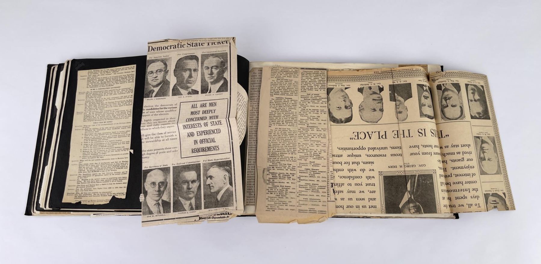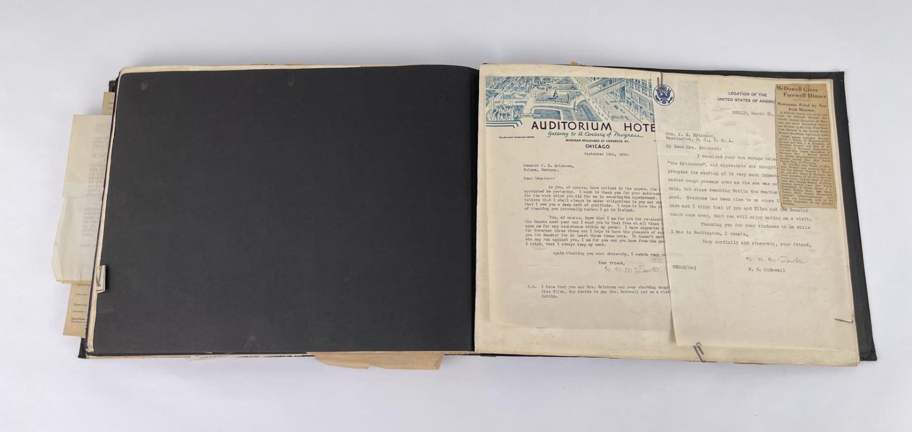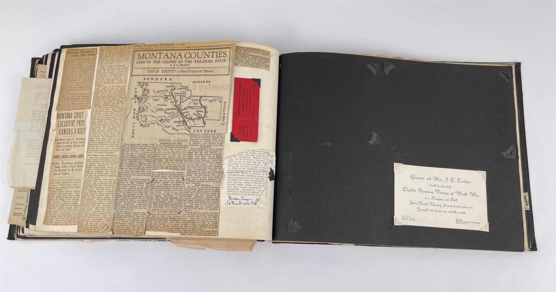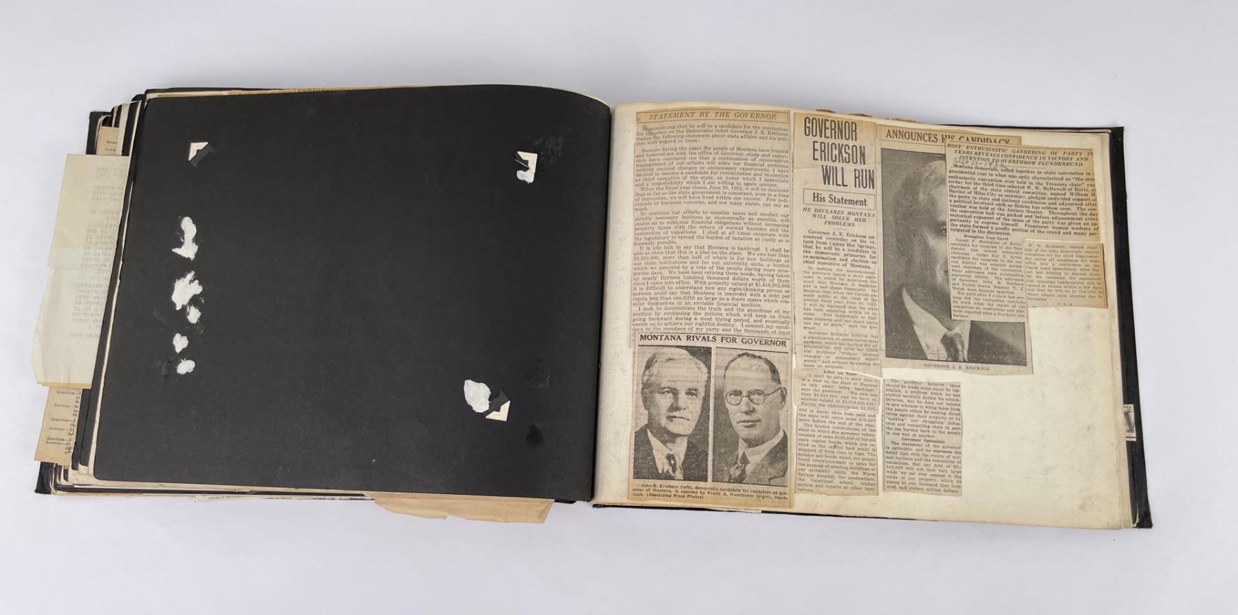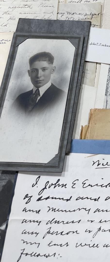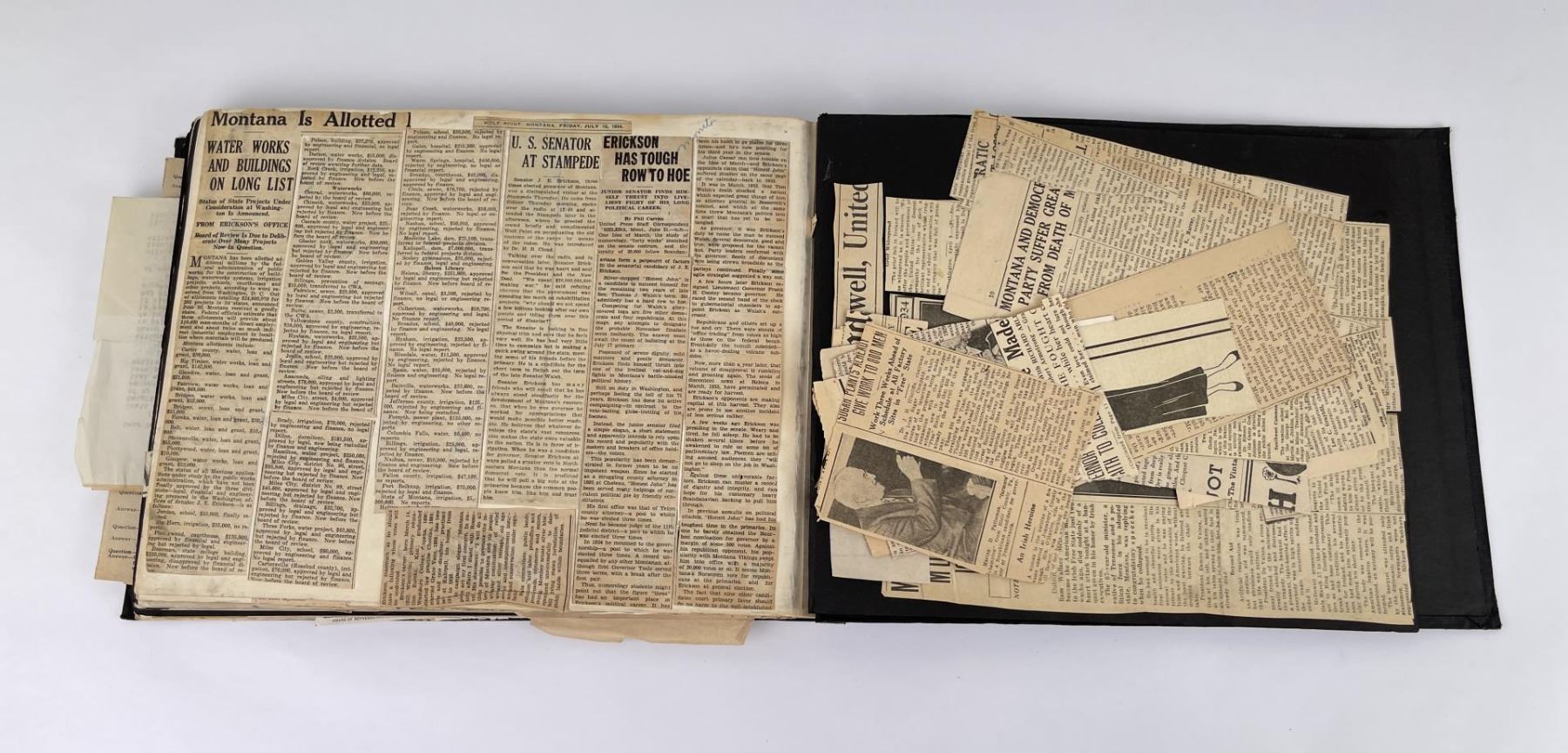 Phenomenal grouping of personal effects. All belonged to John E. Erickson. Includes Newspapers, Letters, Documents, Certificates, Photo Album, Last Will, and his original stagecoach trunk. John Edward Erickson (March 14, 1863 – May 25, 1946) was an American politician of the Democratic Party from Montana. He served as the eighth Governor of Montana and as a United States Senator. Erickson was admitted to the Kansas state bar in 1891. He moved to Great Falls, Montana in 1892 and later to Choteau, Montana, where he continued practicing law. He served as county attorney of Teton County from 1897 to 1905, then judge of the eleventh judicial district of Montana from 1905 to 1915. He resumed the practice of law at Kalispell, Montana in 1916.[7] A Democrat, Erickson was elected in 1924 as the eighth Governor of Montana. He won reelection in 1928, and again in 1932, making him the only governor elected to three terms. He served from January 4, 1925 to March 13, 1933. During his tenure, a new state income tax was sanctioned, a fund to financially equalize impoverished rural schools was established, a gasoline tax was implemented, a new banking law was authorized, and a tax on mining profits was initiated. On March 13, 1933, Erickson resigned as governor whereupon Frank Cooney, formerly Erickson's lieutenant governor and now the acting governor, appointed Erickson to the United States Senate to fill the vacancy caused by the death of Thomas J. Walsh. Although on the face of it, this appears to have been a rather brazen attempt on Erickson's part to establish himself in the Senate, Montana Senator Burton K. Wheeler tells a different story in his autobiography. Apparently Montana's Democratic National Committeeman, J. Bruce Kremer, was certain to be appointed to Walsh's seat. Walsh had very much disliked Kremer and worried that Kremer would succeed him if he (Walsh) accepted Franklin D. Roosevelt's appointment to his cabinet, as Attorney General (which Walsh had, at the time of his death). After Walsh's untimely demise, his daughter Genevieve Gudger asked Senator Wheeler if he would intercede with Governor Erickson to stop Kremer's appointment. As Wheeler also disliked Kremer, he agreed to do so. In Wheeler's telling, it was he who talked a reluctant Erickson into getting himself appointed. Erickson ran in 1934 to fill the remainder of Walsh's Senate term, but finished third in the primary, behind James E. Murray, who went on to win the special general election, and James F. O'Connor. He continued to serve in the Senate through November 6, 1934, the day that Murray was elected, at which point he resigned in favor of Murray, in order to give Murray seniority rights over other freshman senators, who didn't start their terms until 1935. Following his return from the Senate, Erickson practiced law in Helena, Montana, until his death.