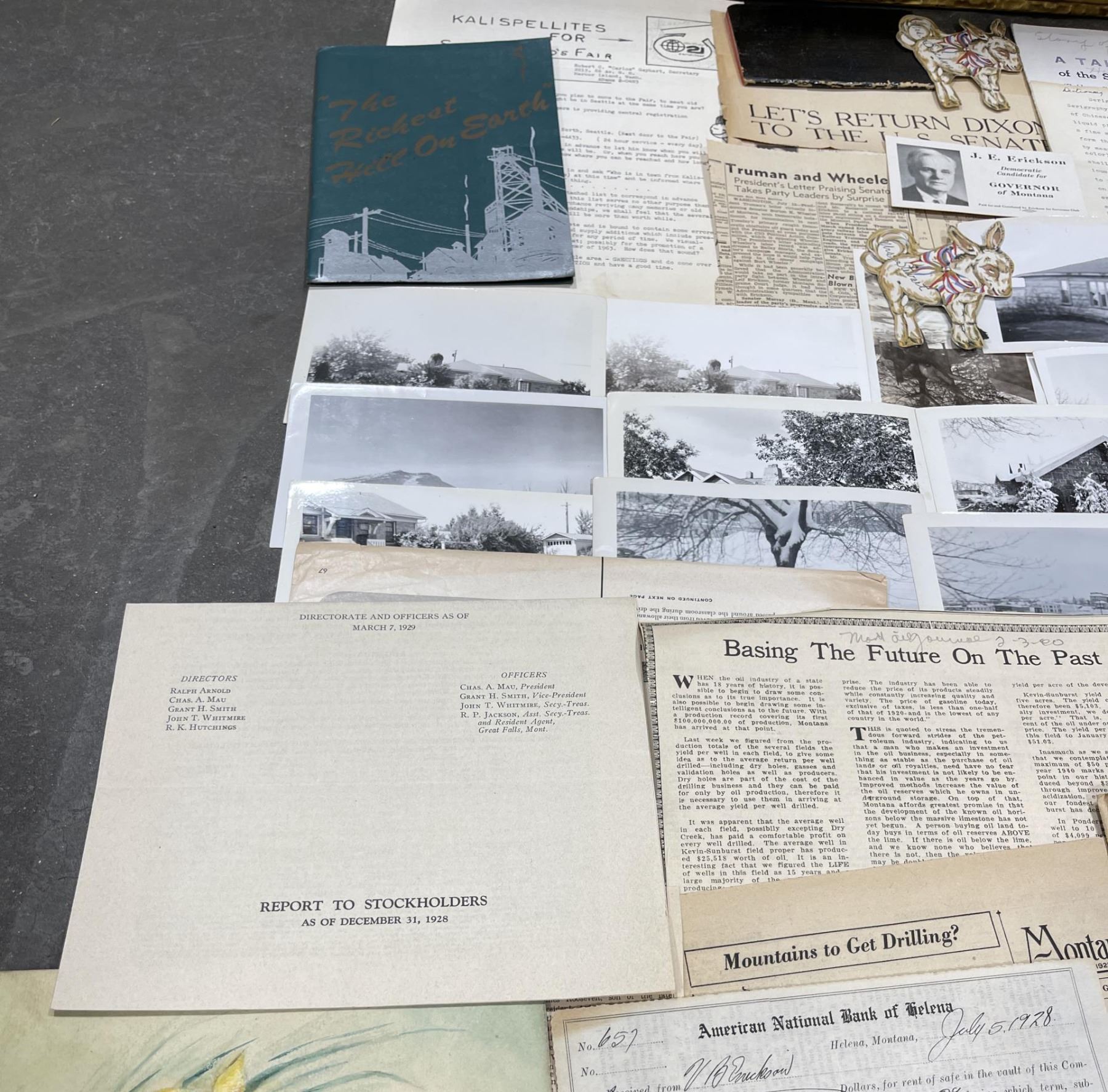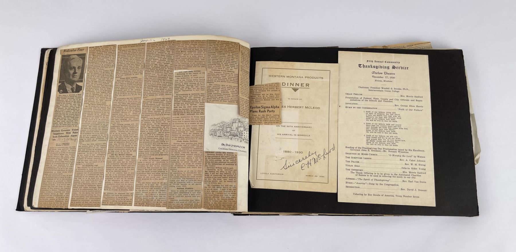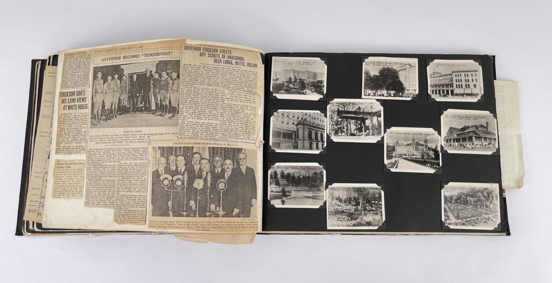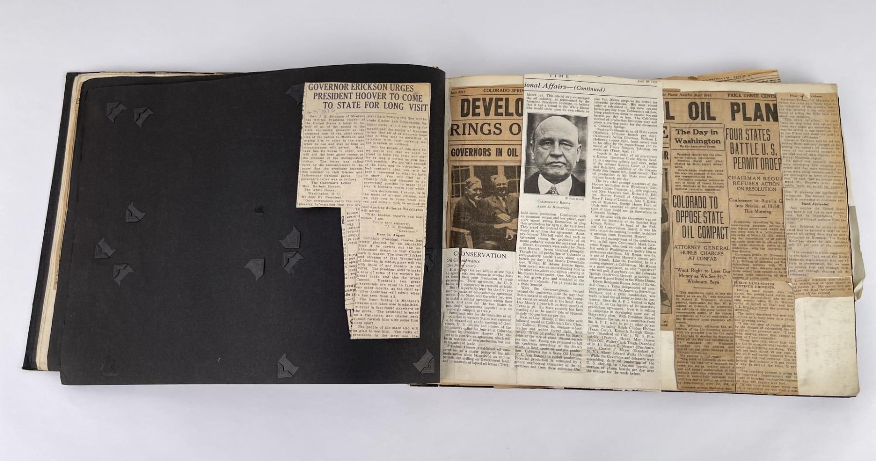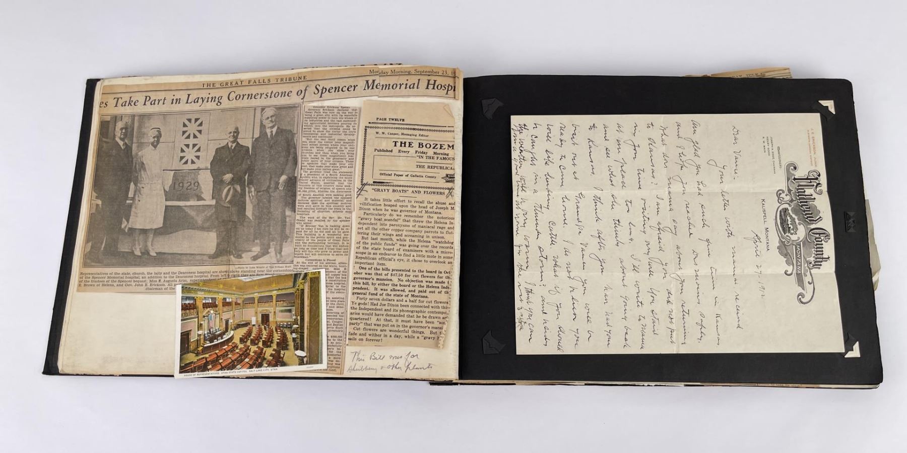 Phenomenal grouping of personal effects. All belonged to John E. Erickson. Includes Newspapers, Letters, Documents, Certificates, Photo Album, Last Will, and his original stagecoach trunk. John Edward Erickson (March 14, 1863 – May 25, 1946) was an American politician of the Democratic Party from Montana. He served as the eighth Governor of Montana and as a United States Senator. Erickson was admitted to the Kansas state bar in 1891. He moved to Great Falls, Montana in 1892 and later to Choteau, Montana, where he continued practicing law. He served as county attorney of Teton County from 1897 to 1905, then judge of the eleventh judicial district of Montana from 1905 to 1915. He resumed the practice of law at Kalispell, Montana in 1916.[7] A Democrat, Erickson was elected in 1924 as the eighth Governor of Montana. He won reelection in 1928, and again in 1932, making him the only governor elected to three terms. He served from January 4, 1925 to March 13, 1933. During his tenure, a new state income tax was sanctioned, a fund to financially equalize impoverished rural schools was established, a gasoline tax was implemented, a new banking law was authorized, and a tax on mining profits was initiated. On March 13, 1933, Erickson resigned as governor whereupon Frank Cooney, formerly Erickson's lieutenant governor and now the acting governor, appointed Erickson to the United States Senate to fill the vacancy caused by the death of Thomas J. Walsh. Although on the face of it, this appears to have been a rather brazen attempt on Erickson's part to establish himself in the Senate, Montana Senator Burton K. Wheeler tells a different story in his autobiography. Apparently Montana's Democratic National Committeeman, J. Bruce Kremer, was certain to be appointed to Walsh's seat. Walsh had very much disliked Kremer and worried that Kremer would succeed him if he (Walsh) accepted Franklin D. Roosevelt's appointment to his cabinet, as Attorney General (which Walsh had, at the time of his death). After Walsh's untimely demise, his daughter Genevieve Gudger asked Senator Wheeler if he would intercede with Governor Erickson to stop Kremer's appointment. As Wheeler also disliked Kremer, he agreed to do so. In Wheeler's telling, it was he who talked a reluctant Erickson into getting himself appointed. Erickson ran in 1934 to fill the remainder of Walsh's Senate term, but finished third in the primary, behind James E. Murray, who went on to win the special general election, and James F. O'Connor. He continued to serve in the Senate through November 6, 1934, the day that Murray was elected, at which point he resigned in favor of Murray, in order to give Murray seniority rights over other freshman senators, who didn't start their terms until 1935. Following his return from the Senate, Erickson practiced law in Helena, Montana, until his death.