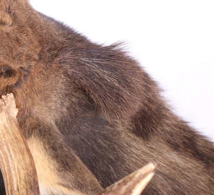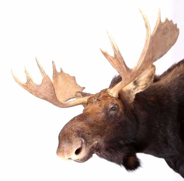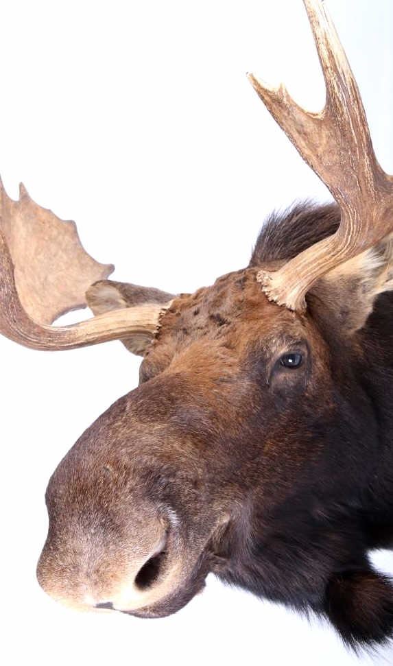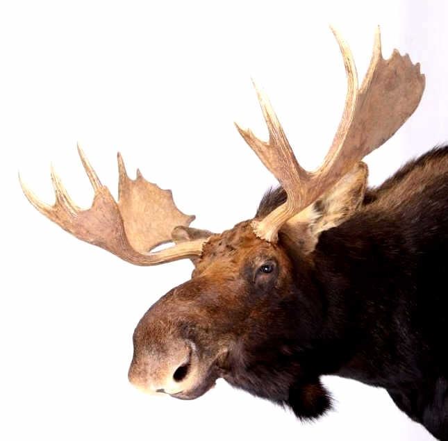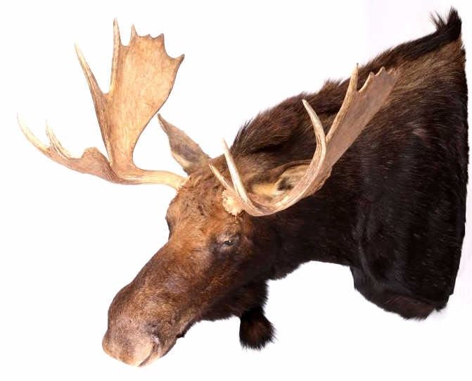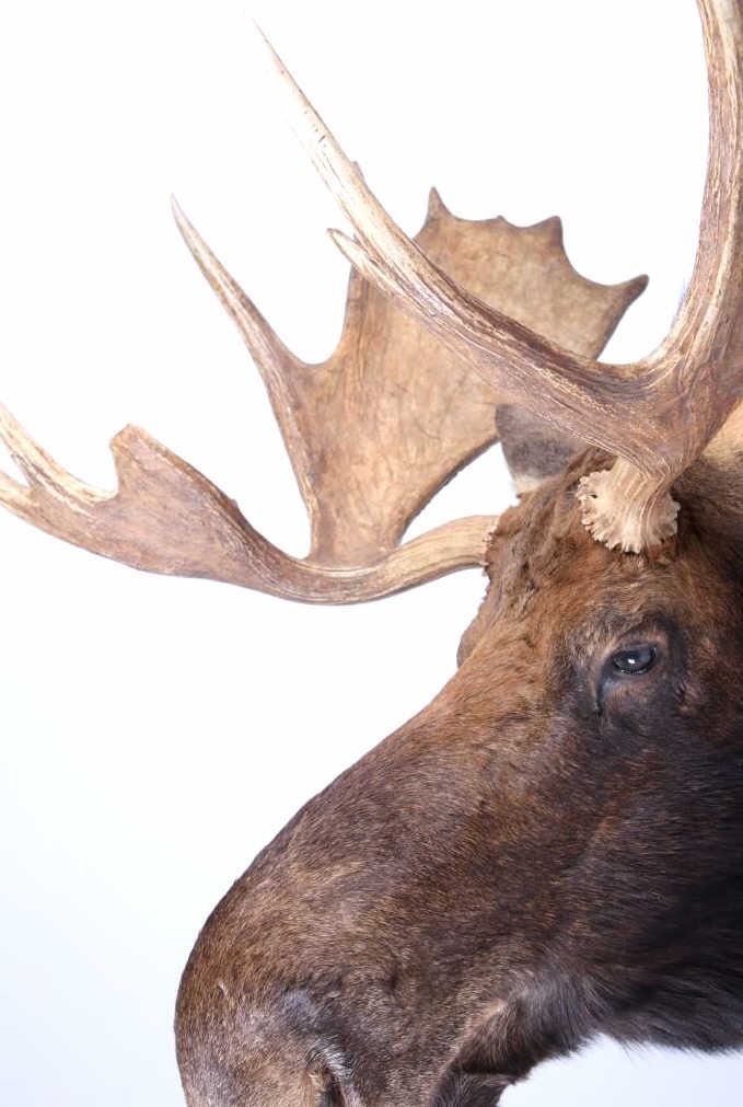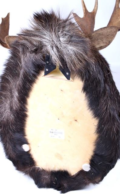 This is a Montana taken Shiras Moose Shoulder mount. Shiras moose inhabit the Rocky Mountain region of the United States and average 507 to 758 pounds at full maturity. The mount shows excellent hide with a rich colored trophy size horns. The horns measure 43.5" across. The mount is 53" off the wall. This beautiful mount is in great condition.
