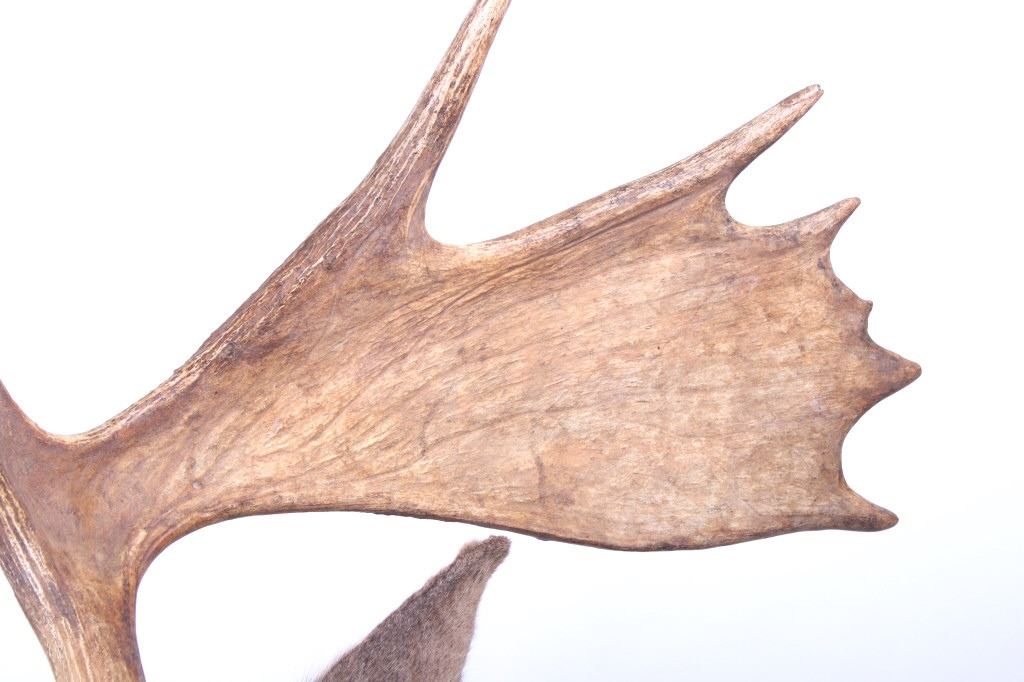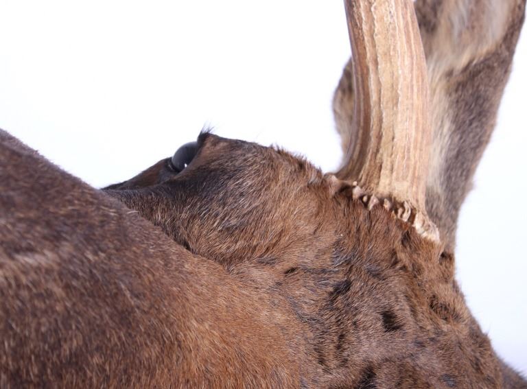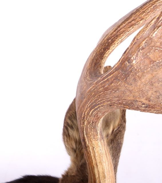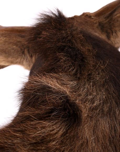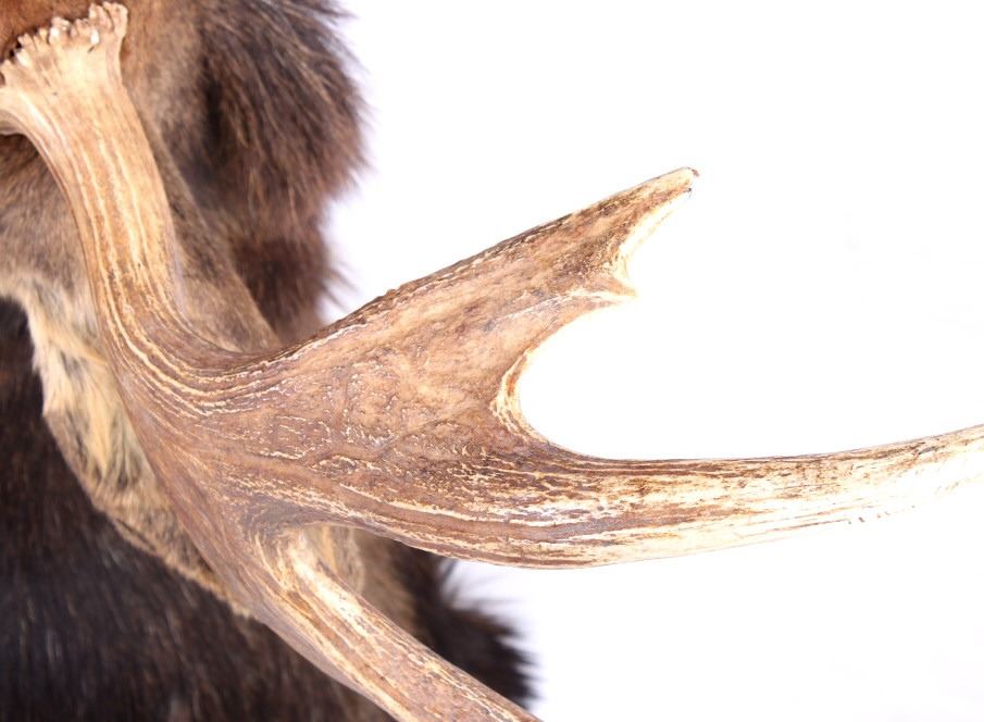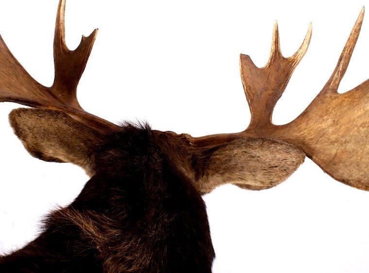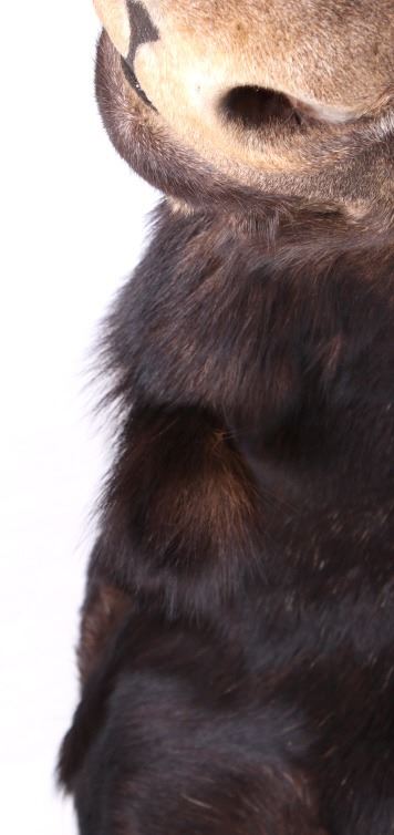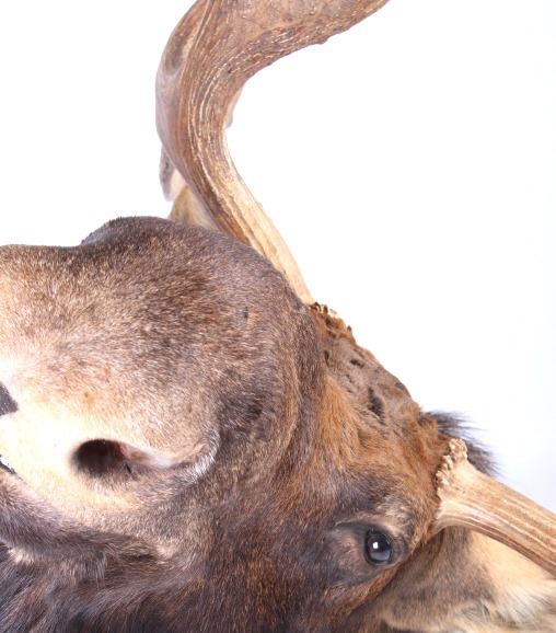 This is a Montana taken Shiras Moose Shoulder mount. Shiras moose inhabit the Rocky Mountain region of the United States and average 507 to 758 pounds at full maturity. The mount shows excellent hide with a rich colored trophy size horns. The horns measure 43.5" across. The mount is 53" off the wall. This beautiful mount is in great condition.