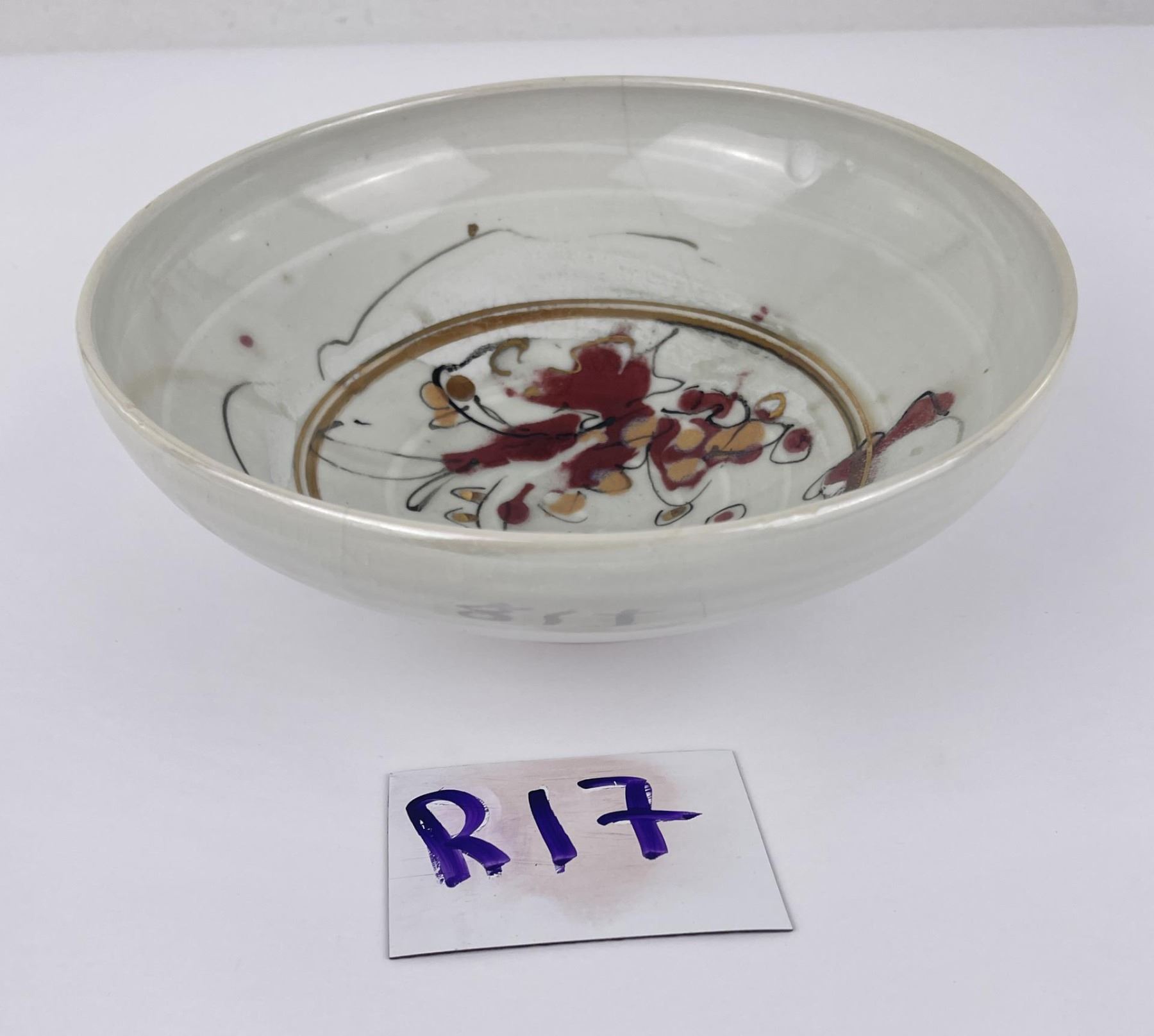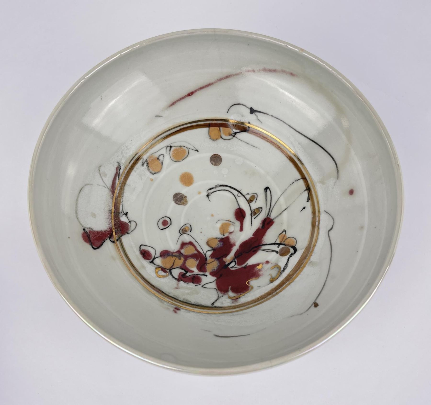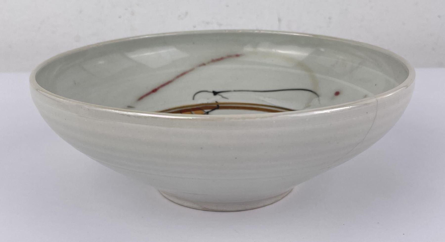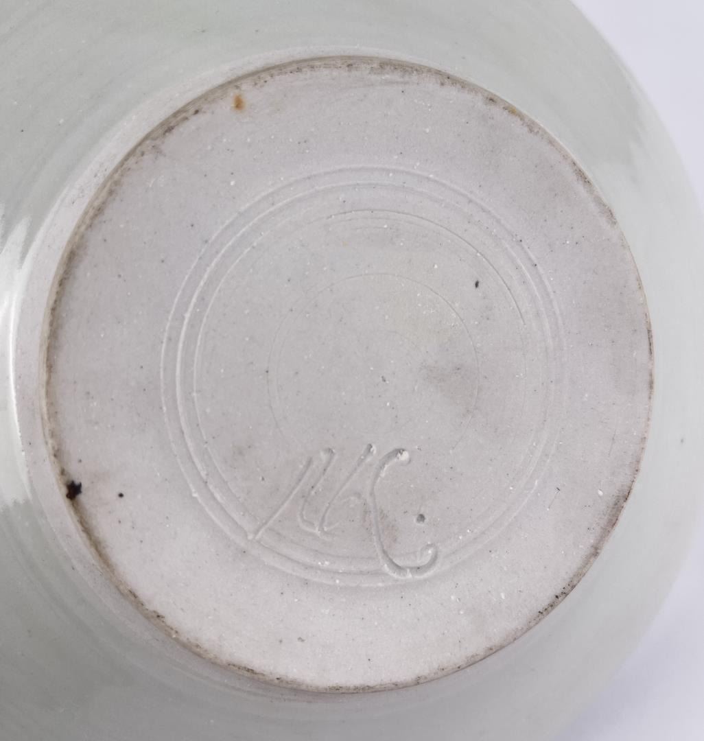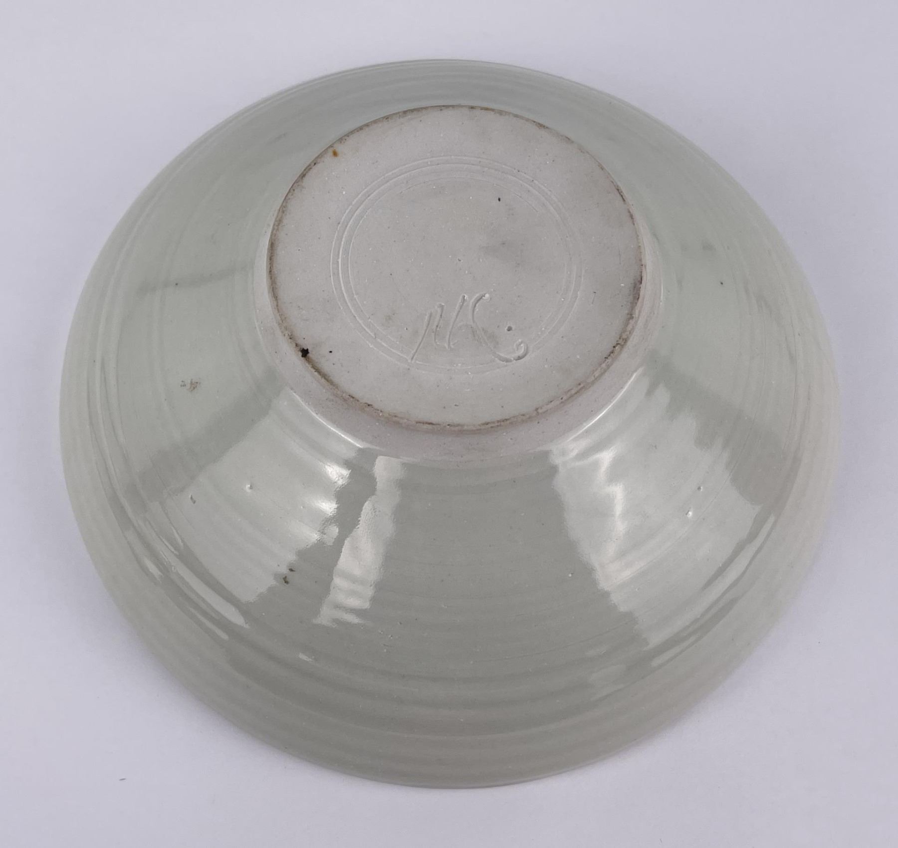 Cracked. Signed as shown. 9" diameter, 3 1/2" tall.