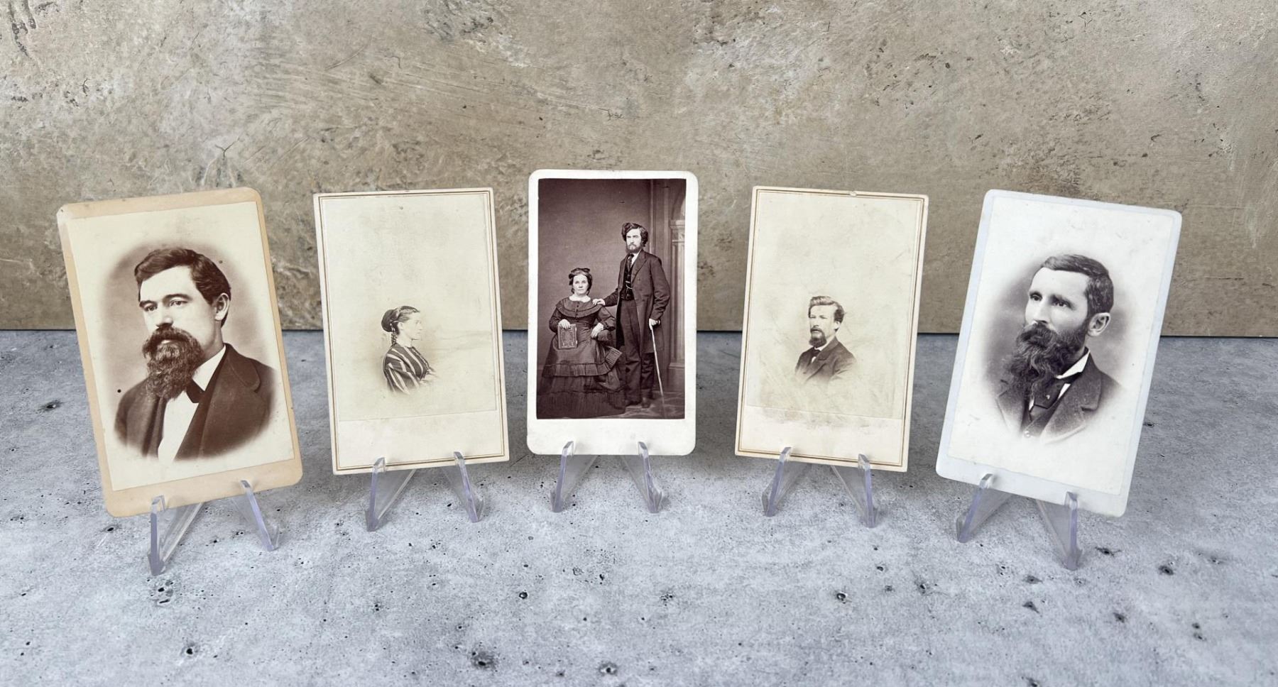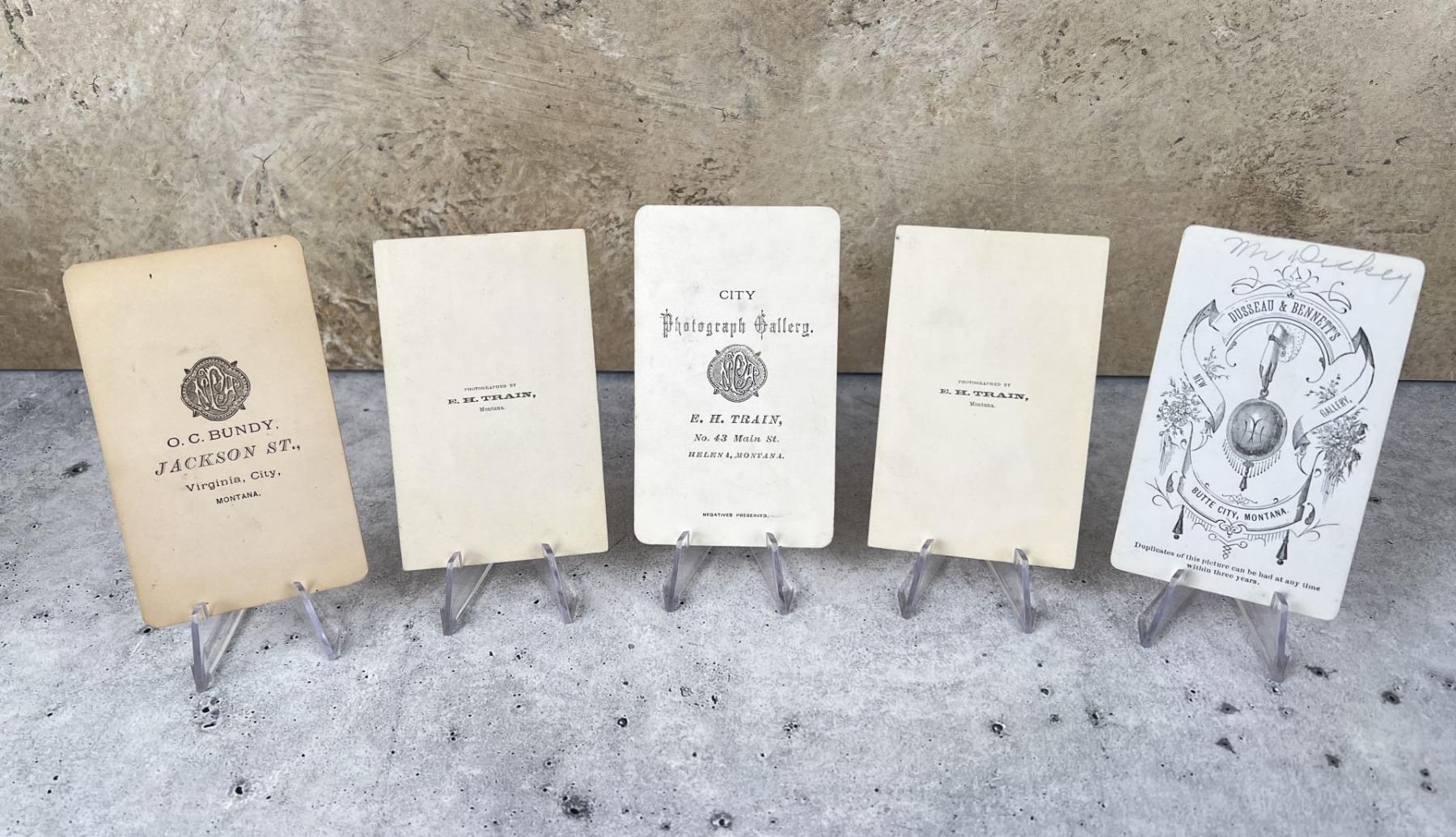 Five total. Each measures 4 1/4" by 2 1/2". O.C. Bundy Virginia City, E.H. Train Helena, Dusseau & Bennett's Butte.