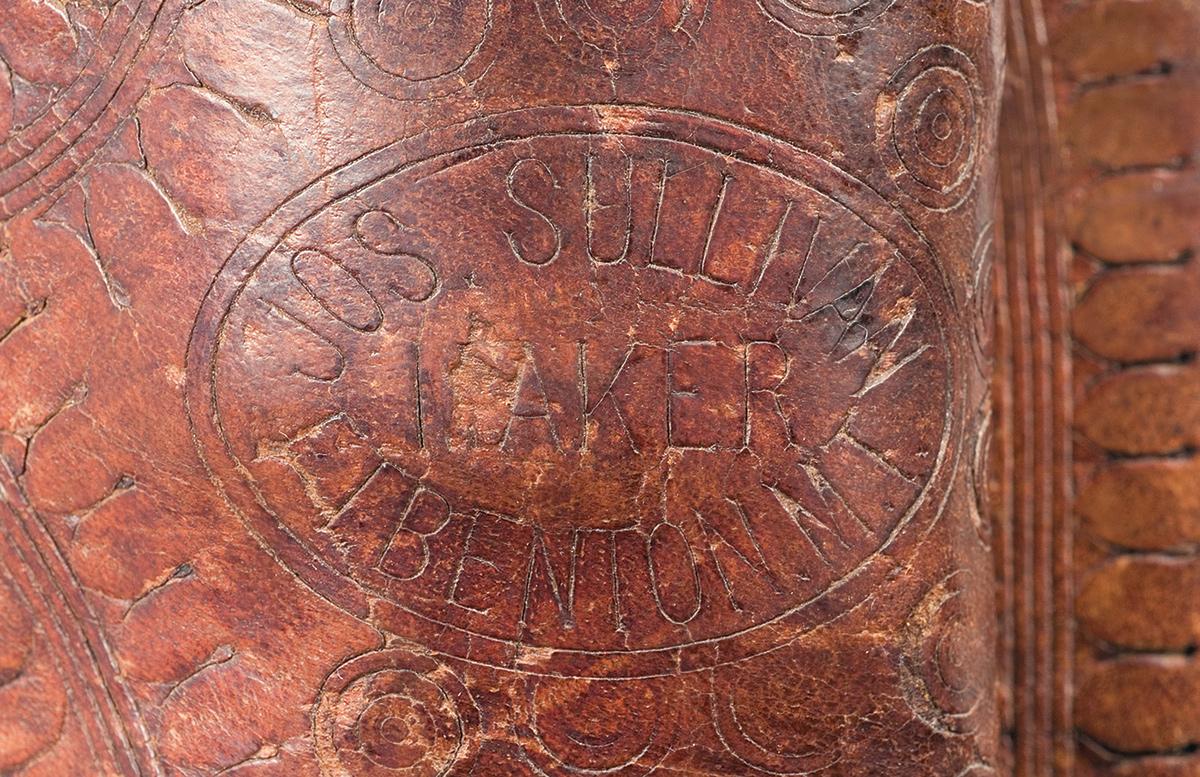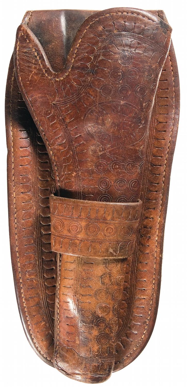 "Mexican Loop" holster made by Joseph Sullivan, in Ft. Benton, Montana Territory, 1880-1883. This russet leather holster is made for a Remington model 1890 Single Action Revolver with 7 1/2 inch barrel. The Mexican Loop holster is made of medium weight russet skirting leather and has a recurved throat profile with semi-contoured body and open toe. The full length skirt has a one-piece loop attached to the skirt by two copper rivets. The holster has a sewn leather liner and is decorated with intricate stamped tooling that covers the entire holster body and skirt. The center of the holster body is stamped with a prominent oval cartouche with double-line borders surrounding: "JOSEPH SULLIVAN / MAKER / FT. BENTON, M.T." A Mexican Loop holster made by Joseph Sullivan of Ft. Benton in Montana Territory is illustrated and described on pages 102-103 of "PACKING IRON" by Richard C. Rattenbury.