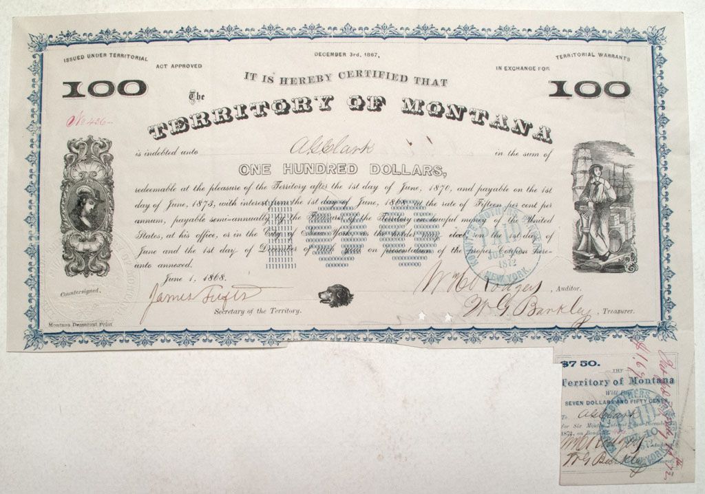 Dated 1868, signed by the Secretary of the Territory James Tufts, Auditor Rodgers, and Treasurer W Barkley. Certifies that the Territory of Montana is indebted to A. G. Clark for the sum of $100. All but one tab on bottom has been torn off. Tufts would be the fourth Governor of Montana, serving as 'acting Governor" in 1868 and 1869. Rodgers was one of the early Montana residents arriving in Virginia City in 1864.