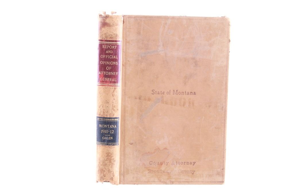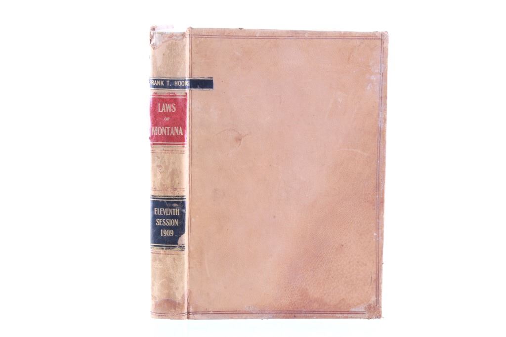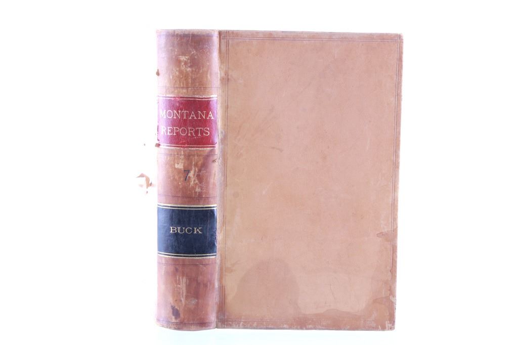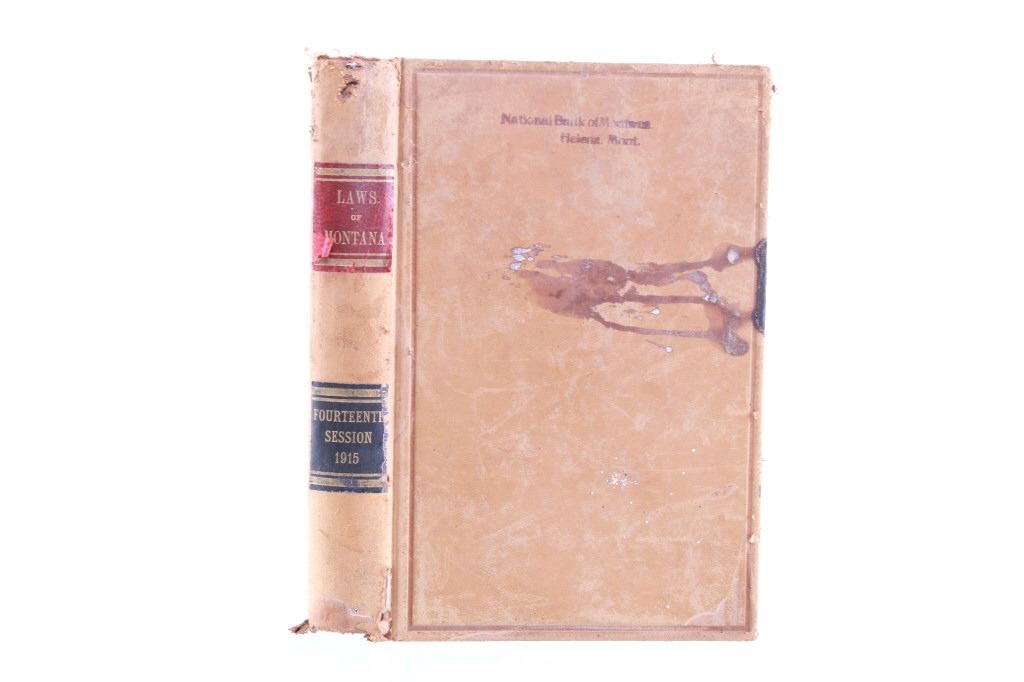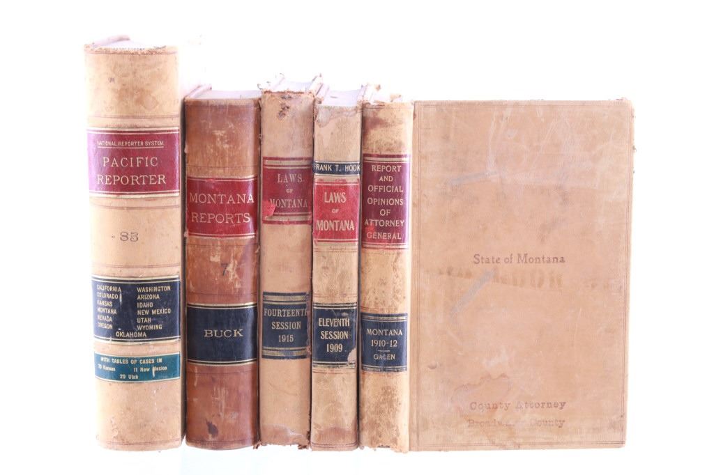 This lot includes a collection of five (5) Montana Territory and Montana State Law books, 1888 - 1915. Early Montana Territory law borrowed heavily from other states, especially California and New York, as models for developing laws, but that effort soon presented major challenges as Montana had a much smaller population and immense differences in lifestyles, land mass and natural resources. Of particular historical interest are the Montana Territory Supreme Court cases heard and decided as reported in Volume 7 of "Reports of Cases Argued and Determined in the Supreme Court of Montana Territory at the July Term 1887, the January Term 1888, and the July Term 1888. By Horace R. Buck, Reporter. The Bancroft Company 1888." Books included in this collection are, "Montana Reports Volume 7, Buck 1888"; "Laws of Montana Eleventh Session 1909"; "Laws of Montana Fourteenth Session 1915"; "Report and Official Opinions of the Attorney General of the State of Montana 1910-1912, Albert J. Galen, Attorney General"; and lastly, "The Pacific Reporter Volume 85, containing all the decisions of the Supreme Courts of California, Kansas, Washington, Colorado, Montana, Arizona, Nevada Idaho, Wyoming, Utah, New Mexico, Oklahoma, and Courts of Appeal California.1906" All books are leather bound hardcover, covers exhibit moisture and scuffing damages, intact pages have age tanning and some foxing noted. No other obvious marring noted. Largest book measures 7"W x 10.5"L x 2.25"D, smallest book is 6"W x 9.25"L x 1"D