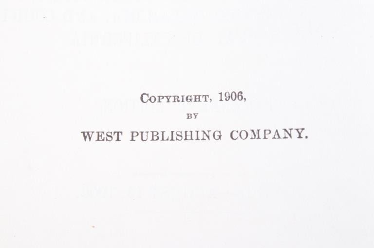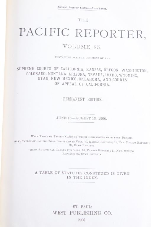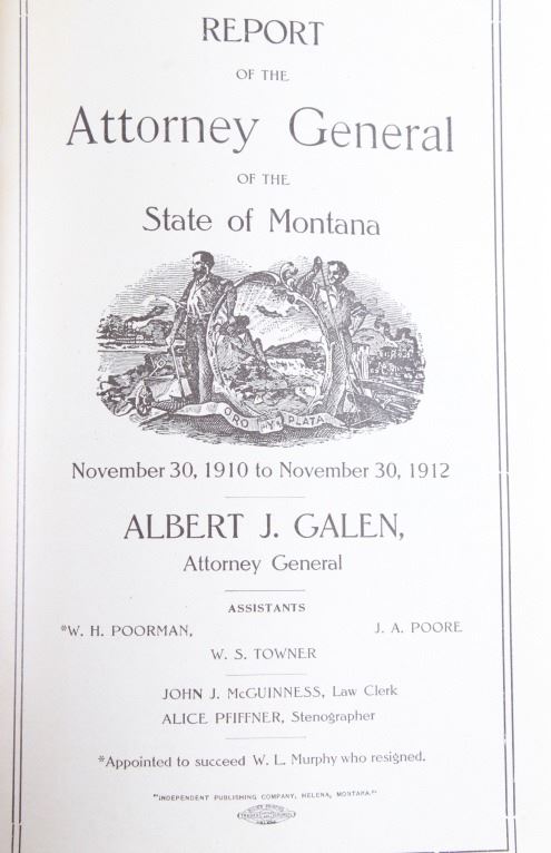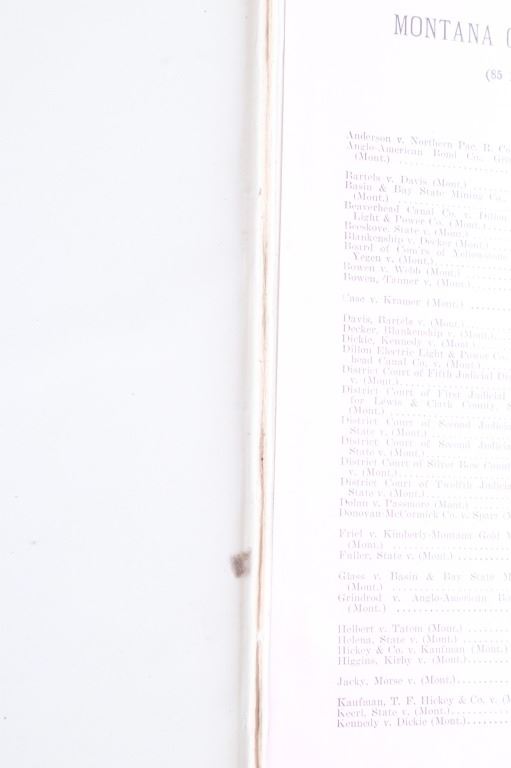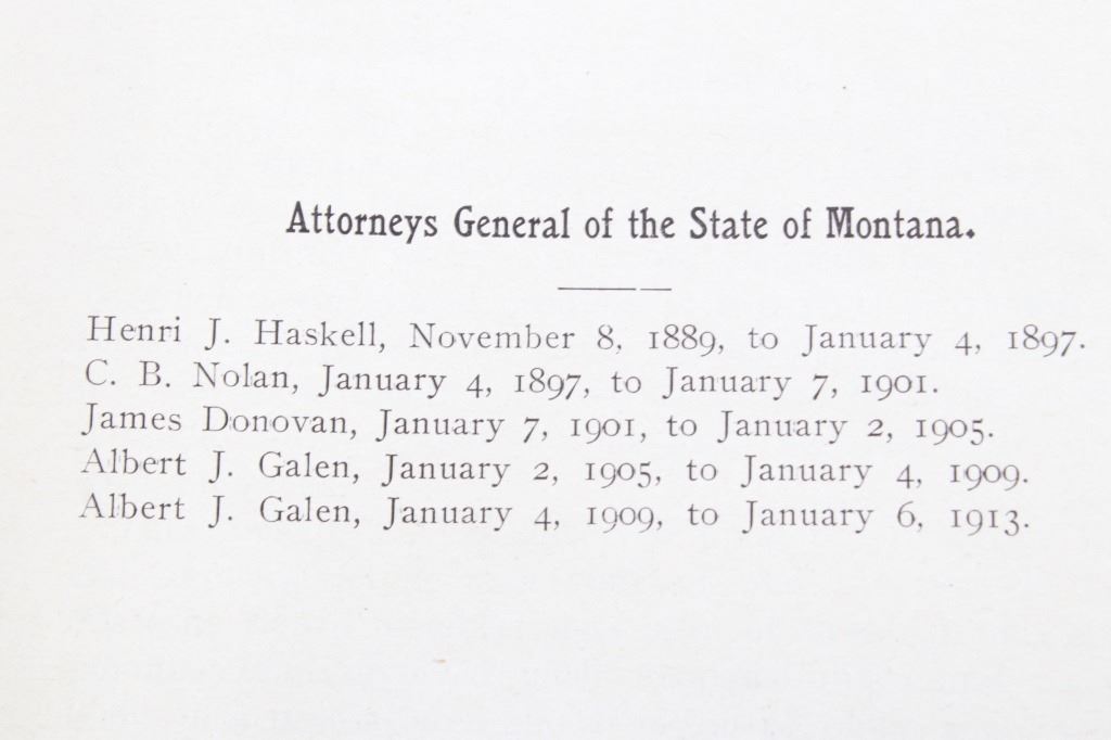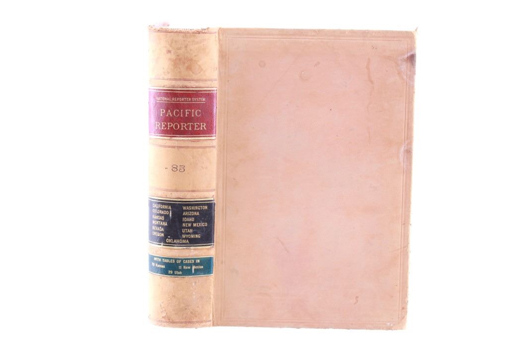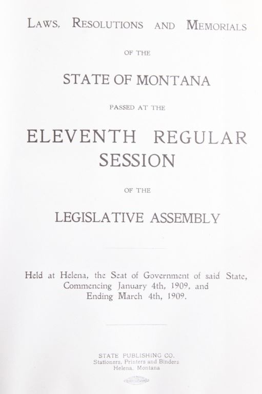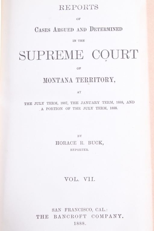 This lot includes a collection of five (5) Montana Territory and Montana State Law books, 1888 - 1915. Early Montana Territory law borrowed heavily from other states, especially California and New York, as models for developing laws, but that effort soon presented major challenges as Montana had a much smaller population and immense differences in lifestyles, land mass and natural resources. Of particular historical interest are the Montana Territory Supreme Court cases heard and decided as reported in Volume 7 of "Reports of Cases Argued and Determined in the Supreme Court of Montana Territory at the July Term 1887, the January Term 1888, and the July Term 1888. By Horace R. Buck, Reporter. The Bancroft Company 1888." Books included in this collection are, "Montana Reports Volume 7, Buck 1888"; "Laws of Montana Eleventh Session 1909"; "Laws of Montana Fourteenth Session 1915"; "Report and Official Opinions of the Attorney General of the State of Montana 1910-1912, Albert J. Galen, Attorney General"; and lastly, "The Pacific Reporter Volume 85, containing all the decisions of the Supreme Courts of California, Kansas, Washington, Colorado, Montana, Arizona, Nevada Idaho, Wyoming, Utah, New Mexico, Oklahoma, and Courts of Appeal California.1906" All books are leather bound hardcover, covers exhibit moisture and scuffing damages, intact pages have age tanning and some foxing noted. No other obvious marring noted. Largest book measures 7"W x 10.5"L x 2.25"D, smallest book is 6"W x 9.25"L x 1"D