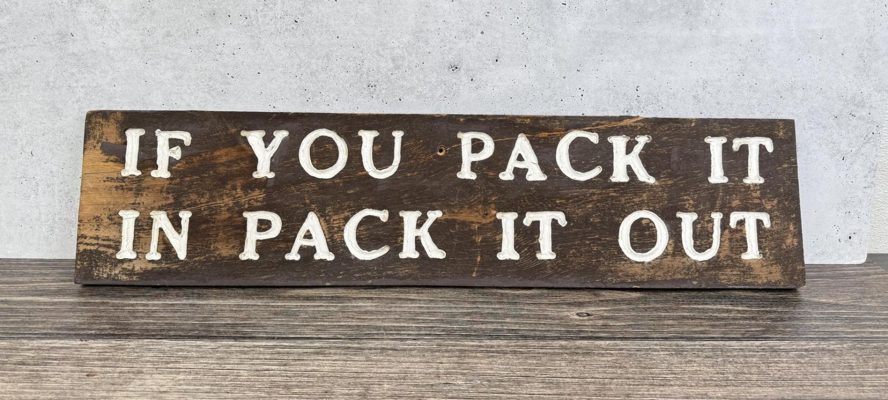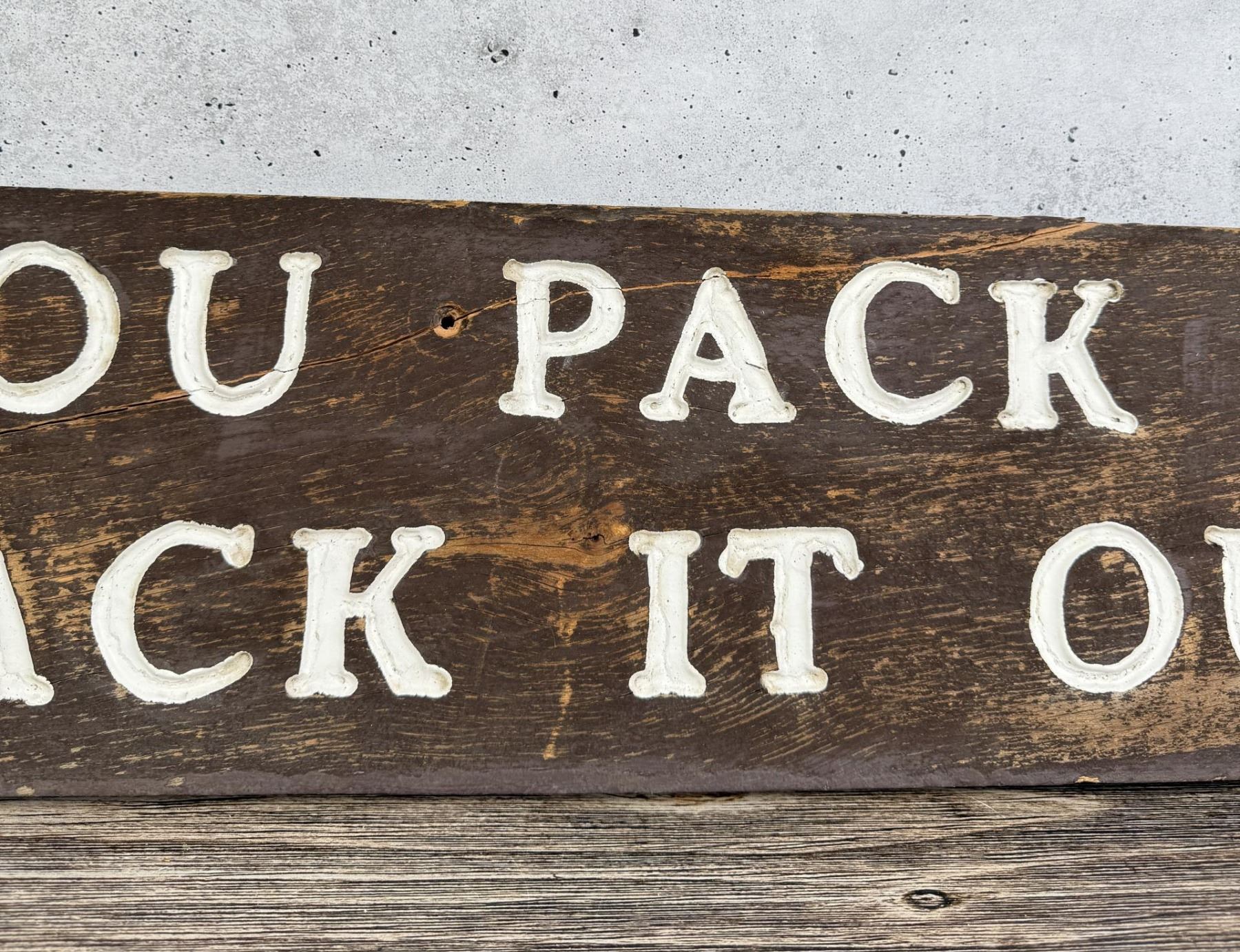 If you Pack it in Pack it Out. Nice original sign. 7 1/4" by 30".