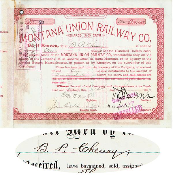 1887. Montana Territory. Stock certificate for one shares of Montana Union Railway Company issued to the B.P. CHENEY (1815 - 1895). The Northern Pacific and Union Pacific jointly organized the Montana Union Railway in 1886 with each initially owning half of the companies stock. The company served the mining region into Butte. Stamp and punch cancellations.