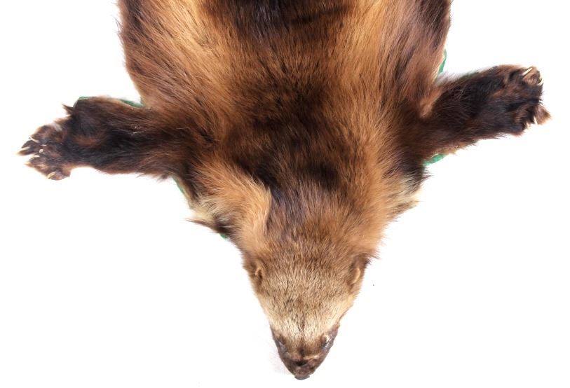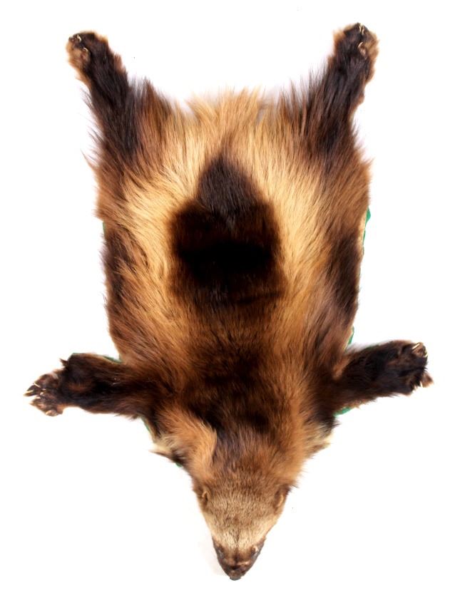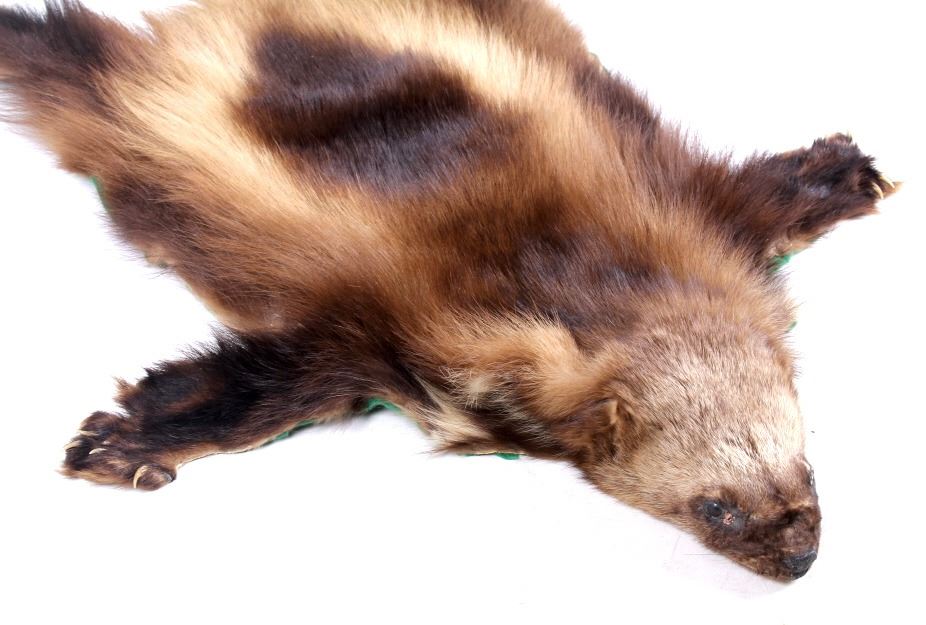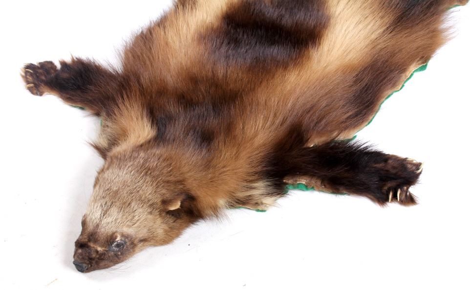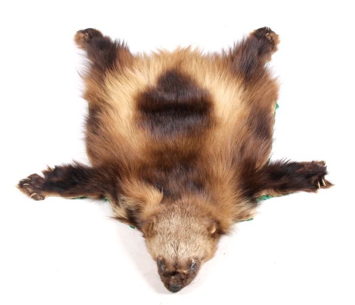 This is a Montana wolverine taxidermy rug mount. The wolverine shows great color and is in good overall condition with minor damage and wear. The wolverine measures 40" long x 28" wide.