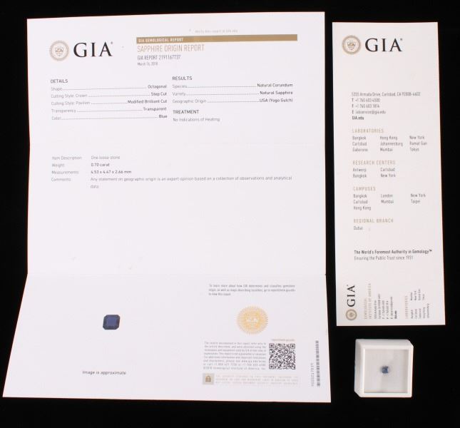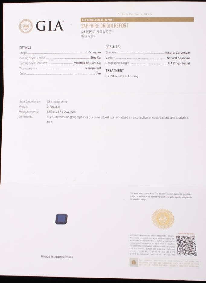 This is an exceptional rare Montana Yogo Color Change Sapphire which comes with a gemology report from GIA and is 0.70 carats. The piece comes with a GIA (Gemological Institute of America) report which states the piece as being an authentic Yogo Gulch Natural Sapphire Corundum with no heat treatment having an excellent octagonal step modified brilliant cut (princess cut) with wonderful clarity and a size of 0.70 carats. This example is a very rare Color Change Yogo Sapphire, a truly unusual and scarce example. The Montana Yogo Sapphire is a corundum stone found only in the Yogo Gulch, part of the Little Belt Mountains in Judith Basin County, Montana. The stone is known for its astounding cornflower blue coloring, a result of trace amounts of iron and titanium. The stone is currently loose and has not been set for the buyer’s convenience allowing the buyer to set the piece in any manner or style of their choosing. The ring has been examined by an expert and confirmed to be an authentic high quality Yogo. The stone was given an informal sale value of over $7,000 due to its wonderful size, rare color change aspect and incredible clarity by Baker’s Jewelry of Glasgow, MT.