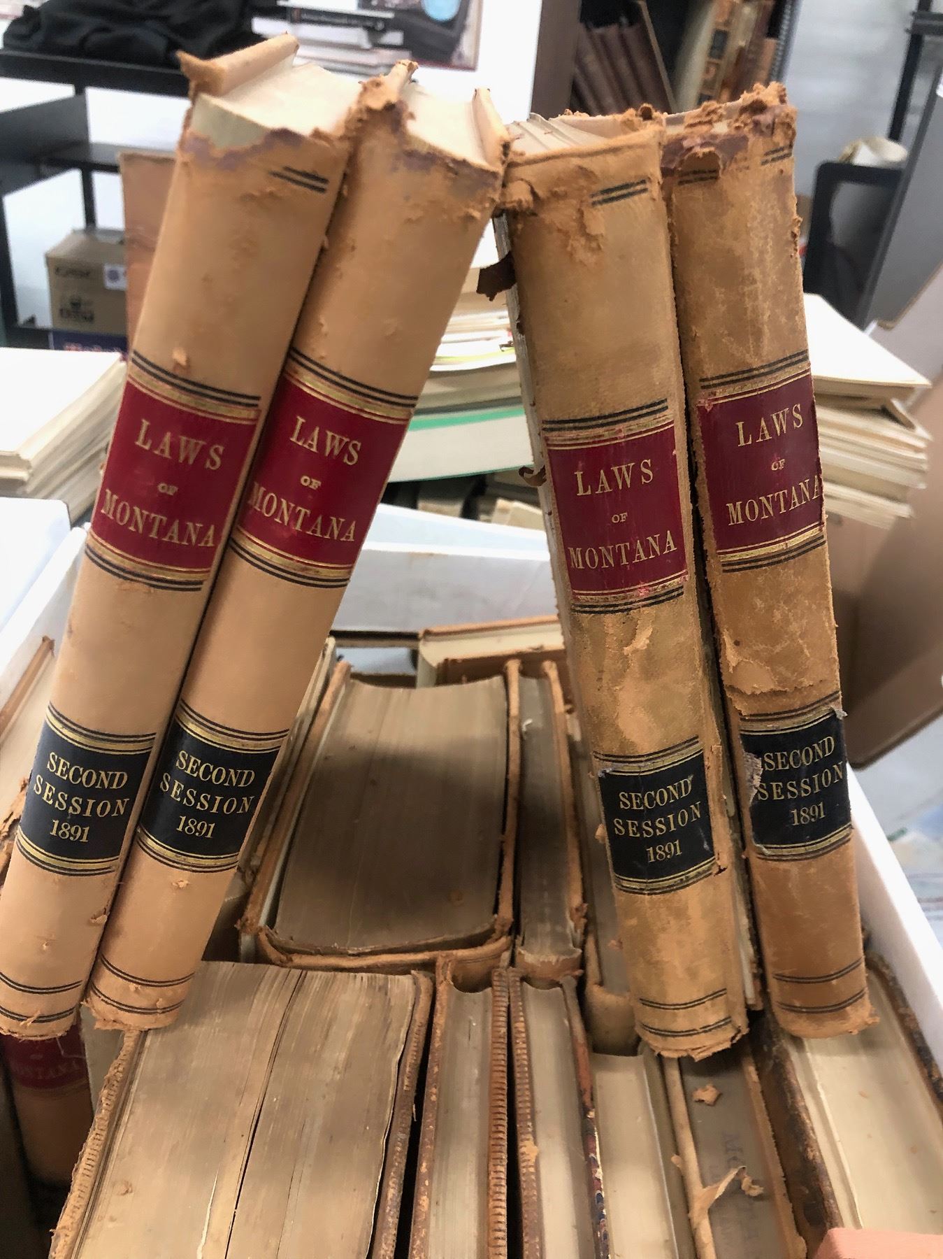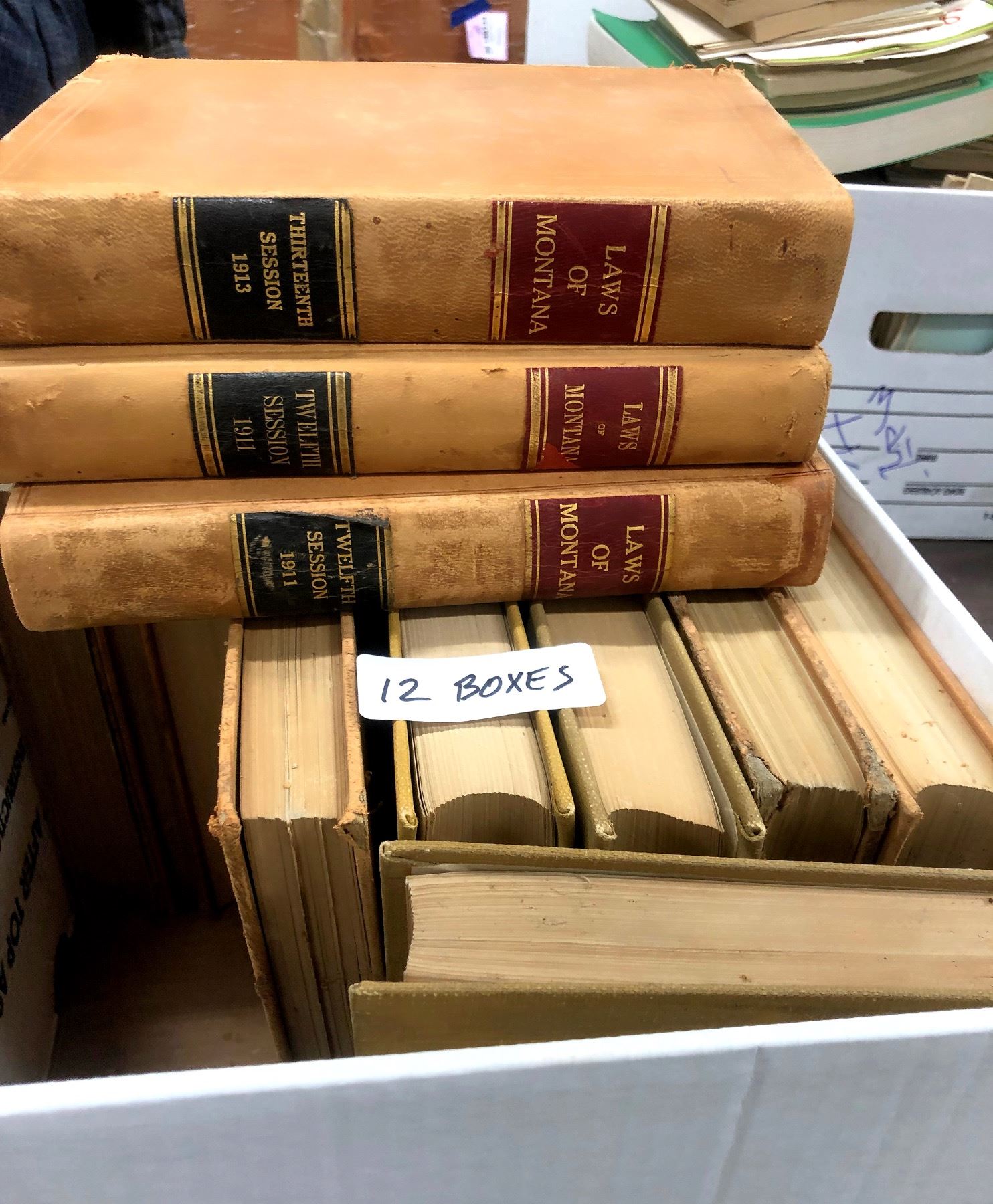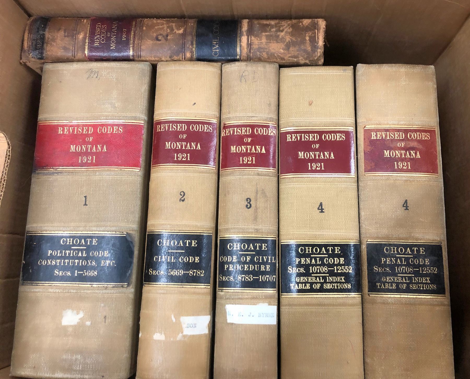A nice library for Montana Territory and Montana legal enthusiasts and researchers. Hardcover Laws of Montana and Montana Territory. 1871-72, 1876(2), 1879(3), 1883, 1885(2, one is rebound), 1887, 1889, 1891(9), 1893, 1897(2), 1899(3), 1901(4), 1903(2), 1905(2), 1907(2), 1909(3), 1911(3), 1913(5), 1915(3), 1917(3), 1927, 1931,1933, 1935, 1939. Montana Revised Code 1921 Vols. 1-4, 1907. Montana Constitution Codes 1895. Montana Codes Political and Civil 1895. Taxation of Mines in Montana by Levine(3). Cases and Proceedings Board of Railroad Commissioners 1920(2). House Journal Legislative Assembly 1873, Senate Journal 2nd Session1891(2).House and Counsel Journal 1866, Council Journal 5th Session, House Journal 5th Session 1868-9, House Journal 2nd Session(3), Senate Journal 1903(2), Senate Journal 8th 1903 2nd session (2), Senate Journal 9th, House Journal 9th(2), House Journal 5th, Senate Journal 10th(2), 11th, 12th(2), House Journal 12th(2), House Journal 12th(2), 13th, Senate Journal 13th.Montana Codes Annotated Civil Codes 1895(2), Civil Procedures/Penal Code 1895, Political Code/Civil Code 1895 Vol 1(4). Codes Annotated Penal Codes Vol 2(7). House Journal of Legislative Assembly 1869, 1879(reprint), 1887(3 reprint), 1919(2), 1925(2). Senate and House Journals 1909, 1919. Senate Journal 1909, 1913, 1915, 1917. Territory of Montana 4th, 5th legislative assembly. Montana legislative assembly. Laws, Resolutions and Memorial 12th, 14th(2) sessions. House and Senate Journal 1919. Laws, Resolutions and Memorials 1869, 1911, 1915(2). Senate Journal 1909, 1913, 1915, 1917. House Journal 1869, 1879(2), 1887(2), 1919(2), 1925(2). Counsel Journal MT 1863, Senate Journal 1897(3), Counsel Journal 1866, House Journal 1891, Laws of Montana 1869, 1870, 1893. Revised Statutes 1879. Compiled Statutes 1887. House Journal MT 1873, 1877, 1879. Laws, Resolutions and Memorials MT 1885, 1887, 1889(2). Senate Journal 1937. Report of the State Board Land Commission 1891(2), 1892(3), Land Agent Report 1895, 1891-92(3), 1892-3, Register of State Land Office 1898(2), Biennial Report Register of State Lands 1913-24. Approx. 40 other assorted legal books and more. 12 boxes of books in total. Please inspect.