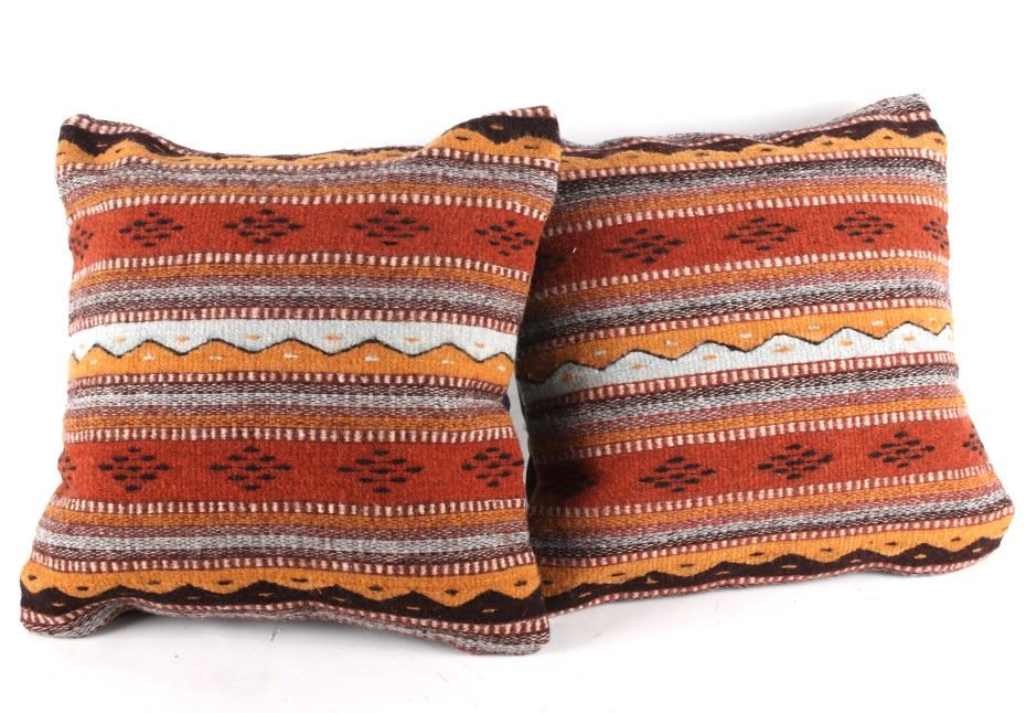 The lot features an excellent set of two hand woven flat weave pillows by master weaver Cesar Hipolito. The pillows were made using 100% soft, fine Churro Wool yarns. Churro wool is a time-tested fiber that is strong and soft and provides a vibrant base for colors. The tight hand woven weave, showing rich colors, is in the fine Montanitas Meli pattern of the time-honored Zapotec, multi-generational craft by a master weaver, Cesar Hipolito. The set is in brand new condition and is made with a pre-shrunk cotton backing with a zipper. Pillow inserts are included. Each pillow is 21" x 21" and approximately 7.5” deep. The pillows are supportive yet soft and made for relaxation. This is a wonderful matched set that is ready to be displayed in your home. The lot includes the set of two pillows and two pillow inserts in brand new condition.