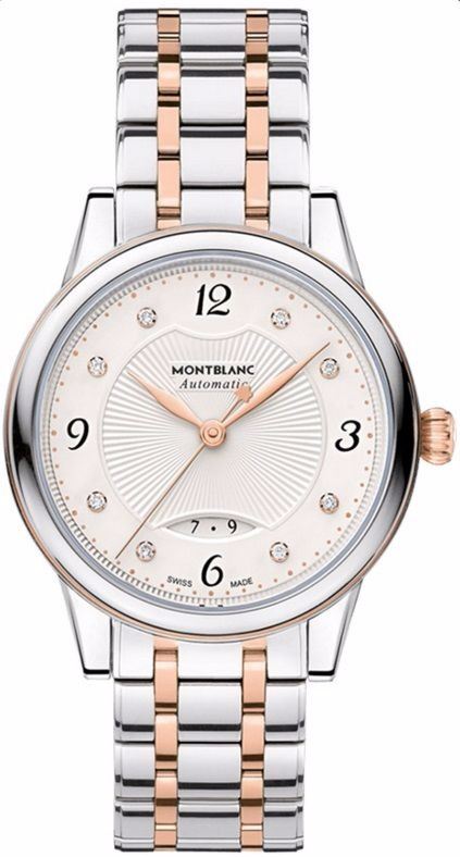 Model: 111058 - CASE = [Material:Stainless Steel and Rose Gold], [Case Diameter:30], [Case Thickness:9.5mm], [Bezel:Fixed], [Case Back:Skeleton], [Water Resistant:30 Meters - 100 Feet], [Crystal:Scratch Resistant Sapphire],; DIAL = [Color:Silvery-white Guilloche with 8 Diamonds],; MOVEMENT = [Type:Automatic, 38 Hour Power Reserve], [Crown:Push In],; BAND = [Clasp:Folding], [Type:Stainless Steel and Rose Gold], (Usually ships in 1 to 2 weeks.)