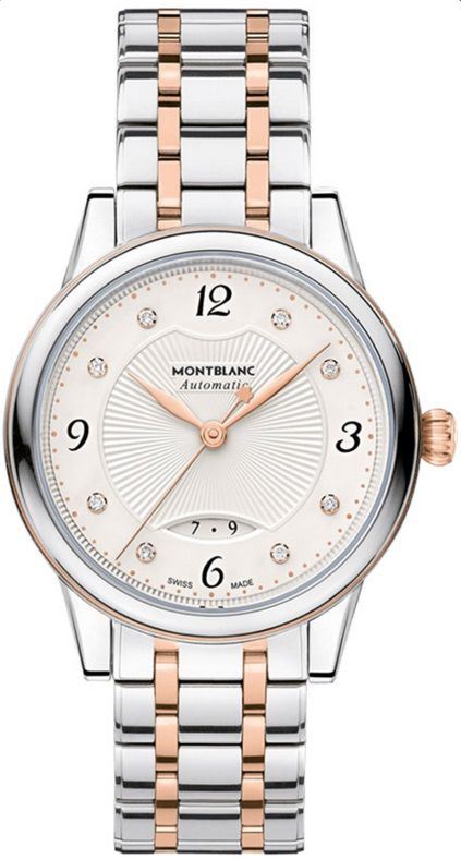 Model: 111058 - CASE = [Material:Stainless Steel and Rose Gold], [Case Diameter:30], [Case Thickness:9.5mm], [Bezel:Fixed], [Case Back:Skeleton], [Water Resistant:30 Meters - 100 Feet], [Crystal:Scratch Resistant Sapphire], DIAL = [Color:Silvery-white Guilloche with 8 Diamonds], MOVEMENT = [Type:Automatic, 38 Hour Power Reserve], [Crown:Push In], BAND = [Clasp:Folding], [Type:Stainless Steel and Rose Gold], (Usually ships in 1 to 2 weeks.)