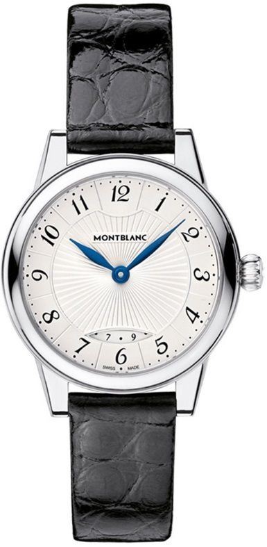 Model: 111206 - CASE = [Material:Stainless Steel], [Case Diameter:27], [Case Thickness:6.8mm], [Bezel:Fixed], [Case Back:Solid], [Water Resistant:30 Meters - 100 Feet], [Crystal:Scratch Resistant Sapphire],; DIAL = [Color:Silvery-white Guilloche with Black Arabic Numerals],; MOVEMENT = [Type:Quartz], [Crown:Push In],; BAND = [Clasp:Tang], [Type:Black Alligator Leather], (Usually ships in 1 to 2 weeks.)