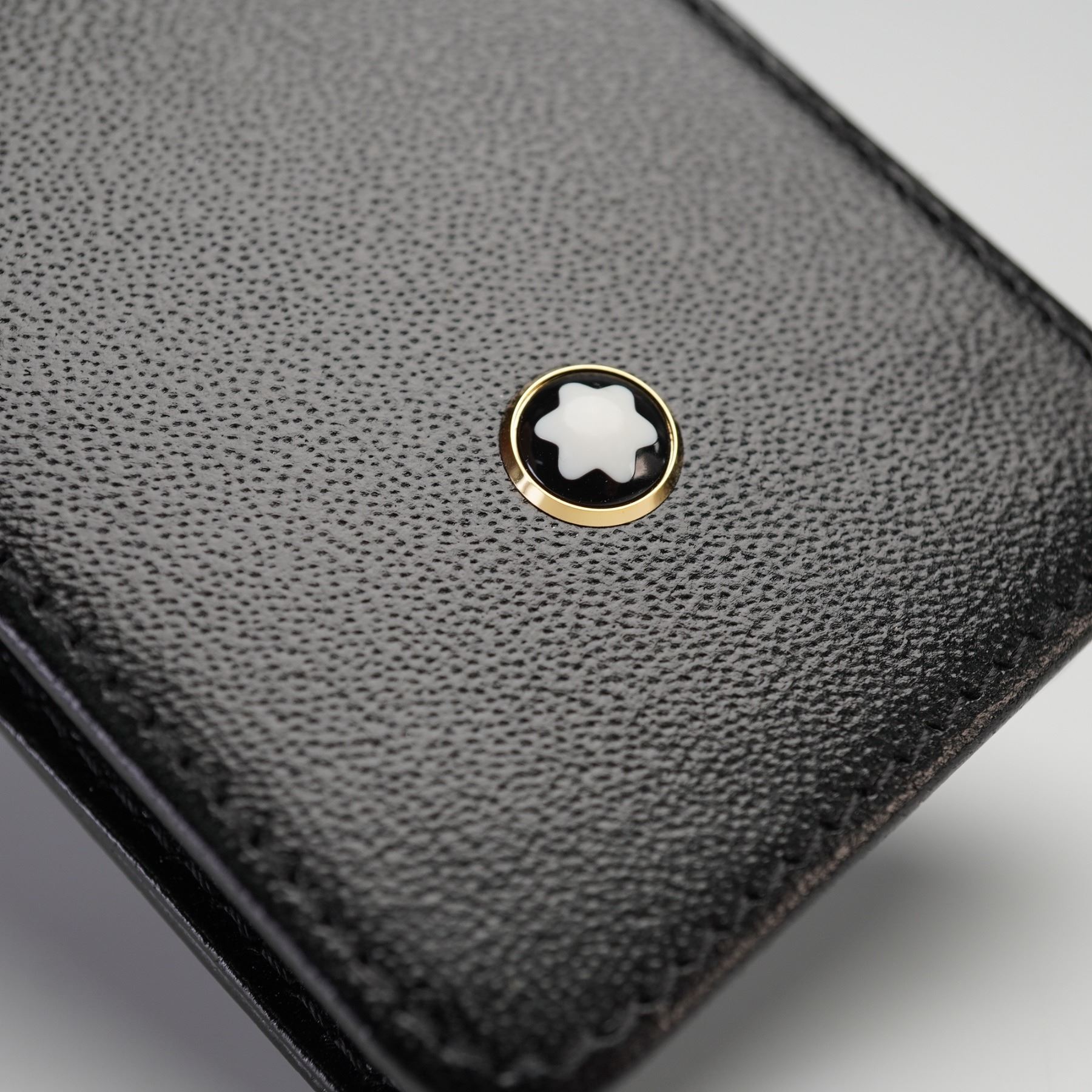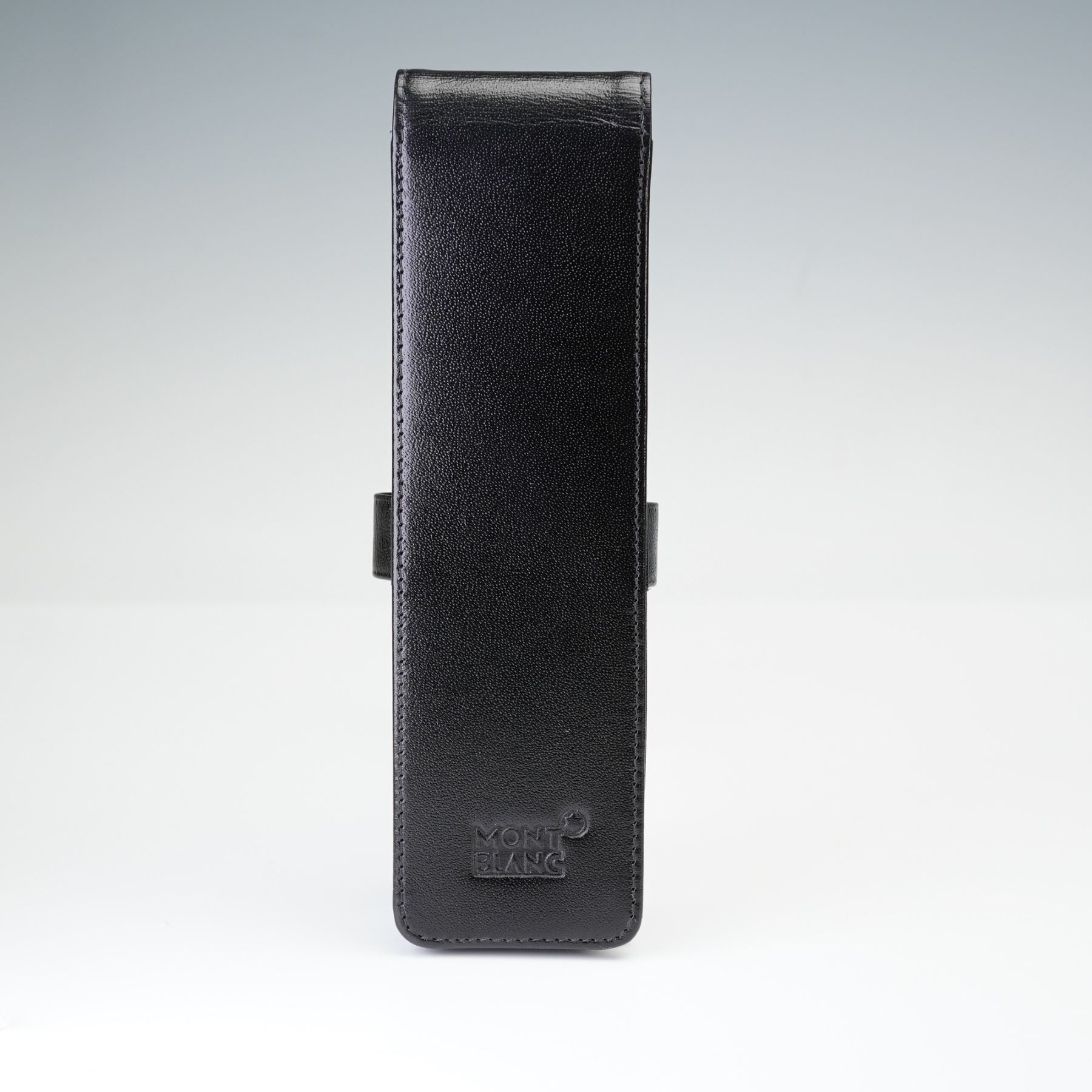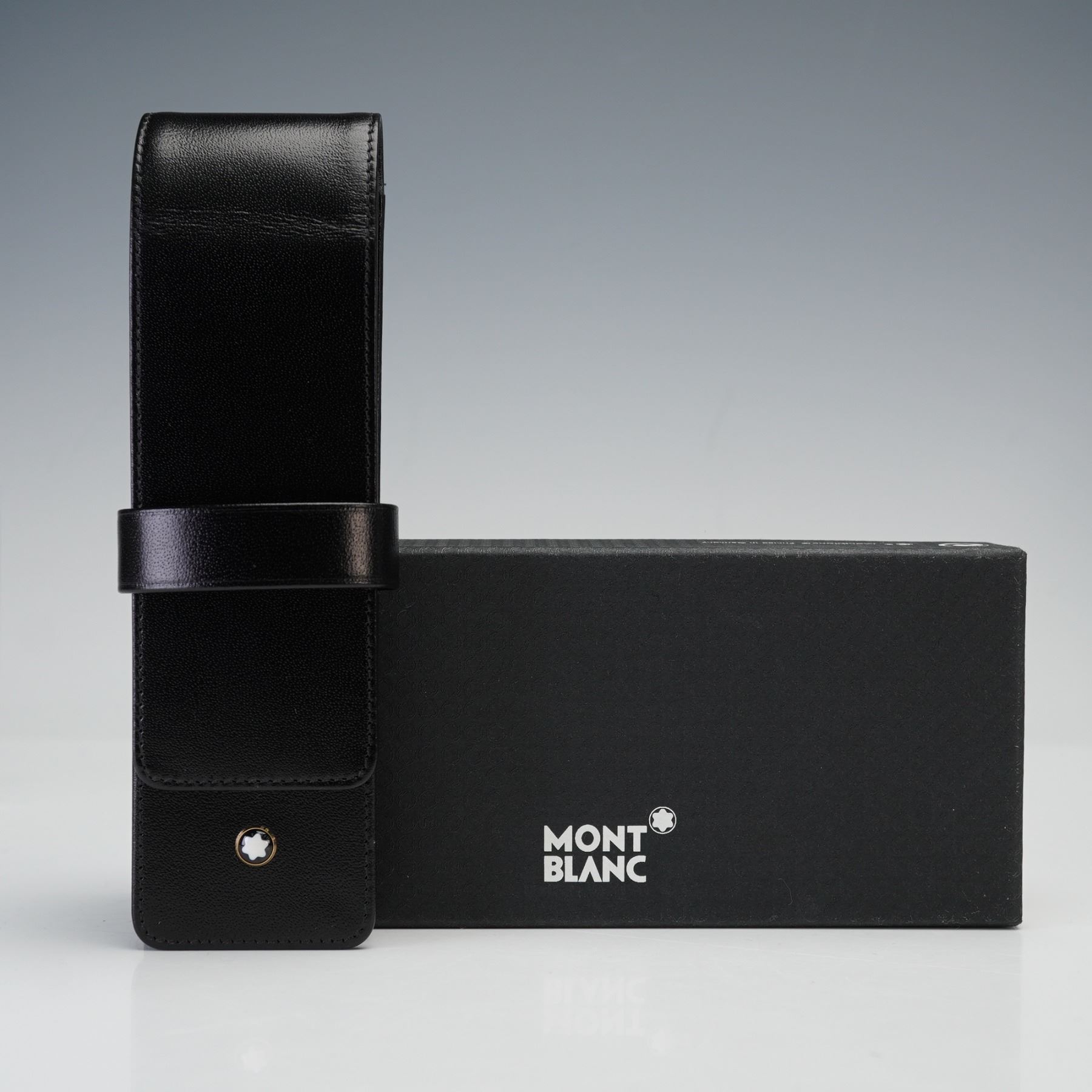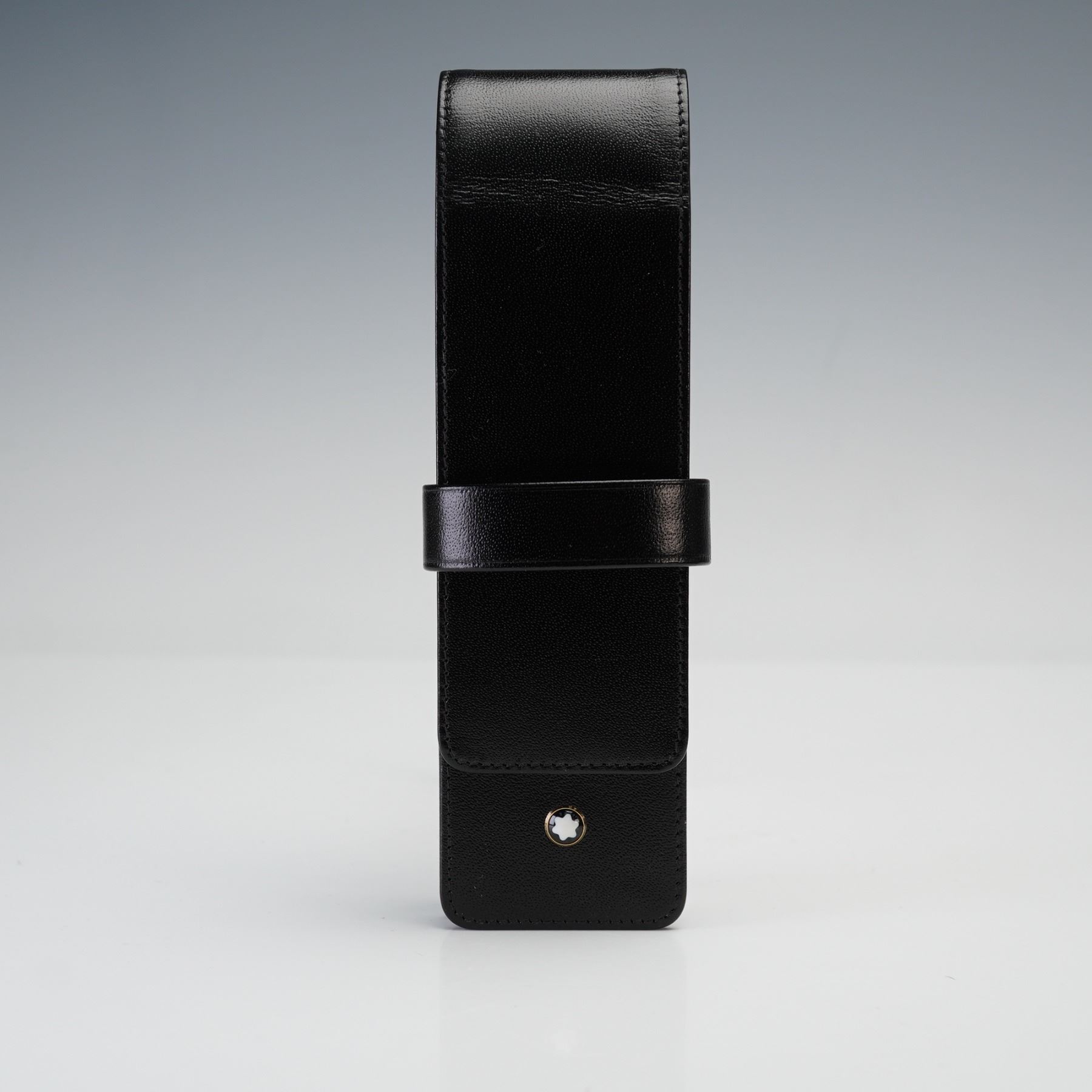 Smooth black leather featuring the brand's signature white star emblem set in a gilt ring on the front flap. The case opens to a dual compartment designed to hold writing instruments securely, with a fitted strap closure ensuring protection and elegance in equal measure. Accompanied by the original Montblanc presentation box, this piece reflects the brand's timeless commitment to luxury craftsmanship and understated design.