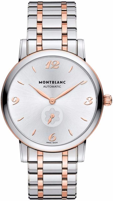 Model: 107916 - CASE = [Material:Stainless Steel and Rose Gold], [Case Diameter:39], [Case Thickness:8.9mm], [Bezel:Fixed], [Case Back:Skeleton], [Water Resistant:30 Meters - 100 Feet], [Crystal:Scratch Resistant Sapphire],; DIAL = [Color:Silvery-white with Rose Gold Platd Numerals and Indexes],; MOVEMENT = [Type:Automatic, 42 Hour Power Reserve], [Crown:Push In],; BAND = [Clasp:Folding], [Type:Stainless Steel and Rose Gold], (Usually ships in 1 to 2 weeks.)