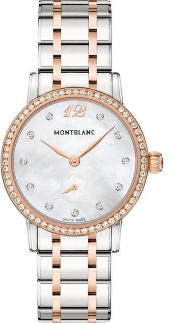 Model: 110643 - CASE = [Material:Rose Gold and Stainless Steel], [Case Diameter:30], [Case Thickness:7.36mm], [Bezel:Fixed], [Case Back:Solid], [Water Resistant:30 Meters - 100 Feet], [Crystal:Scratch Resistant Sapphire], DIAL = [Color:Mother of Pearl], MOVEMENT = [Type:Quartz], [Crown:Push In], BAND = [Clasp:Folding], [Type:Stainless Steel and Rose Gold], (Usually ships in 1 to 2 weeks.)