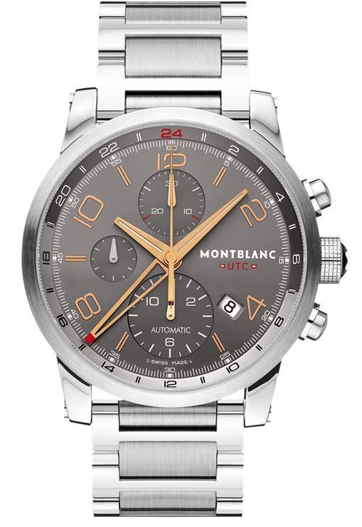 Model: 107303 - CASE = [Material:Stainless Steel], [Case Diameter:43], [Case Thickness:14.80mm], [Bezel:Fixed], [Case Back:See-thru Sapphire crystal], [Water Resistant:30 Meters/100 Feet], [Crystal:Scratch Resistant Sapphire], DIAL = [Color:Grey Chronograph with Rose Gold Finish Hands and Markers, Date Between 4 and 5], MOVEMENT = [Type:Automatic Self Winding Montblanc Calibre 4810/503], BAND = [Clasp:Triple Folding Clasp], [Type:Brushed and Polished Stainless Steel], (Usually ships in 1 to 2 weeks.)