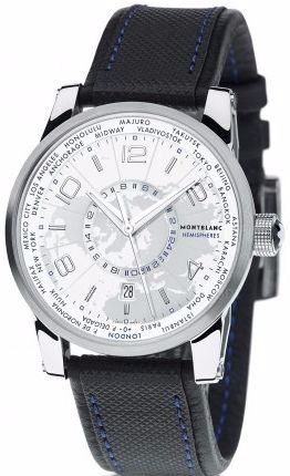 Model: 108955 - CASE = [Material:Stainless Steel], [Case Diameter:42], [Case Thickness:12.05mm], [Case Back:See-thru Sapphire crystal], [Water Resistant:30 Meters/100 Feet], [Crystal:Scratch Resistant Sapphire],; DIAL = [Color:Silver showing the northern hemisphere],; MOVEMENT = [Type:Automatic Self Winding Montblanc Calibre 4810/410],; BAND = [Clasp:Tang Buckle], [Type:Black Embossed Calfskin with Light Blue Stitching Leather], (Usually ships in 1 to 2 weeks.)