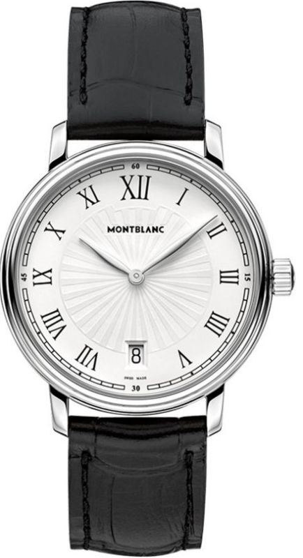 Model: 112635 - CASE = [Material:Stainless Steel], [Case Diameter:37], [Case Thickness:6.60mm], [Bezel:Fixed], [Case Back:Solid], [Water Resistant:30 Meters - 100 Feet], [Crystal:Scratch Resistant Sapphire], DIAL = [Color:Silver], MOVEMENT = [Type:Battery Operated Quartz], [Crown:Push In], BAND = [Clasp:Folding], [Type:Black Alligator Leather], (Usually ships in 1 to 2 weeks.)