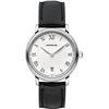 Model: 112635 - CASE = [Material:Stainless Steel], [Case Diameter:37], [Case Thickness:6.60mm], [Bezel:Fixed], [Case Back:Solid], [Water Resistant:30 Meters - 100 Feet], [Crystal:Scratch Resistant Sapphire], DIAL = [Color:Silver], MOVEMENT = [Type:Battery Operated Quartz], [Crown:Push In], BAND = [Clasp:Folding], [Type:Black Alligator Leather], (Usually ships in 1 to 2 weeks.)