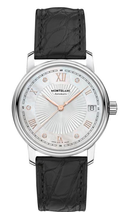 Model: 114957 - CASE = [Material:Stainless Steel], [Case Diameter:37], [Case Thickness:8.50mm], [Bezel:Fixed], [Case Back:Solid], [Water Resistant:30 Meters - 100 Feet], [Crystal:Scratch Resistant Sapphire],; DIAL = [Color:Mother of Pearl],; MOVEMENT = [Type:Automatic, 38 Hour Power Reserve], [Crown:Push In],; BAND = [Clasp:Folding], [Type:Black Alligator Leather], (Usually ships in 1 to 2 weeks.)