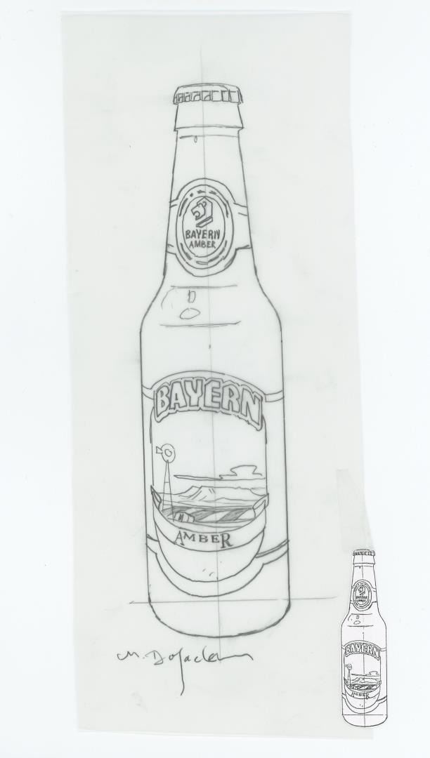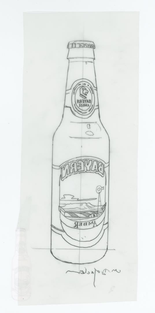 A concept sketch of the bottle for Bayern's Amber Beer. 10 1/4" by 4 1/4" Monte Dolack (Born 1950) is active/lives in Montana. Monte Dolack is known for Poster illustration, landscape and wildlife painting. A native of Great Falls, Monte Dolack grew up surrounded by the same sweeping vistas and big sky that inspired Charlie Russell. His love of Montana and passion for the West's diverse landscapes and wildlife are evident in the images he creates and the commissions he undertakes. After studying art at Montana State University and The University of Montana, Monte opened his first studio in 1974, beginning a career in fine art and graphics. His best known early works - wild animals wreaking havoc in human homes - comprise his Invaders Series, exploring the myths of the West and how we view our relationship with our environment. The irresistible appeal of these images helped build Monte's national reputation and continues to attract collectors. Monte has been the recipient of a number of prestigious awards in the course of his career, and his work is part of the collection of the Library of Congress, the American Association of Museums, the National Wildfire Foundation and numerous other museums and corporations. Recent exhibitions include The Montana Exhibition, Manawatu Art Museum, New Zealand; Artists of the American West, Bank of Ireland Arts Centre, Dublin, Ireland, and The Kumamoto Prefectural Art Museum, Kumamoto, Japan. Monte's work was chosen to be included in The North American Print Biennial, Boston, MA and New American Paintings, a Western States competition sponsored by the Open Studio Press as well as five major museums in China including the National Art Museum of Bejing, as part of the New West Exhibition. In 2011 he exhibited at the Palace of Nations at the United Nations, Geneva Switzerland. He was selected at the turn of the century by the Missoulian as one of the 100 most influential Montanans of the twentieth century and recently received the distinguished Fine Arts Alumni Award from the University of Montana along with his wife, Mary Beth Percival. A love of the natural world, combined with his exuberant curiosity and travel experiences, has shaped the content of Monte's imagery. Blending mythology, technology and elements from nature, his work is infused with a sense of humor and irony. Monte's keen interest in environmental issues has lead to commissions for the Nature Conservancy, Defenders of Wildlife and Trout Unlimited as well as over 200 posters and prints for various organizations. In addition to his acrylic, oil and watercolor painting, Monte continues to pursue his interest in traditional printmaking, having created numerous original lithographs. Since 1993, with his wife, Mary Beth Percival and staff, he operates a flourishing gallery in downtown Missoula. Monte and Mary Beth have traveled extensively in the US, Europe, Mexico, New Zealand and Japan, visiting important cultural sites and museums and making paintings from their travels.