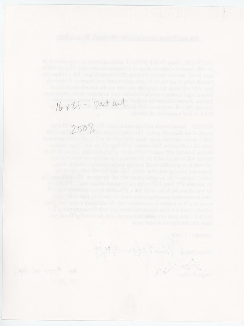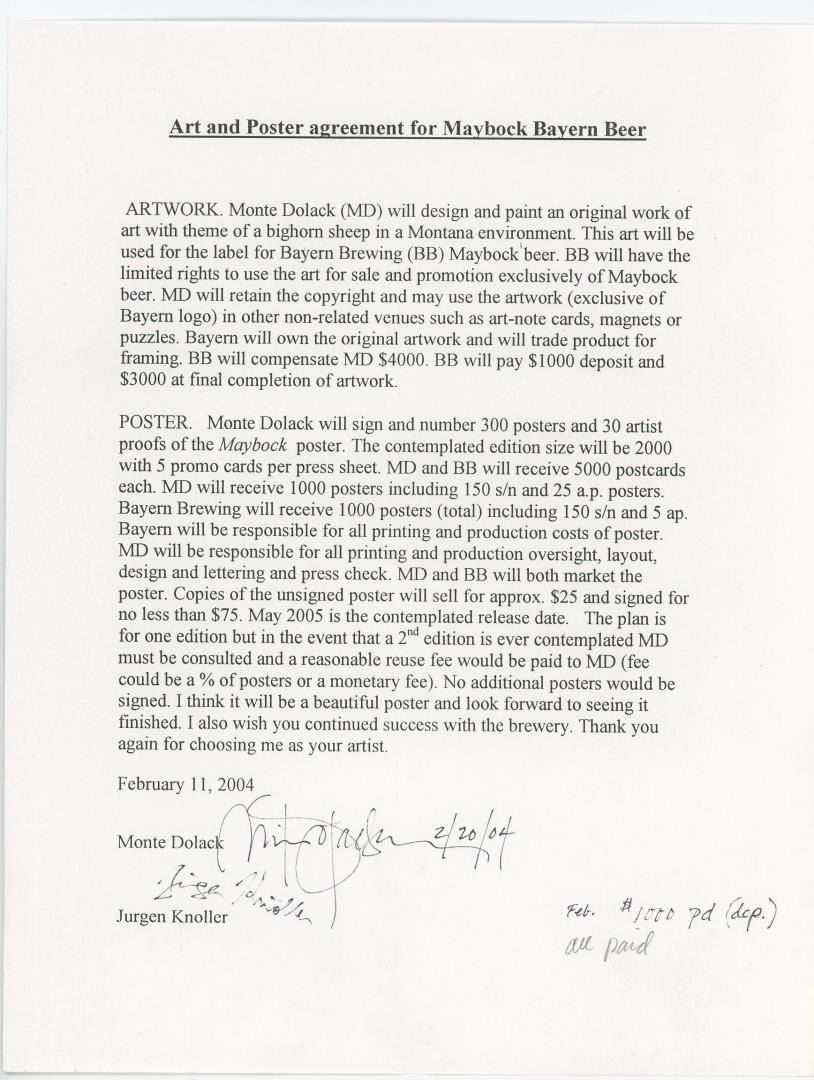 Signed agreement between the artist and Bayern Brewing of Missoula regarding a label for their Maibock beer. Included is a concept sketch of a Bighorn Sheep by the artist. While Bayern used a very similar sheep on their label, the poster deal never materialized. Sketch measures 8 1/4" by 6 7/8". Monte Dolack (Born 1950) is active/lives in Montana. Monte Dolack is known for Poster illustration, landscape and wildlife painting. A native of Great Falls, Monte Dolack grew up surrounded by the same sweeping vistas and big sky that inspired Charlie Russell. His love of Montana and passion for the West's diverse landscapes and wildlife are evident in the images he creates and the commissions he undertakes. After studying art at Montana State University and The University of Montana, Monte opened his first studio in 1974, beginning a career in fine art and graphics. His best known early works - wild animals wreaking havoc in human homes - comprise his Invaders Series, exploring the myths of the West and how we view our relationship with our environment. The irresistible appeal of these images helped build Monte's national reputation and continues to attract collectors. Monte has been the recipient of a number of prestigious awards in the course of his career, and his work is part of the collection of the Library of Congress, the American Association of Museums, the National Wildfire Foundation and numerous other museums and corporations. Recent exhibitions include The Montana Exhibition, Manawatu Art Museum, New Zealand; Artists of the American West, Bank of Ireland Arts Centre, Dublin, Ireland, and The Kumamoto Prefectural Art Museum, Kumamoto, Japan. Monte's work was chosen to be included in The North American Print Biennial, Boston, MA and New American Paintings, a Western States competition sponsored by the Open Studio Press as well as five major museums in China including the National Art Museum of Bejing, as part of the New West Exhibition. In 2011 he exhibited at the Palace of Nations at the United Nations, Geneva Switzerland. He was selected at the turn of the century by the Missoulian as one of the 100 most influential Montanans of the twentieth century and recently received the distinguished Fine Arts Alumni Award from the University of Montana along with his wife, Mary Beth Percival. A love of the natural world, combined with his exuberant curiosity and travel experiences, has shaped the content of Monte's imagery. Blending mythology, technology and elements from nature, his work is infused with a sense of humor and irony. Monte's keen interest in environmental issues has lead to commissions for the Nature Conservancy, Defenders of Wildlife and Trout Unlimited as well as over 200 posters and prints for various organizations. In addition to his acrylic, oil and watercolor painting, Monte continues to pursue his interest in traditional printmaking, having created numerous original lithographs. Since 1993, with his wife, Mary Beth Percival and staff, he operates a flourishing gallery in downtown Missoula. Monte and Mary Beth have traveled extensively in the US, Europe, Mexico, New Zealand and Japan, visiting important cultural sites and museums and making paintings from their travels.