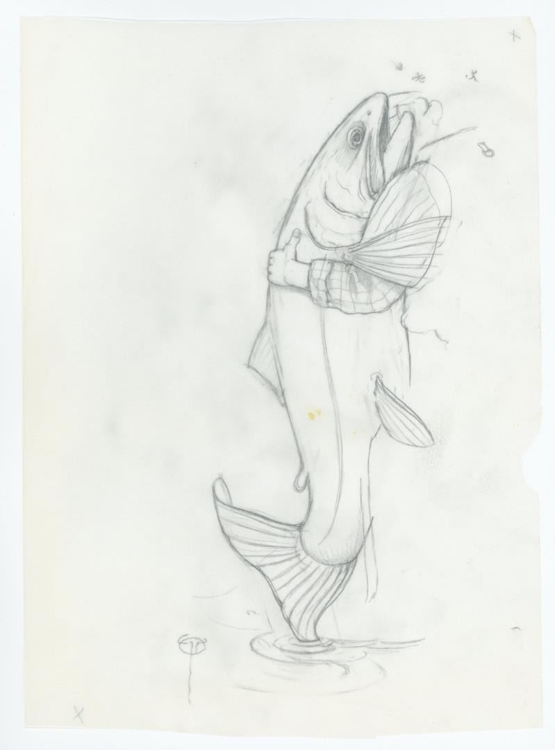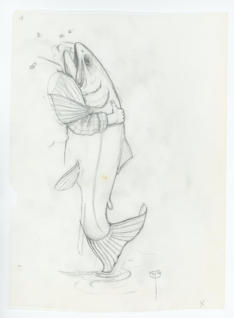 This study became the label and a poster for Bayern Brewing's Dancing Trout Beer. 10 5/8" by 7 5/8" Monte Dolack (Born 1950) is active/lives in Montana. Monte Dolack is known for Poster illustration, landscape and wildlife painting. A native of Great Falls, Monte Dolack grew up surrounded by the same sweeping vistas and big sky that inspired Charlie Russell. His love of Montana and passion for the West's diverse landscapes and wildlife are evident in the images he creates and the commissions he undertakes. After studying art at Montana State University and The University of Montana, Monte opened his first studio in 1974, beginning a career in fine art and graphics. His best known early works - wild animals wreaking havoc in human homes - comprise his Invaders Series, exploring the myths of the West and how we view our relationship with our environment. The irresistible appeal of these images helped build Monte's national reputation and continues to attract collectors. Monte has been the recipient of a number of prestigious awards in the course of his career, and his work is part of the collection of the Library of Congress, the American Association of Museums, the National Wildfire Foundation and numerous other museums and corporations. Recent exhibitions include The Montana Exhibition, Manawatu Art Museum, New Zealand; Artists of the American West, Bank of Ireland Arts Centre, Dublin, Ireland, and The Kumamoto Prefectural Art Museum, Kumamoto, Japan. Monte's work was chosen to be included in The North American Print Biennial, Boston, MA and New American Paintings, a Western States competition sponsored by the Open Studio Press as well as five major museums in China including the National Art Museum of Bejing, as part of the New West Exhibition. In 2011 he exhibited at the Palace of Nations at the United Nations, Geneva Switzerland. He was selected at the turn of the century by the Missoulian as one of the 100 most influential Montanans of the twentieth century and recently received the distinguished Fine Arts Alumni Award from the University of Montana along with his wife, Mary Beth Percival. A love of the natural world, combined with his exuberant curiosity and travel experiences, has shaped the content of Monte's imagery. Blending mythology, technology and elements from nature, his work is infused with a sense of humor and irony. Monte's keen interest in environmental issues has lead to commissions for the Nature Conservancy, Defenders of Wildlife and Trout Unlimited as well as over 200 posters and prints for various organizations. In addition to his acrylic, oil and watercolor painting, Monte continues to pursue his interest in traditional printmaking, having created numerous original lithographs. Since 1993, with his wife, Mary Beth Percival and staff, he operates a flourishing gallery in downtown Missoula. Monte and Mary Beth have traveled extensively in the US, Europe, Mexico, New Zealand and Japan, visiting important cultural sites and museums and making paintings from their travels.