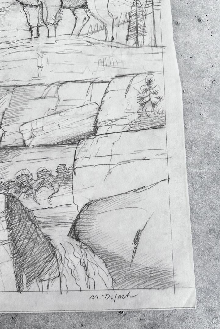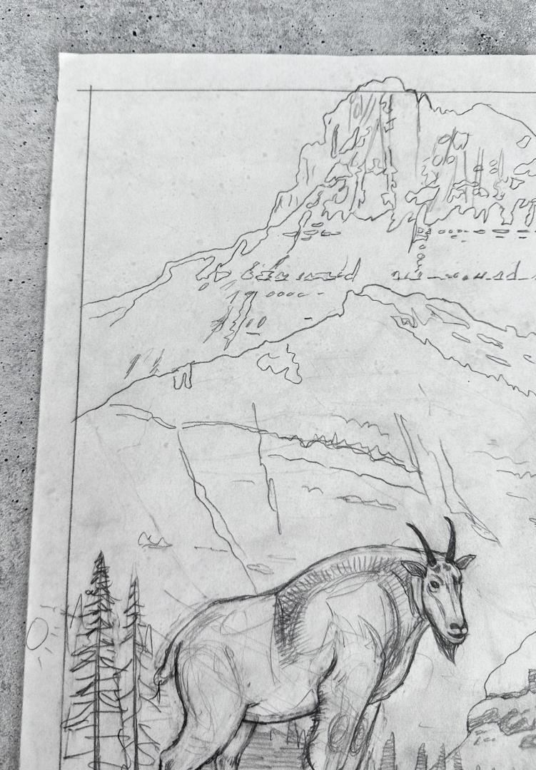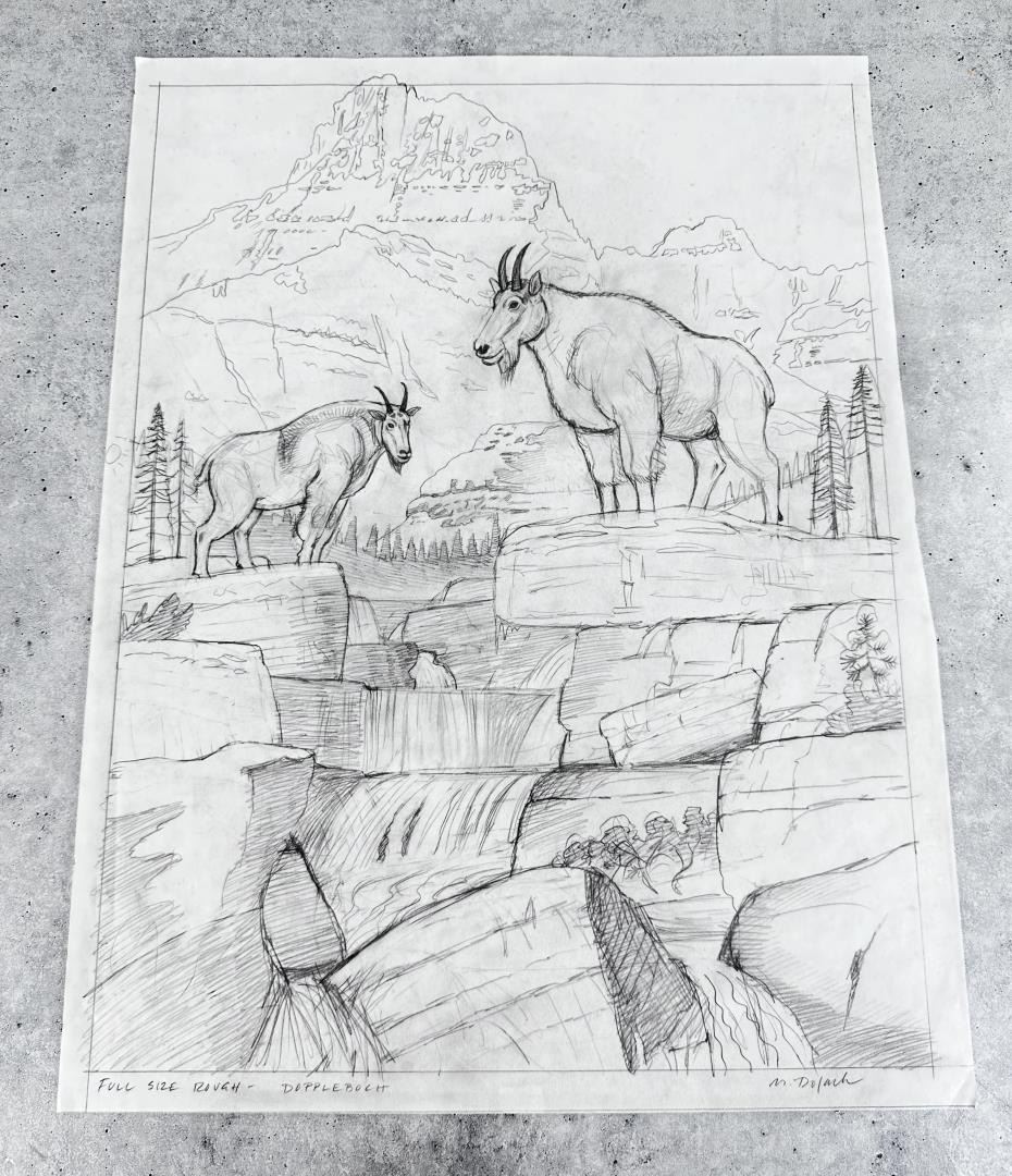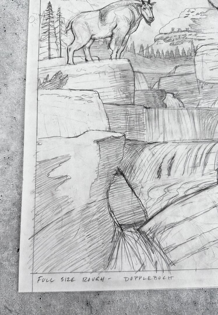 This is the final study before the Doppleboch Beer label was produced for Bayern Brewing in Missoula Montana. 17" by 22". An iconic piece of Montana Brewing History. Monte Dolack (Born 1950) is active/lives in Montana. Monte Dolack is known for Poster illustration, landscape and wildlife painting. A native of Great Falls, Monte Dolack grew up surrounded by the same sweeping vistas and big sky that inspired Charlie Russell. His love of Montana and passion for the West's diverse landscapes and wildlife are evident in the images he creates and the commissions he undertakes. After studying art at Montana State University and The University of Montana, Monte opened his first studio in 1974, beginning a career in fine art and graphics. His best known early works - wild animals wreaking havoc in human homes - comprise his Invaders Series, exploring the myths of the West and how we view our relationship with our environment. The irresistible appeal of these images helped build Monte's national reputation and continues to attract collectors. Monte has been the recipient of a number of prestigious awards in the course of his career, and his work is part of the collection of the Library of Congress, the American Association of Museums, the National Wildfire Foundation and numerous other museums and corporations. Recent exhibitions include The Montana Exhibition, Manawatu Art Museum, New Zealand; Artists of the American West, Bank of Ireland Arts Centre, Dublin, Ireland, and The Kumamoto Prefectural Art Museum, Kumamoto, Japan. Monte's work was chosen to be included in The North American Print Biennial, Boston, MA and New American Paintings, a Western States competition sponsored by the Open Studio Press as well as five major museums in China including the National Art Museum of Bejing, as part of the New West Exhibition. In 2011 he exhibited at the Palace of Nations at the United Nations, Geneva Switzerland. He was selected at the turn of the century by the Missoulian as one of the 100 most influential Montanans of the twentieth century and recently received the distinguished Fine Arts Alumni Award from the University of Montana along with his wife, Mary Beth Percival. A love of the natural world, combined with his exuberant curiosity and travel experiences, has shaped the content of Monte's imagery. Blending mythology, technology and elements from nature, his work is infused with a sense of humor and irony. Monte's keen interest in environmental issues has lead to commissions for the Nature Conservancy, Defenders of Wildlife and Trout Unlimited as well as over 200 posters and prints for various organizations. In addition to his acrylic, oil and watercolor painting, Monte continues to pursue his interest in traditional printmaking, having created numerous original lithographs. Since 1993, with his wife, Mary Beth Percival and staff, he operates a flourishing gallery in downtown Missoula. Monte and Mary Beth have traveled extensively in the US, Europe, Mexico, New Zealand and Japan, visiting important cultural sites and museums and making paintings from their travels.