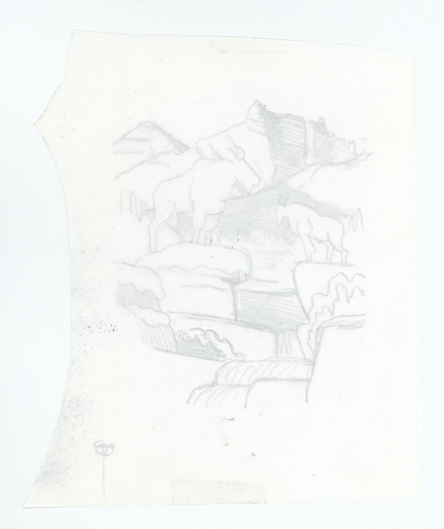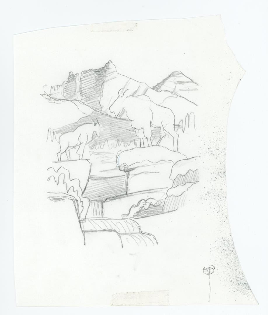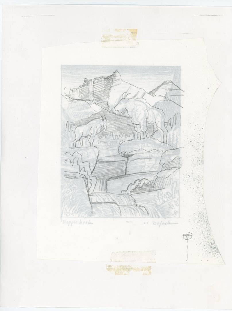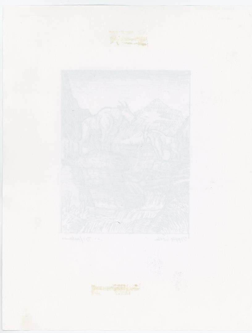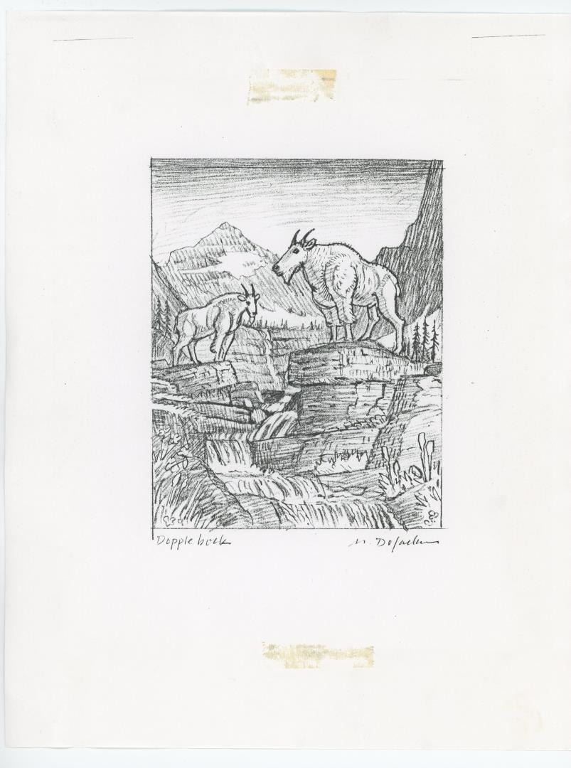 Lot includes an early sketch of the Doppelbock label for Bayern Brewing, and a photo copy of a later study. The artist used these photo copies to experiment with different color schemes. 8 1/8" by 6 3/4". Monte Dolack (Born 1950) is active/lives in Montana. Monte Dolack is known for Poster illustration, landscape and wildlife painting. A native of Great Falls, Monte Dolack grew up surrounded by the same sweeping vistas and big sky that inspired Charlie Russell. His love of Montana and passion for the West's diverse landscapes and wildlife are evident in the images he creates and the commissions he undertakes. After studying art at Montana State University and The University of Montana, Monte opened his first studio in 1974, beginning a career in fine art and graphics. His best known early works - wild animals wreaking havoc in human homes - comprise his Invaders Series, exploring the myths of the West and how we view our relationship with our environment. The irresistible appeal of these images helped build Monte's national reputation and continues to attract collectors. Monte has been the recipient of a number of prestigious awards in the course of his career, and his work is part of the collection of the Library of Congress, the American Association of Museums, the National Wildfire Foundation and numerous other museums and corporations. Recent exhibitions include The Montana Exhibition, Manawatu Art Museum, New Zealand; Artists of the American West, Bank of Ireland Arts Centre, Dublin, Ireland, and The Kumamoto Prefectural Art Museum, Kumamoto, Japan. Monte's work was chosen to be included in The North American Print Biennial, Boston, MA and New American Paintings, a Western States competition sponsored by the Open Studio Press as well as five major museums in China including the National Art Museum of Bejing, as part of the New West Exhibition. In 2011 he exhibited at the Palace of Nations at the United Nations, Geneva Switzerland. He was selected at the turn of the century by the Missoulian as one of the 100 most influential Montanans of the twentieth century and recently received the distinguished Fine Arts Alumni Award from the University of Montana along with his wife, Mary Beth Percival. A love of the natural world, combined with his exuberant curiosity and travel experiences, has shaped the content of Monte's imagery. Blending mythology, technology and elements from nature, his work is infused with a sense of humor and irony. Monte's keen interest in environmental issues has lead to commissions for the Nature Conservancy, Defenders of Wildlife and Trout Unlimited as well as over 200 posters and prints for various organizations. In addition to his acrylic, oil and watercolor painting, Monte continues to pursue his interest in traditional printmaking, having created numerous original lithographs. Since 1993, with his wife, Mary Beth Percival and staff, he operates a flourishing gallery in downtown Missoula. Monte and Mary Beth have traveled extensively in the US, Europe, Mexico, New Zealand and Japan, visiting important cultural sites and museums and making paintings from their travels.