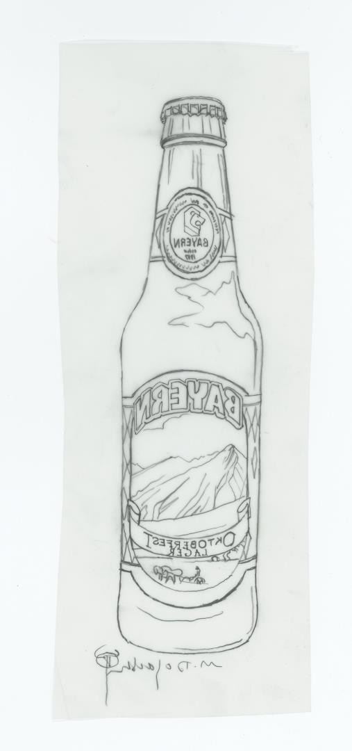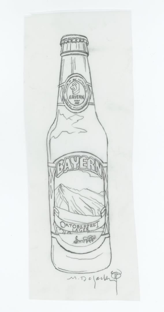 A concept sketch of the bottle for Bayern's Oktoberfest Lager Beer. 9 1/2" by 3 1/2". Monte Dolack (Born 1950) is active/lives in Montana. Monte Dolack is known for Poster illustration, landscape and wildlife painting. A native of Great Falls, Monte Dolack grew up surrounded by the same sweeping vistas and big sky that inspired Charlie Russell. His love of Montana and passion for the West's diverse landscapes and wildlife are evident in the images he creates and the commissions he undertakes. After studying art at Montana State University and The University of Montana, Monte opened his first studio in 1974, beginning a career in fine art and graphics. His best known early works - wild animals wreaking havoc in human homes - comprise his Invaders Series, exploring the myths of the West and how we view our relationship with our environment. The irresistible appeal of these images helped build Monte's national reputation and continues to attract collectors. Monte has been the recipient of a number of prestigious awards in the course of his career, and his work is part of the collection of the Library of Congress, the American Association of Museums, the National Wildfire Foundation and numerous other museums and corporations. Recent exhibitions include The Montana Exhibition, Manawatu Art Museum, New Zealand; Artists of the American West, Bank of Ireland Arts Centre, Dublin, Ireland, and The Kumamoto Prefectural Art Museum, Kumamoto, Japan. Monte's work was chosen to be included in The North American Print Biennial, Boston, MA and New American Paintings, a Western States competition sponsored by the Open Studio Press as well as five major museums in China including the National Art Museum of Bejing, as part of the New West Exhibition. In 2011 he exhibited at the Palace of Nations at the United Nations, Geneva Switzerland. He was selected at the turn of the century by the Missoulian as one of the 100 most influential Montanans of the twentieth century and recently received the distinguished Fine Arts Alumni Award from the University of Montana along with his wife, Mary Beth Percival. A love of the natural world, combined with his exuberant curiosity and travel experiences, has shaped the content of Monte's imagery. Blending mythology, technology and elements from nature, his work is infused with a sense of humor and irony. Monte's keen interest in environmental issues has lead to commissions for the Nature Conservancy, Defenders of Wildlife and Trout Unlimited as well as over 200 posters and prints for various organizations. In addition to his acrylic, oil and watercolor painting, Monte continues to pursue his interest in traditional printmaking, having created numerous original lithographs. Since 1993, with his wife, Mary Beth Percival and staff, he operates a flourishing gallery in downtown Missoula. Monte and Mary Beth have traveled extensively in the US, Europe, Mexico, New Zealand and Japan, visiting important cultural sites and museums and making paintings from their travels.