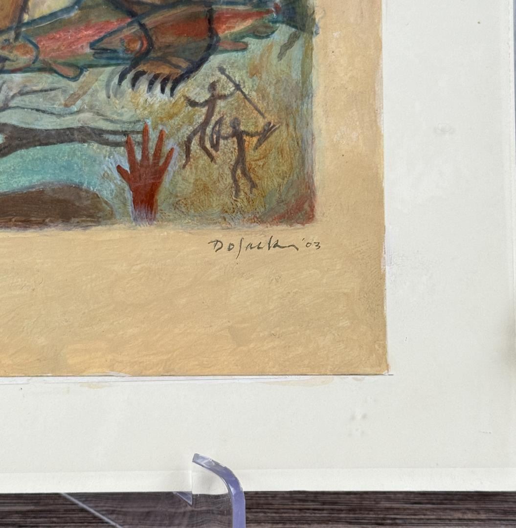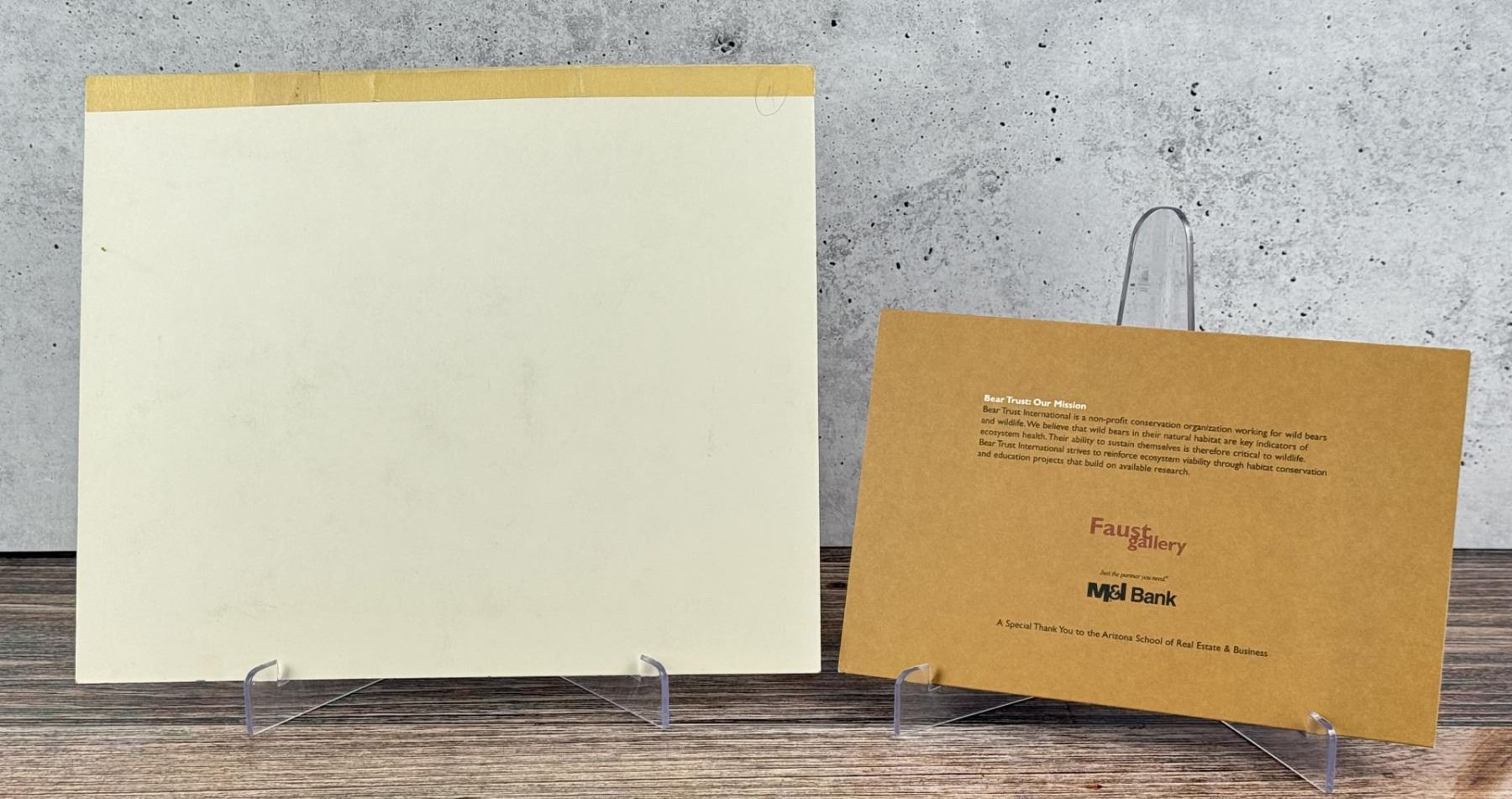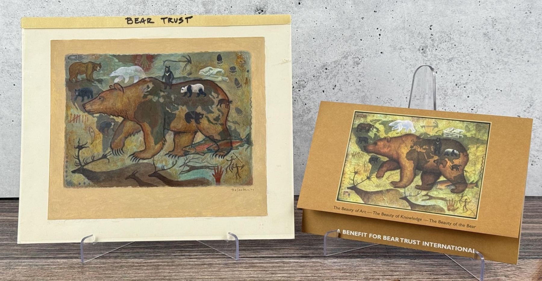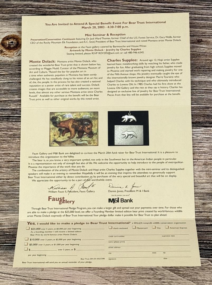 Very nice small study for the Bear Trust poster. Image size is 7 1/4" by 8 3/4". Lot includes a card from the Bear Trust International event. Monte Dolack (Born 1950) is active/lives in Montana. Monte Dolack is known for Poster illustration, landscape and wildlife painting. A native of Great Falls, Monte Dolack grew up surrounded by the same sweeping vistas and big sky that inspired Charlie Russell. His love of Montana and passion for the West's diverse landscapes and wildlife are evident in the images he creates and the commissions he undertakes. After studying art at Montana State University and The University of Montana, Monte opened his first studio in 1974, beginning a career in fine art and graphics. His best known early works - wild animals wreaking havoc in human homes - comprise his Invaders Series, exploring the myths of the West and how we view our relationship with our environment. The irresistible appeal of these images helped build Monte's national reputation and continues to attract collectors. Monte has been the recipient of a number of prestigious awards in the course of his career, and his work is part of the collection of the Library of Congress, the American Association of Museums, the National Wildfire Foundation and numerous other museums and corporations. Recent exhibitions include The Montana Exhibition, Manawatu Art Museum, New Zealand; Artists of the American West, Bank of Ireland Arts Centre, Dublin, Ireland, and The Kumamoto Prefectural Art Museum, Kumamoto, Japan. Monte's work was chosen to be included in The North American Print Biennial, Boston, MA and New American Paintings, a Western States competition sponsored by the Open Studio Press as well as five major museums in China including the National Art Museum of Bejing, as part of the New West Exhibition. In 2011 he exhibited at the Palace of Nations at the United Nations, Geneva Switzerland. He was selected at the turn of the century by the Missoulian as one of the 100 most influential Montanans of the twentieth century and recently received the distinguished Fine Arts Alumni Award from the University of Montana along with his wife, Mary Beth Percival. A love of the natural world, combined with his exuberant curiosity and travel experiences, has shaped the content of Monte's imagery. Blending mythology, technology and elements from nature, his work is infused with a sense of humor and irony. Monte's keen interest in environmental issues has lead to commissions for the Nature Conservancy, Defenders of Wildlife and Trout Unlimited as well as over 200 posters and prints for various organizations. In addition to his acrylic, oil and watercolor painting, Monte continues to pursue his interest in traditional printmaking, having created numerous original lithographs. Since 1993, with his wife, Mary Beth Percival and staff, he operates a flourishing gallery in downtown Missoula. Monte and Mary Beth have traveled extensively in the US, Europe, Mexico, New Zealand and Japan, visiting important cultural sites and museums and making paintings from their travels.