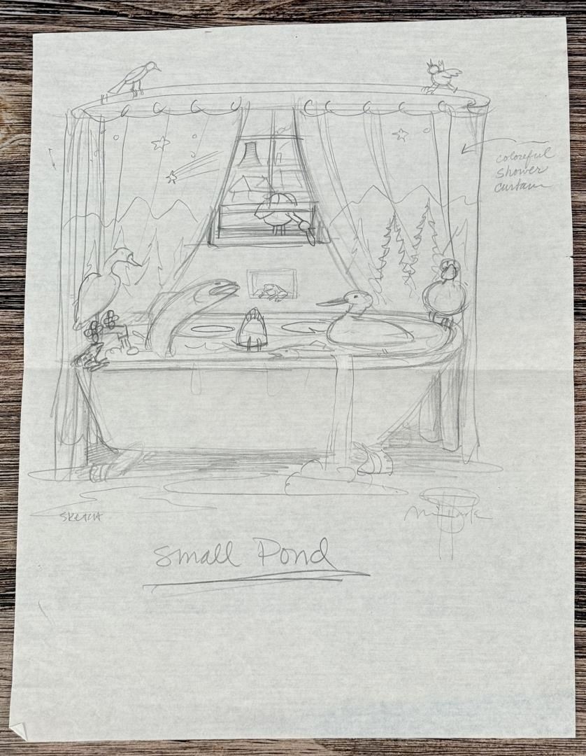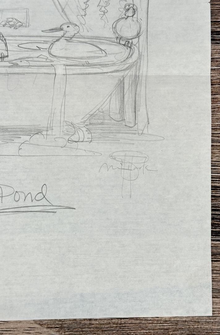 Very rough preliminary sketch for Big Fish Small Pond. 15.15" by 11 5/8" Monte Dolack (Born 1950) is active/lives in Montana. Monte Dolack is known for Poster illustration, landscape and wildlife painting. A native of Great Falls, Monte Dolack grew up surrounded by the same sweeping vistas and big sky that inspired Charlie Russell. His love of Montana and passion for the West's diverse landscapes and wildlife are evident in the images he creates and the commissions he undertakes. After studying art at Montana State University and The University of Montana, Monte opened his first studio in 1974, beginning a career in fine art and graphics. His best known early works - wild animals wreaking havoc in human homes - comprise his Invaders Series, exploring the myths of the West and how we view our relationship with our environment. The irresistible appeal of these images helped build Monte's national reputation and continues to attract collectors. Monte has been the recipient of a number of prestigious awards in the course of his career, and his work is part of the collection of the Library of Congress, the American Association of Museums, the National Wildfire Foundation and numerous other museums and corporations. Recent exhibitions include The Montana Exhibition, Manawatu Art Museum, New Zealand; Artists of the American West, Bank of Ireland Arts Centre, Dublin, Ireland, and The Kumamoto Prefectural Art Museum, Kumamoto, Japan. Monte's work was chosen to be included in The North American Print Biennial, Boston, MA and New American Paintings, a Western States competition sponsored by the Open Studio Press as well as five major museums in China including the National Art Museum of Bejing, as part of the New West Exhibition. In 2011 he exhibited at the Palace of Nations at the United Nations, Geneva Switzerland. He was selected at the turn of the century by the Missoulian as one of the 100 most influential Montanans of the twentieth century and recently received the distinguished Fine Arts Alumni Award from the University of Montana along with his wife, Mary Beth Percival. A love of the natural world, combined with his exuberant curiosity and travel experiences, has shaped the content of Monte's imagery. Blending mythology, technology and elements from nature, his work is infused with a sense of humor and irony. Monte's keen interest in environmental issues has lead to commissions for the Nature Conservancy, Defenders of Wildlife and Trout Unlimited as well as over 200 posters and prints for various organizations. In addition to his acrylic, oil and watercolor painting, Monte continues to pursue his interest in traditional printmaking, having created numerous original lithographs. Since 1993, with his wife, Mary Beth Percival and staff, he operates a flourishing gallery in downtown Missoula. Monte and Mary Beth have traveled extensively in the US, Europe, Mexico, New Zealand and Japan, visiting important cultural sites and museums and making paintings from their travels.