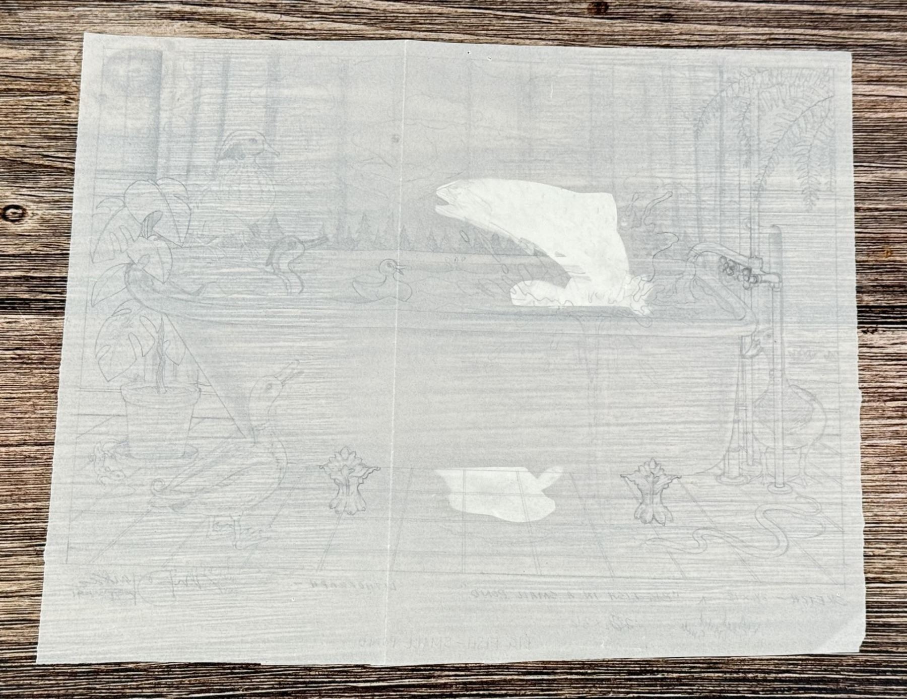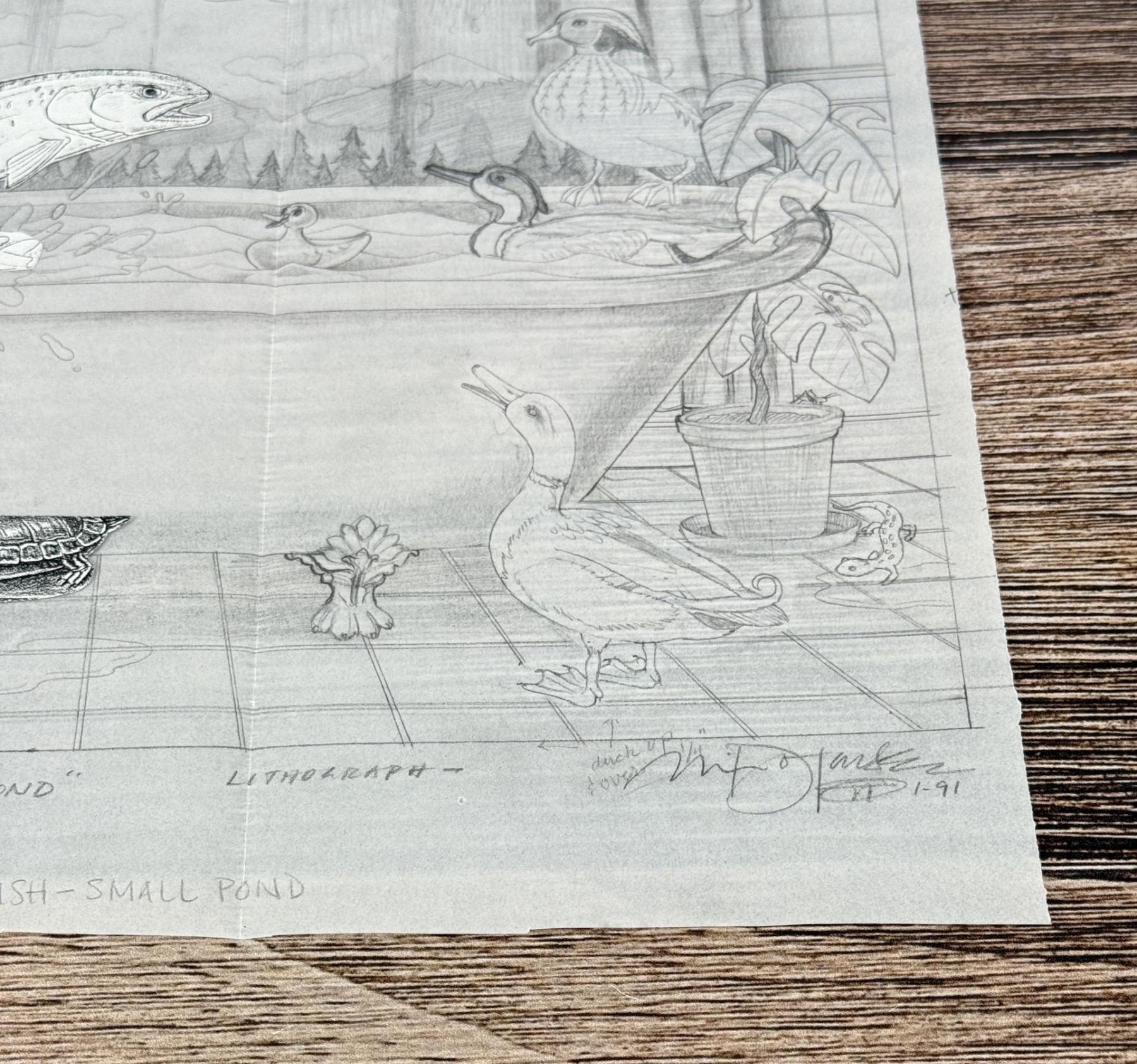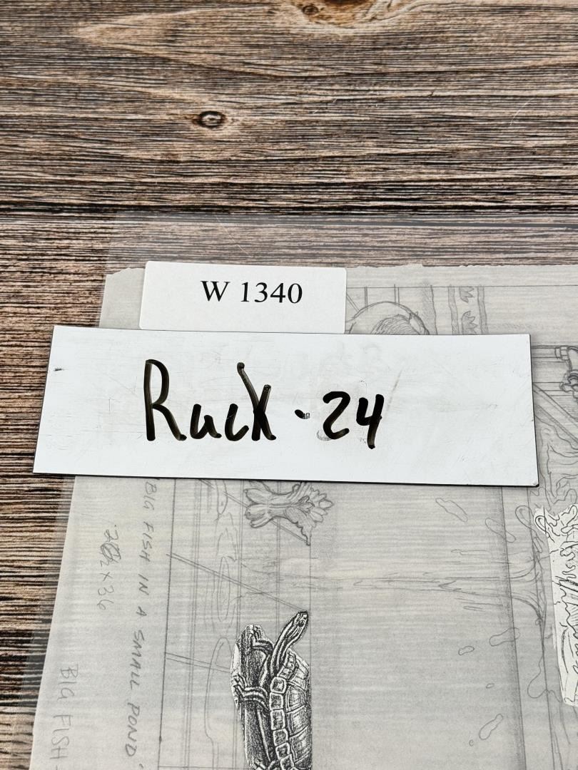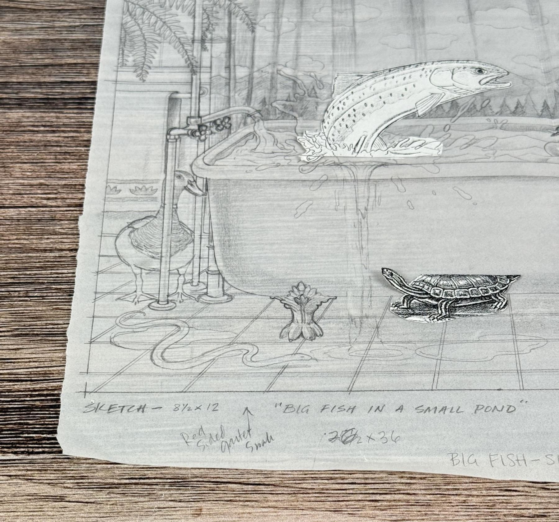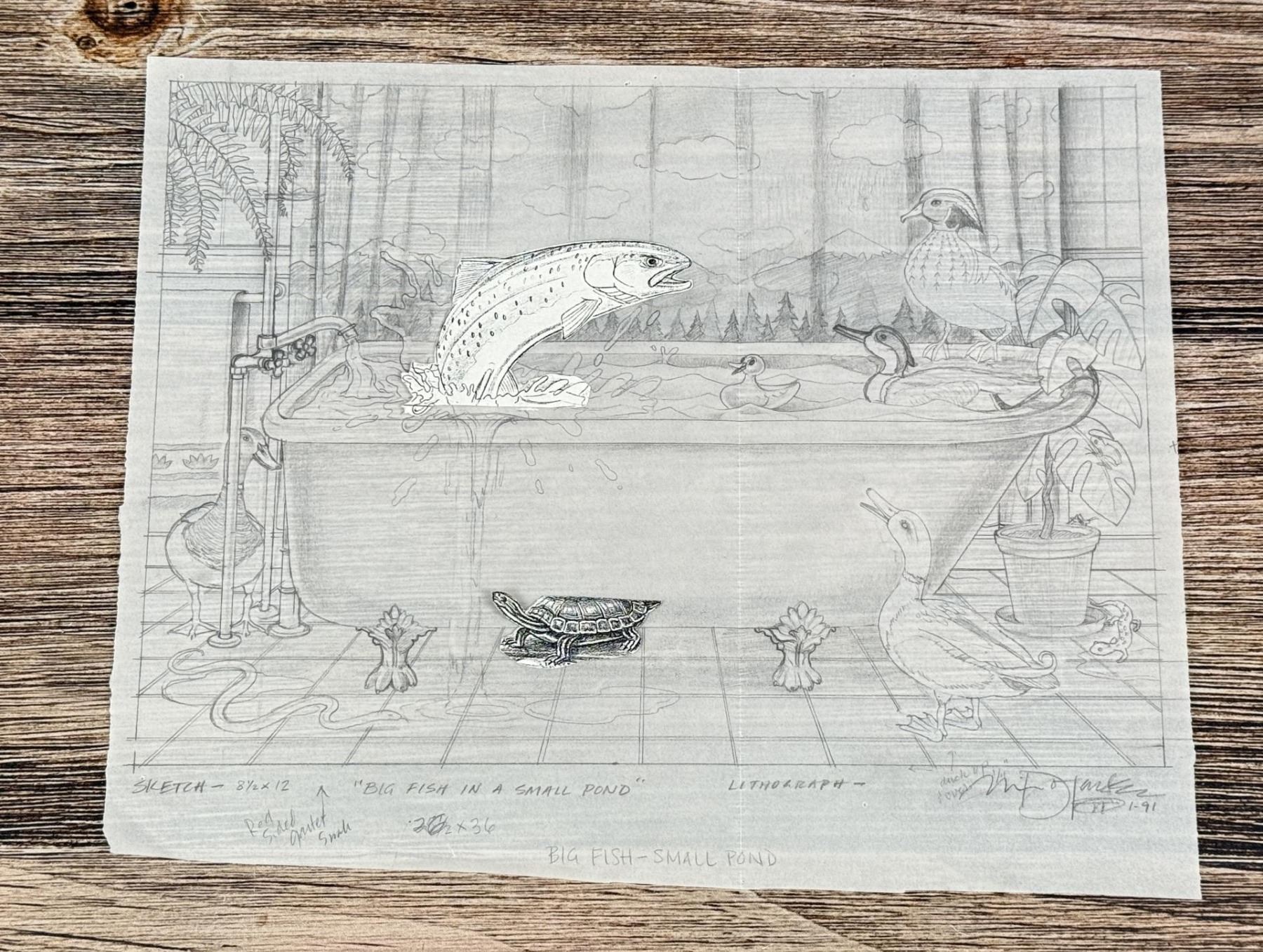 The working title for this one is Big Fish In a Small Pond. It became just Big Fish Small Pond. 12 3/4" by 10 1/4". Monte Dolack (Born 1950) is active/lives in Montana. Monte Dolack is known for Poster illustration, landscape and wildlife painting. A native of Great Falls, Monte Dolack grew up surrounded by the same sweeping vistas and big sky that inspired Charlie Russell. His love of Montana and passion for the West's diverse landscapes and wildlife are evident in the images he creates and the commissions he undertakes. After studying art at Montana State University and The University of Montana, Monte opened his first studio in 1974, beginning a career in fine art and graphics. His best known early works - wild animals wreaking havoc in human homes - comprise his Invaders Series, exploring the myths of the West and how we view our relationship with our environment. The irresistible appeal of these images helped build Monte's national reputation and continues to attract collectors. Monte has been the recipient of a number of prestigious awards in the course of his career, and his work is part of the collection of the Library of Congress, the American Association of Museums, the National Wildfire Foundation and numerous other museums and corporations. Recent exhibitions include The Montana Exhibition, Manawatu Art Museum, New Zealand; Artists of the American West, Bank of Ireland Arts Centre, Dublin, Ireland, and The Kumamoto Prefectural Art Museum, Kumamoto, Japan. Monte's work was chosen to be included in The North American Print Biennial, Boston, MA and New American Paintings, a Western States competition sponsored by the Open Studio Press as well as five major museums in China including the National Art Museum of Bejing, as part of the New West Exhibition. In 2011 he exhibited at the Palace of Nations at the United Nations, Geneva Switzerland. He was selected at the turn of the century by the Missoulian as one of the 100 most influential Montanans of the twentieth century and recently received the distinguished Fine Arts Alumni Award from the University of Montana along with his wife, Mary Beth Percival. A love of the natural world, combined with his exuberant curiosity and travel experiences, has shaped the content of Monte's imagery. Blending mythology, technology and elements from nature, his work is infused with a sense of humor and irony. Monte's keen interest in environmental issues has lead to commissions for the Nature Conservancy, Defenders of Wildlife and Trout Unlimited as well as over 200 posters and prints for various organizations. In addition to his acrylic, oil and watercolor painting, Monte continues to pursue his interest in traditional printmaking, having created numerous original lithographs. Since 1993, with his wife, Mary Beth Percival and staff, he operates a flourishing gallery in downtown Missoula. Monte and Mary Beth have traveled extensively in the US, Europe, Mexico, New Zealand and Japan, visiting important cultural sites and museums and making paintings from their travels.