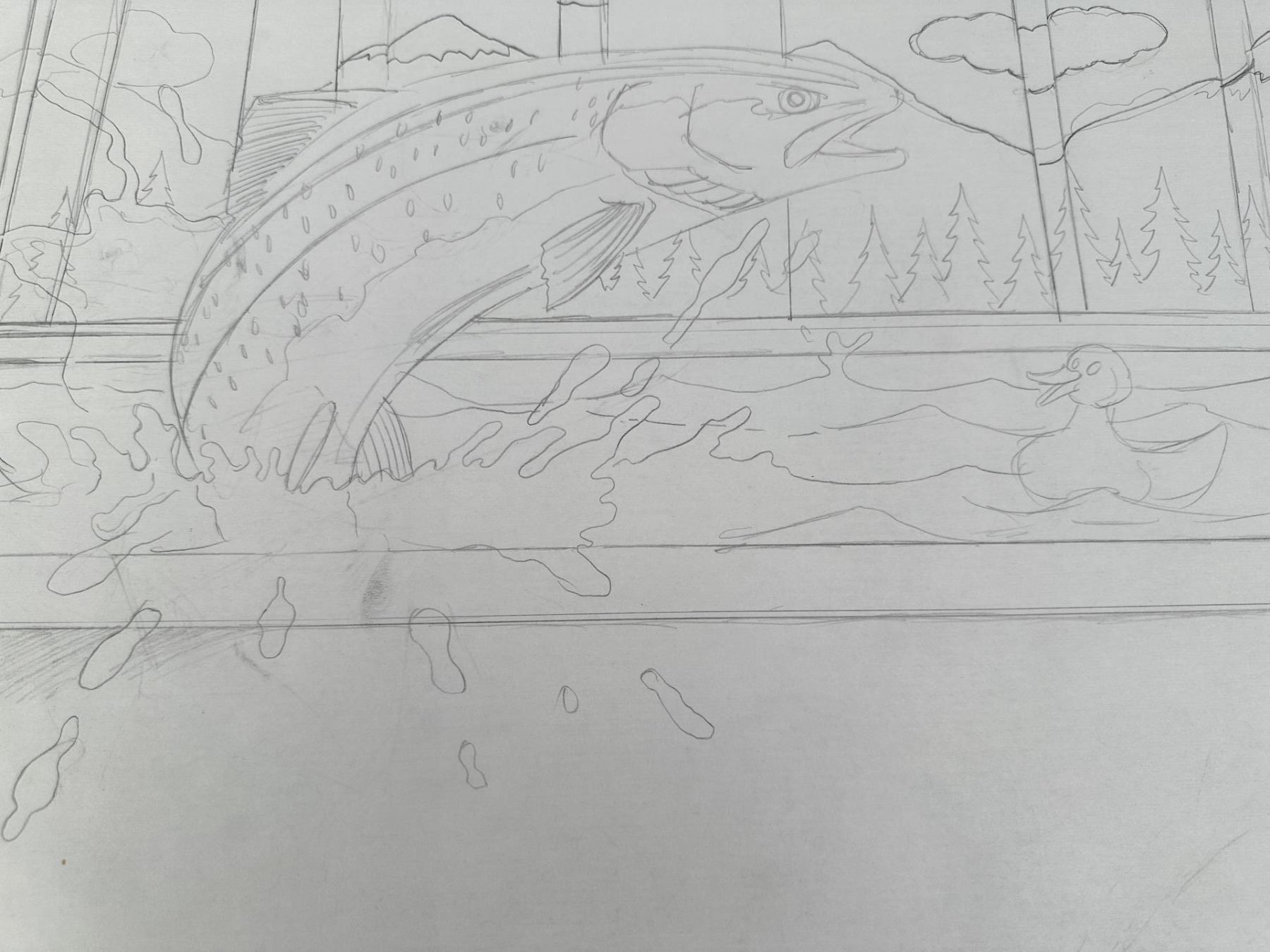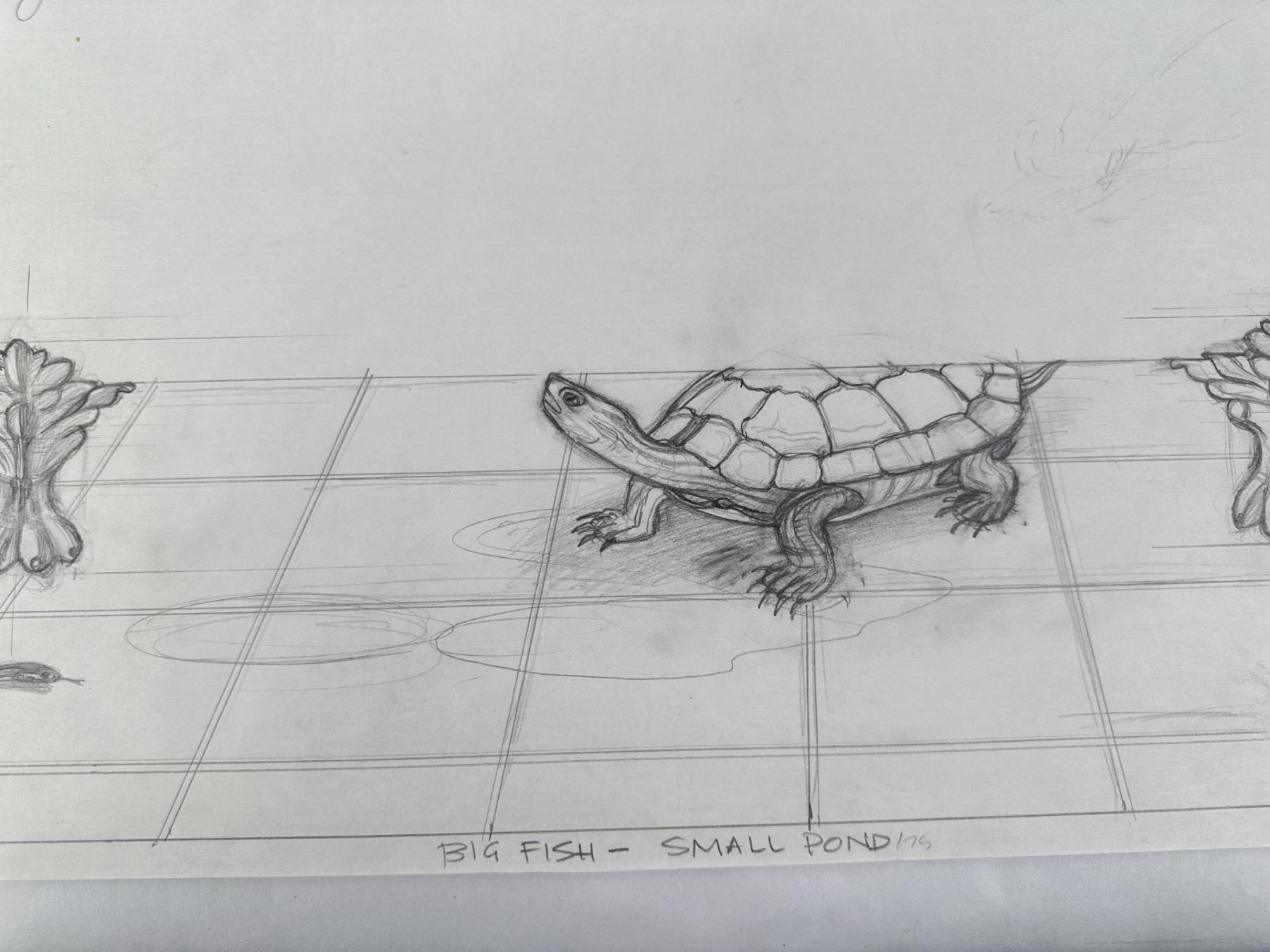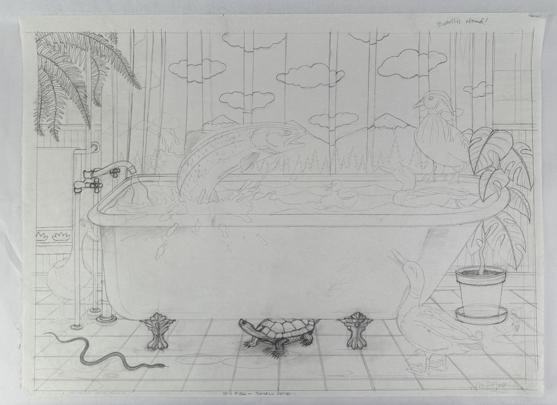 This is the Final Study produced before the Iconic Big Fish Small Pond Poster Was Printed. 28" by 38 1/2" Monte Dolack (Born 1950) is active/lives in Montana. Monte Dolack is known for Poster illustration, landscape and wildlife painting. A native of Great Falls, Monte Dolack grew up surrounded by the same sweeping vistas and big sky that inspired Charlie Russell. His love of Montana and passion for the West's diverse landscapes and wildlife are evident in the images he creates and the commissions he undertakes. After studying art at Montana State University and The University of Montana, Monte opened his first studio in 1974, beginning a career in fine art and graphics. His best known early works - wild animals wreaking havoc in human homes - comprise his Invaders Series, exploring the myths of the West and how we view our relationship with our environment. The irresistible appeal of these images helped build Monte's national reputation and continues to attract collectors. Monte has been the recipient of a number of prestigious awards in the course of his career, and his work is part of the collection of the Library of Congress, the American Association of Museums, the National Wildfire Foundation and numerous other museums and corporations. Recent exhibitions include The Montana Exhibition, Manawatu Art Museum, New Zealand; Artists of the American West, Bank of Ireland Arts Centre, Dublin, Ireland, and The Kumamoto Prefectural Art Museum, Kumamoto, Japan. Monte's work was chosen to be included in The North American Print Biennial, Boston, MA and New American Paintings, a Western States competition sponsored by the Open Studio Press as well as five major museums in China including the National Art Museum of Bejing, as part of the New West Exhibition. In 2011 he exhibited at the Palace of Nations at the United Nations, Geneva Switzerland. He was selected at the turn of the century by the Missoulian as one of the 100 most influential Montanans of the twentieth century and recently received the distinguished Fine Arts Alumni Award from the University of Montana along with his wife, Mary Beth Percival. A love of the natural world, combined with his exuberant curiosity and travel experiences, has shaped the content of Monte's imagery. Blending mythology, technology and elements from nature, his work is infused with a sense of humor and irony. Monte's keen interest in environmental issues has lead to commissions for the Nature Conservancy, Defenders of Wildlife and Trout Unlimited as well as over 200 posters and prints for various organizations. In addition to his acrylic, oil and watercolor painting, Monte continues to pursue his interest in traditional printmaking, having created numerous original lithographs. Since 1993, with his wife, Mary Beth Percival and staff, he operates a flourishing gallery in downtown Missoula. Monte and Mary Beth have traveled extensively in the US, Europe, Mexico, New Zealand and Japan, visiting important cultural sites and museums and making paintings from their travels.