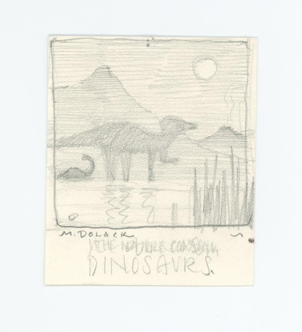 Very early concept sketch that became Dinosaurs Discoveries In Montana, The nature Conservancy, Egg mountain Preserve. 3 5/8" by 3" Monte Dolack (Born 1950) is active/lives in Montana. Monte Dolack is known for Poster illustration, landscape and wildlife painting. A native of Great Falls, Monte Dolack grew up surrounded by the same sweeping vistas and big sky that inspired Charlie Russell. His love of Montana and passion for the West's diverse landscapes and wildlife are evident in the images he creates and the commissions he undertakes. After studying art at Montana State University and The University of Montana, Monte opened his first studio in 1974, beginning a career in fine art and graphics. His best known early works - wild animals wreaking havoc in human homes - comprise his Invaders Series, exploring the myths of the West and how we view our relationship with our environment. The irresistible appeal of these images helped build Monte's national reputation and continues to attract collectors. Monte has been the recipient of a number of prestigious awards in the course of his career, and his work is part of the collection of the Library of Congress, the American Association of Museums, the National Wildfire Foundation and numerous other museums and corporations. Recent exhibitions include The Montana Exhibition, Manawatu Art Museum, New Zealand; Artists of the American West, Bank of Ireland Arts Centre, Dublin, Ireland, and The Kumamoto Prefectural Art Museum, Kumamoto, Japan. Monte's work was chosen to be included in The North American Print Biennial, Boston, MA and New American Paintings, a Western States competition sponsored by the Open Studio Press as well as five major museums in China including the National Art Museum of Bejing, as part of the New West Exhibition. In 2011 he exhibited at the Palace of Nations at the United Nations, Geneva Switzerland. He was selected at the turn of the century by the Missoulian as one of the 100 most influential Montanans of the twentieth century and recently received the distinguished Fine Arts Alumni Award from the University of Montana along with his wife, Mary Beth Percival. A love of the natural world, combined with his exuberant curiosity and travel experiences, has shaped the content of Monte's imagery. Blending mythology, technology and elements from nature, his work is infused with a sense of humor and irony. Monte's keen interest in environmental issues has lead to commissions for the Nature Conservancy, Defenders of Wildlife and Trout Unlimited as well as over 200 posters and prints for various organizations. In addition to his acrylic, oil and watercolor painting, Monte continues to pursue his interest in traditional printmaking, having created numerous original lithographs. Since 1993, with his wife, Mary Beth Percival and staff, he operates a flourishing gallery in downtown Missoula. Monte and Mary Beth have traveled extensively in the US, Europe, Mexico, New Zealand and Japan, visiting important cultural sites and museums and making paintings from their travels.